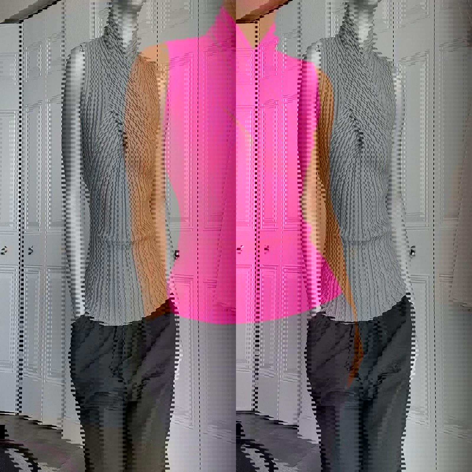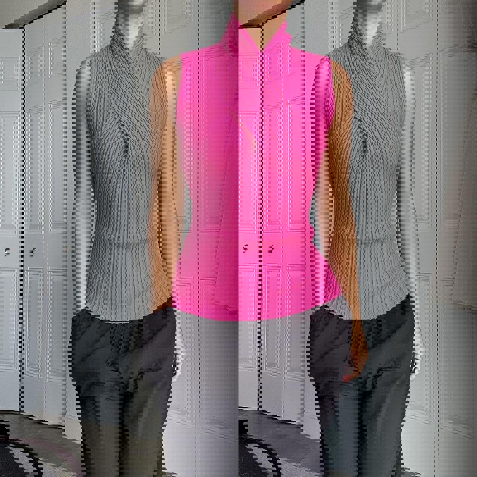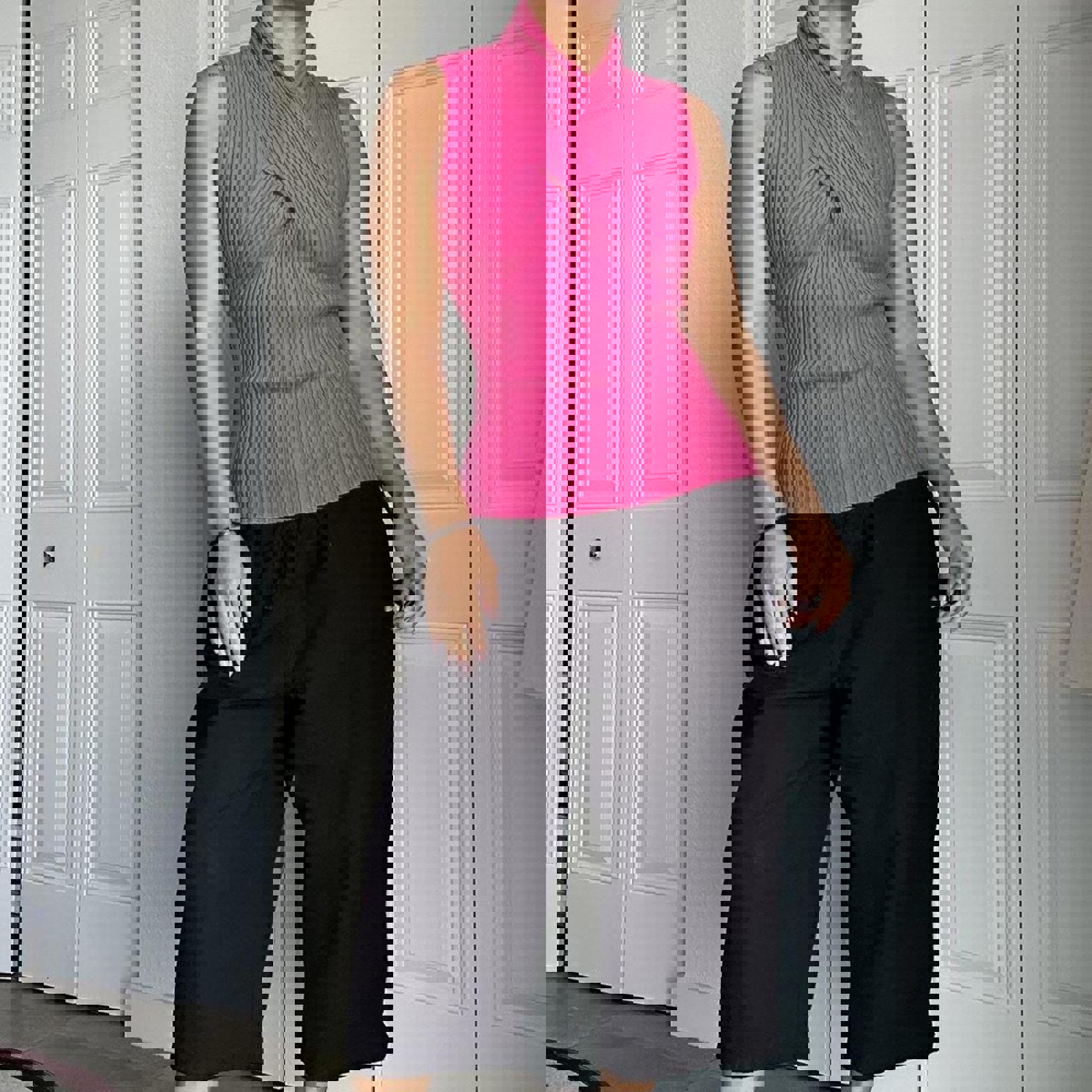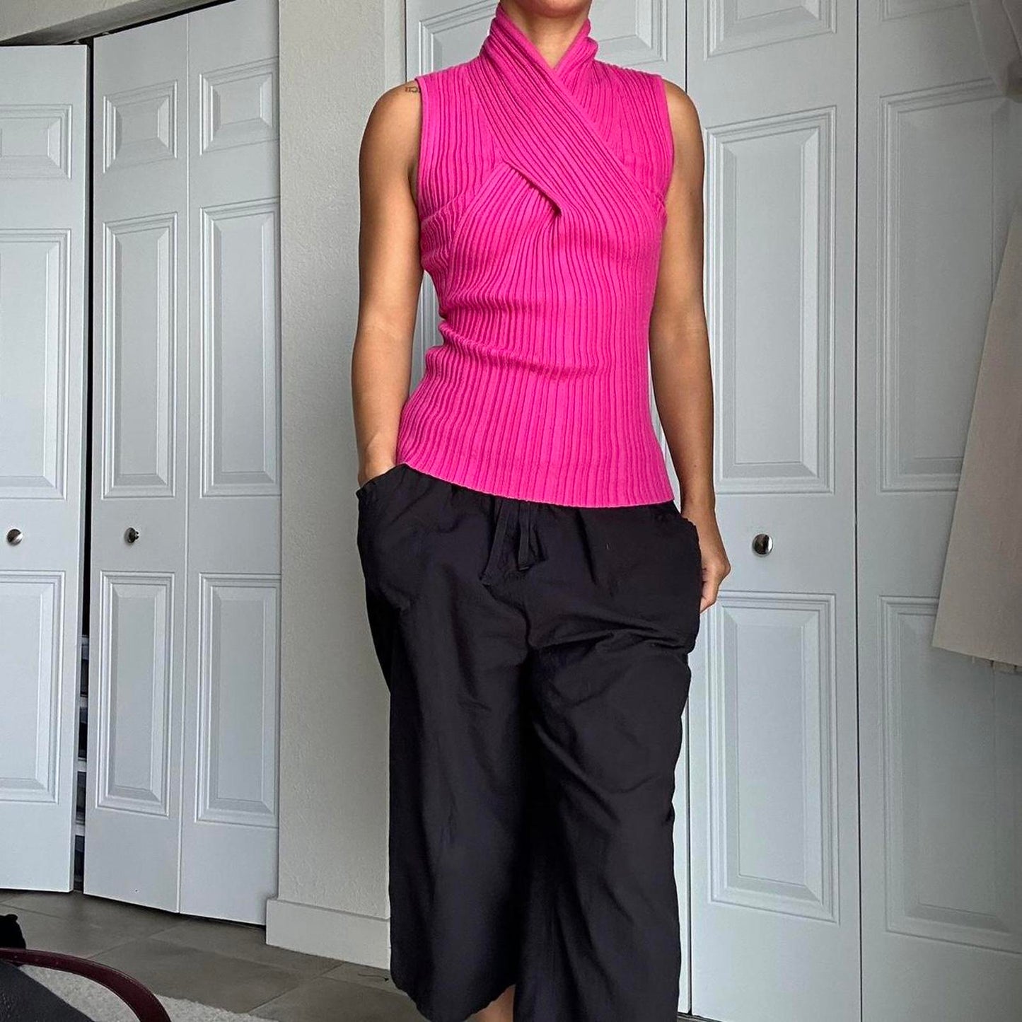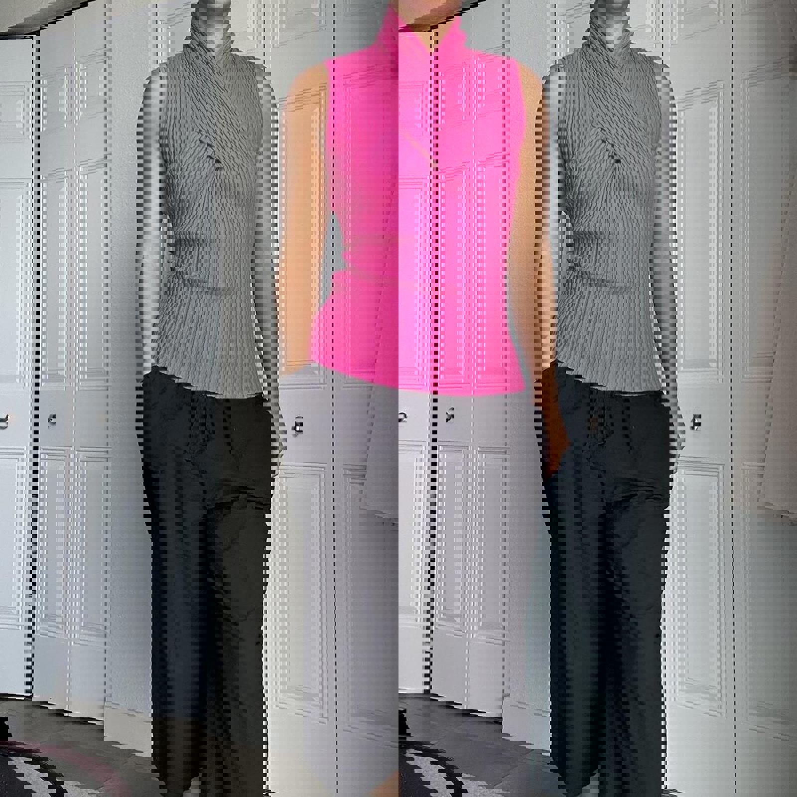 pink knit, wrap top, fitted, flattering, sleeveless, ribbed, modest, feminine, casual chic, soft texture