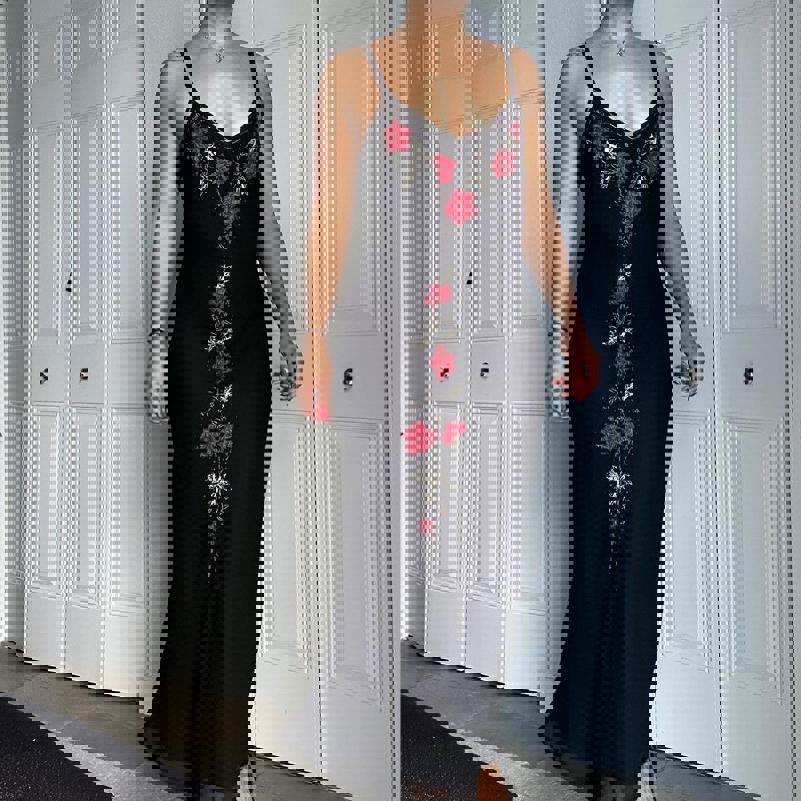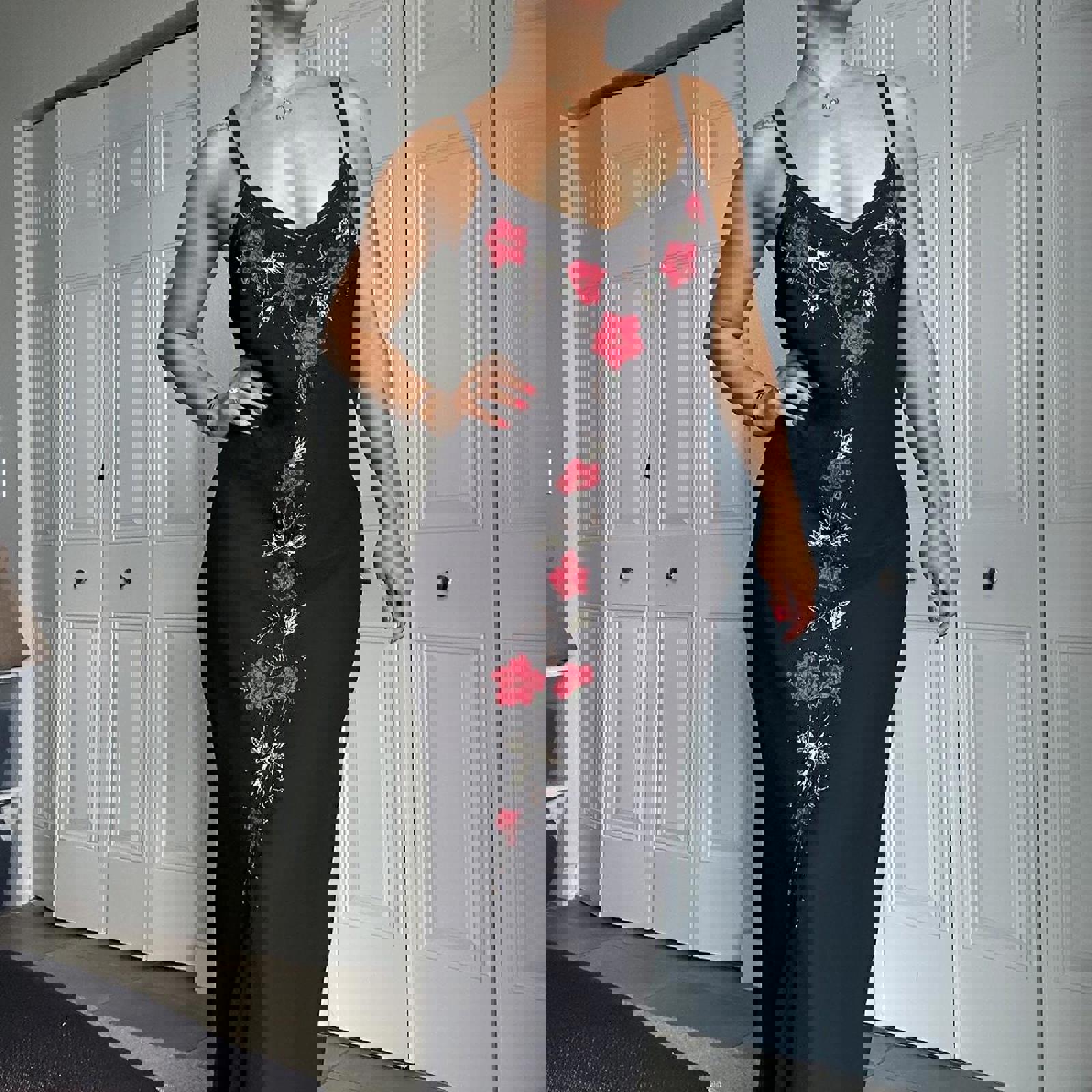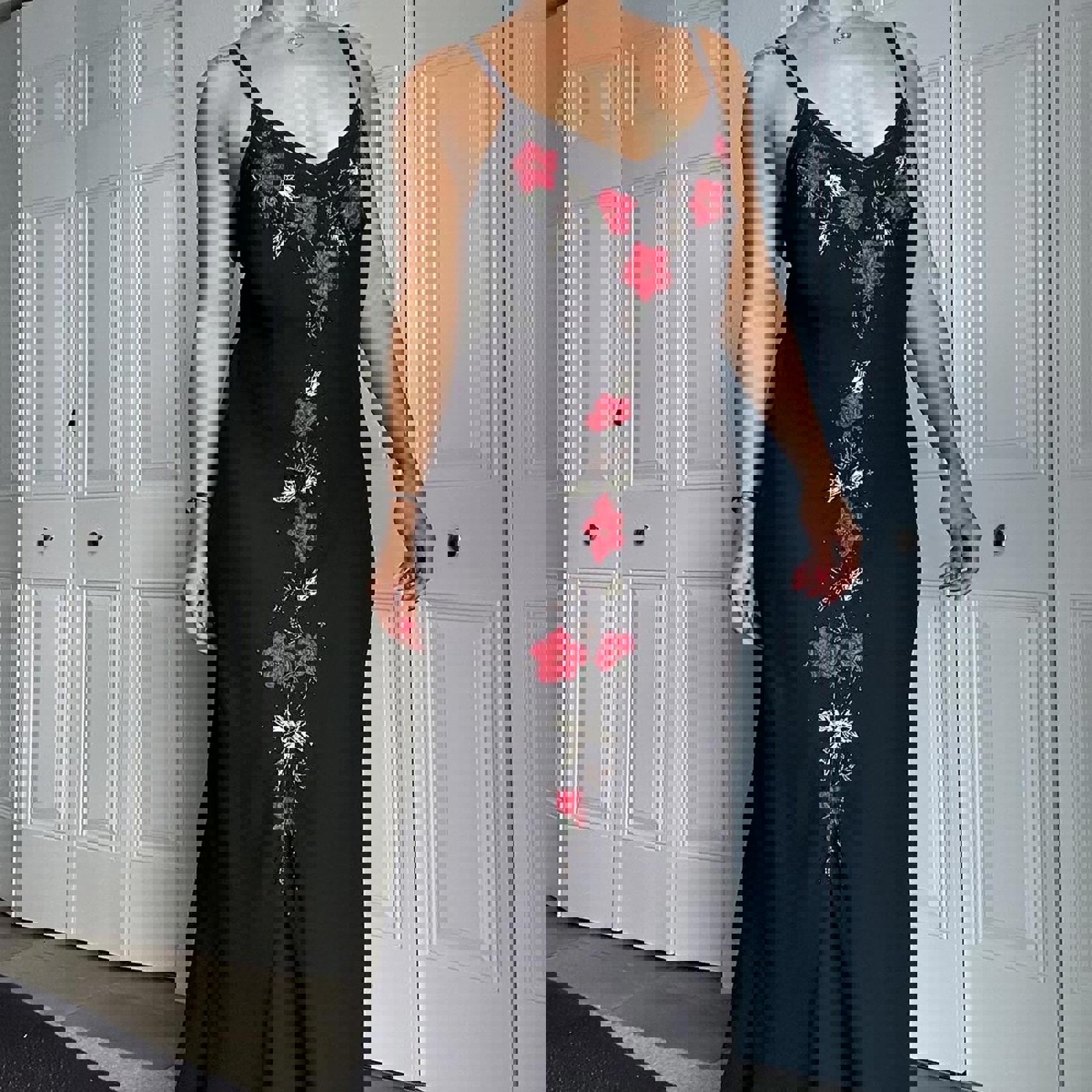 662. Votre Mode Black maxi dress with red floral embroidery and brown beading, featuring a V-neckline and spaghetti straps. #floral #embroidered