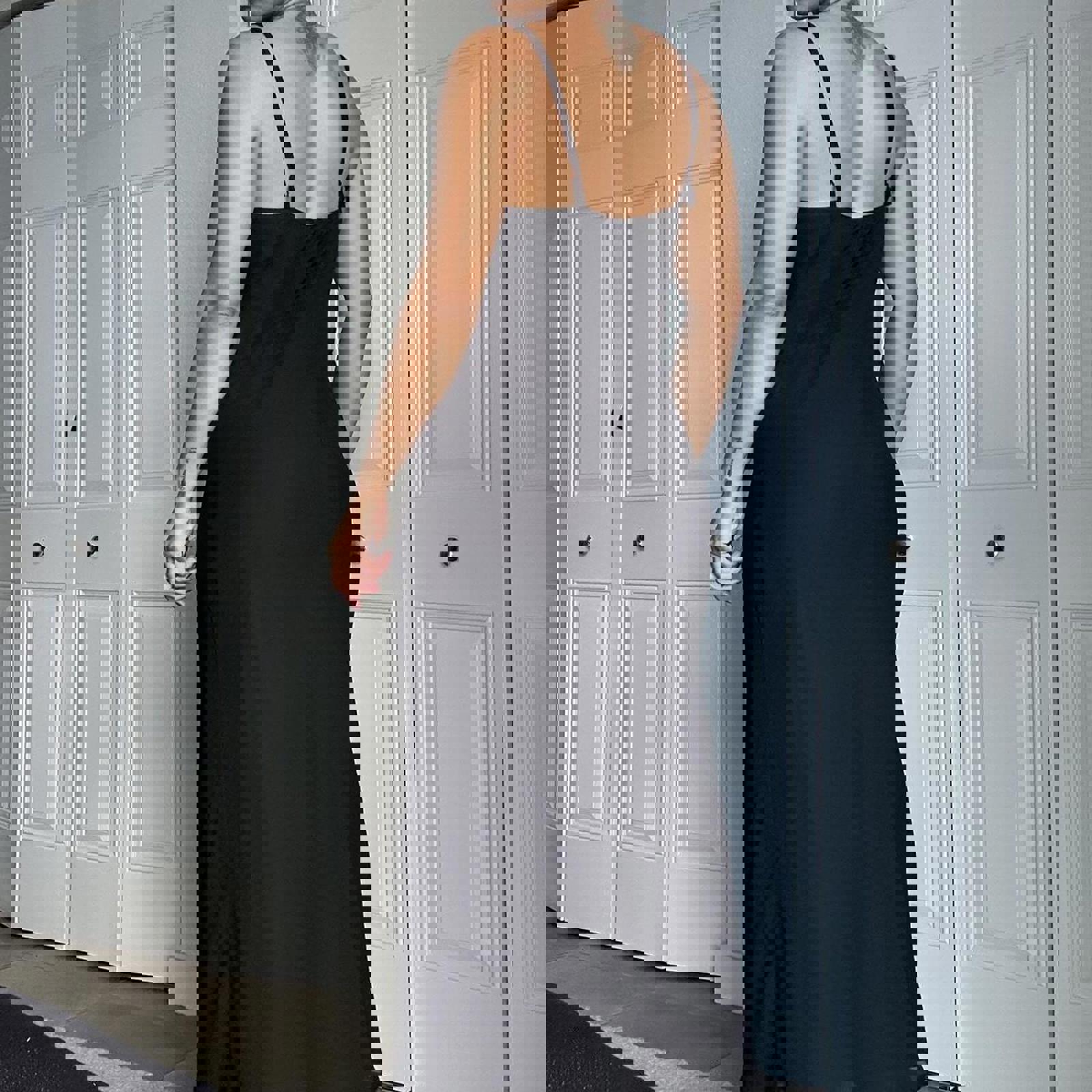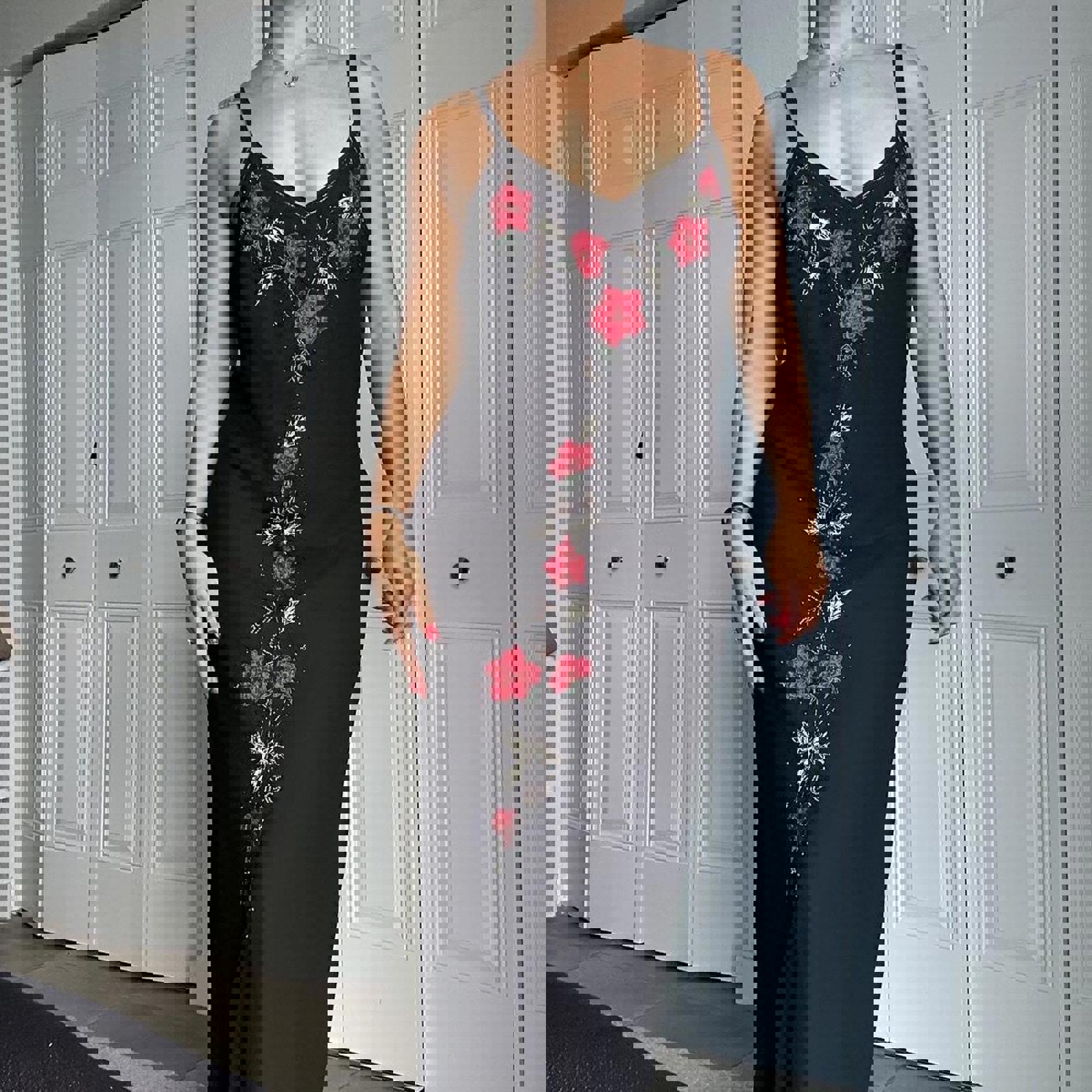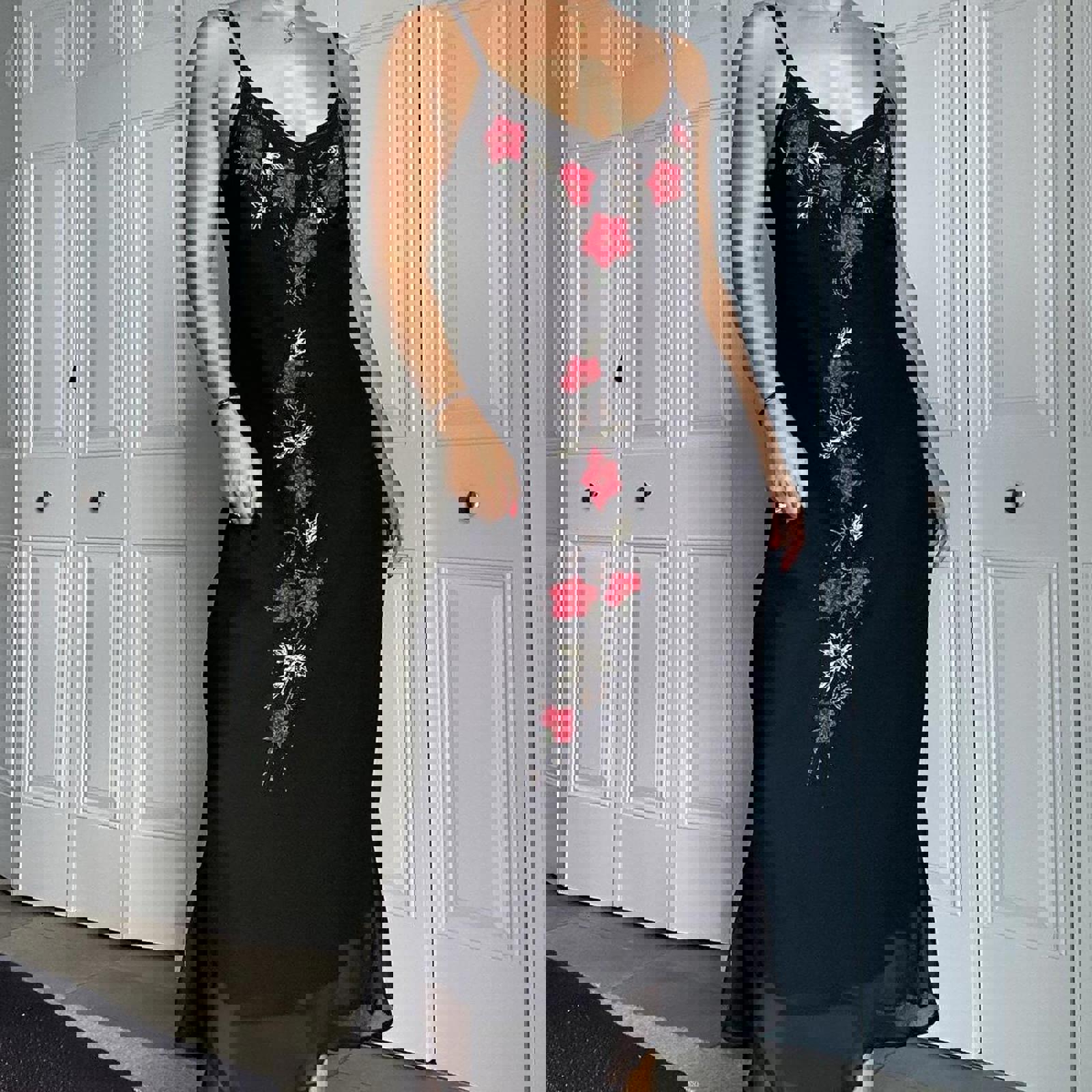 662. Votre Mode Black maxi dress with red floral embroidery and brown beading, featuring a V-neckline and spaghetti straps. #floral #embroidered