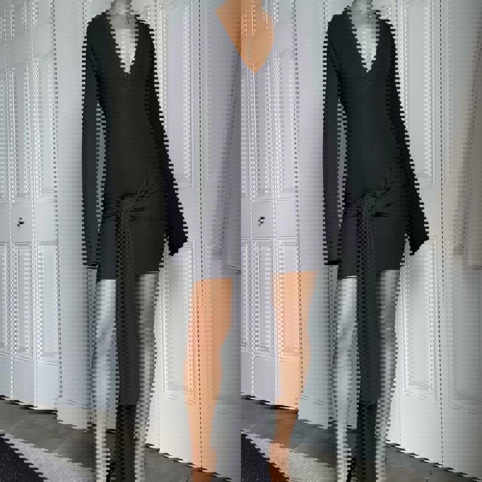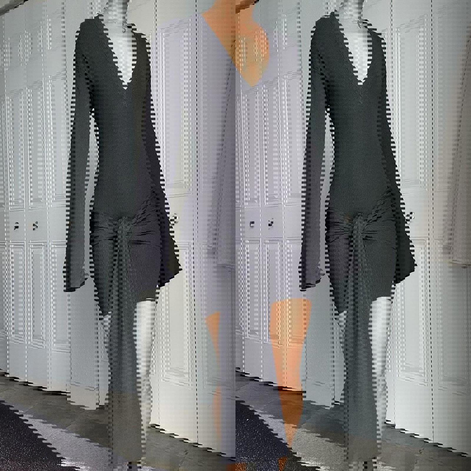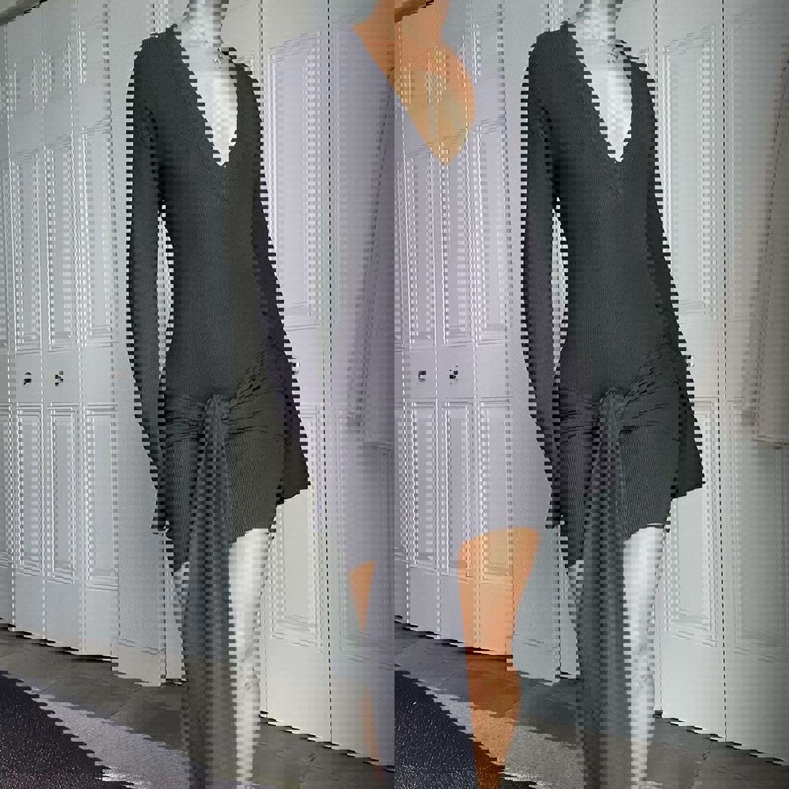 Black Baysse dress with tie detail. This is a darker gray color. It has lots of stretch. The tie is attached.