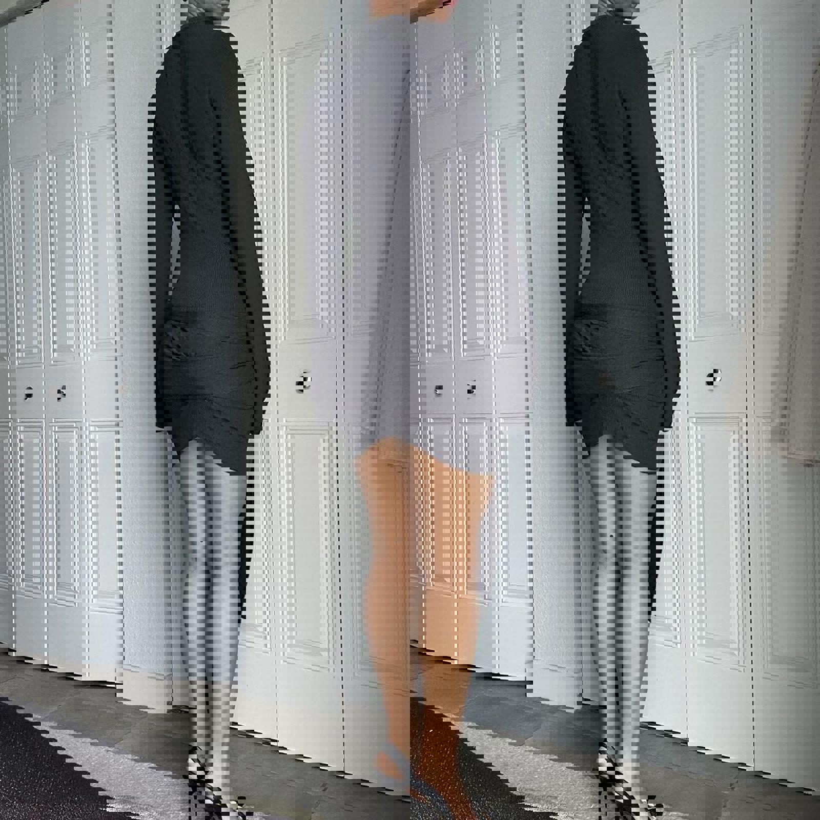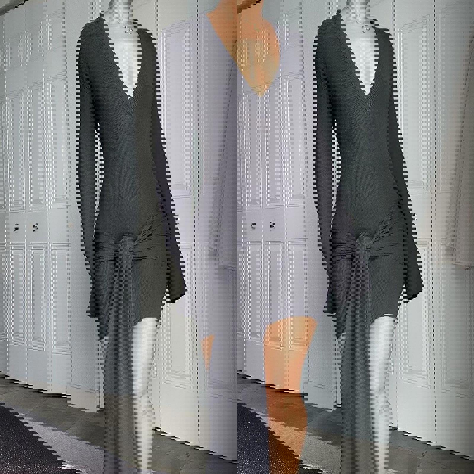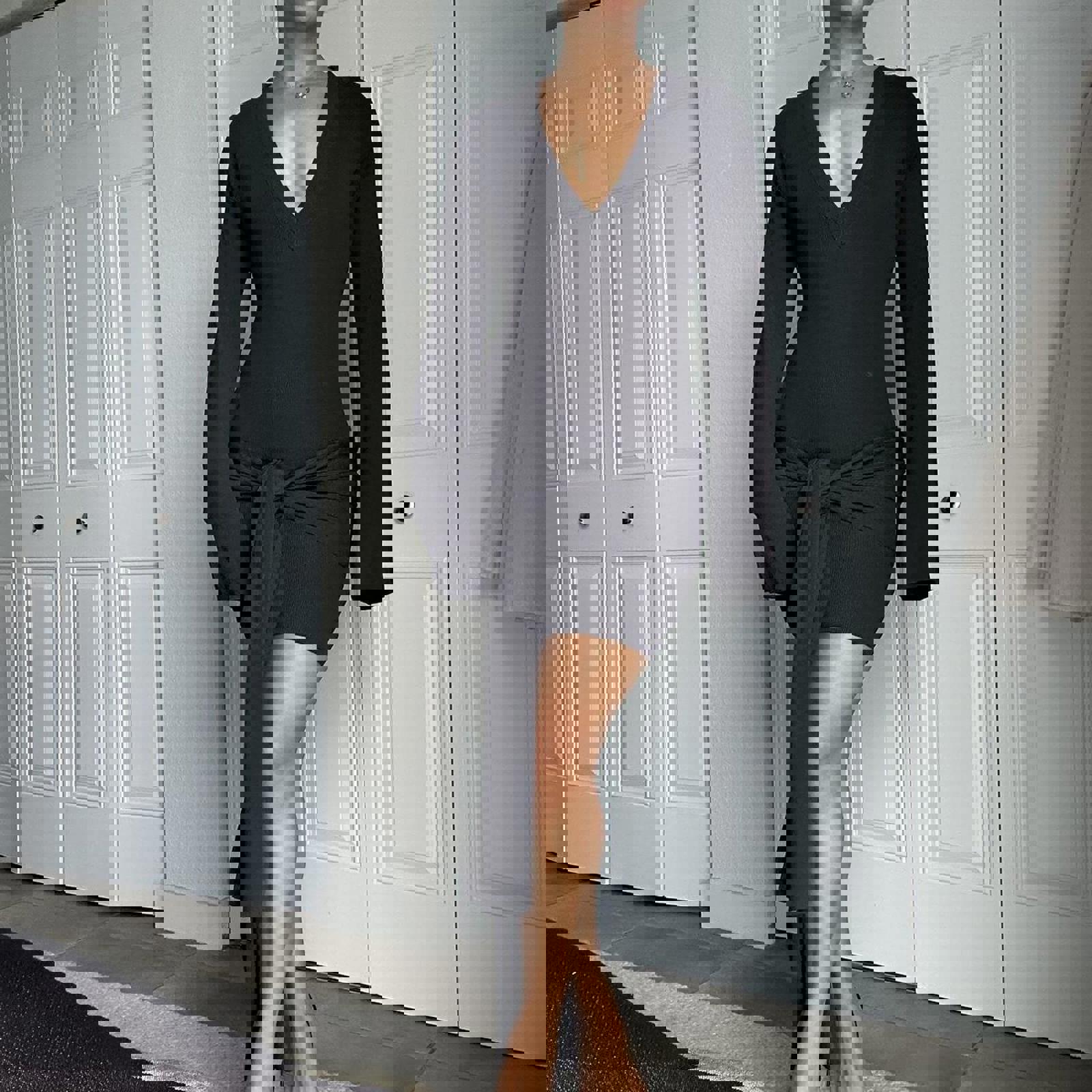 Black Baysse dress with tie detail. This is a darker gray color. It has lots of stretch. The tie is attached.