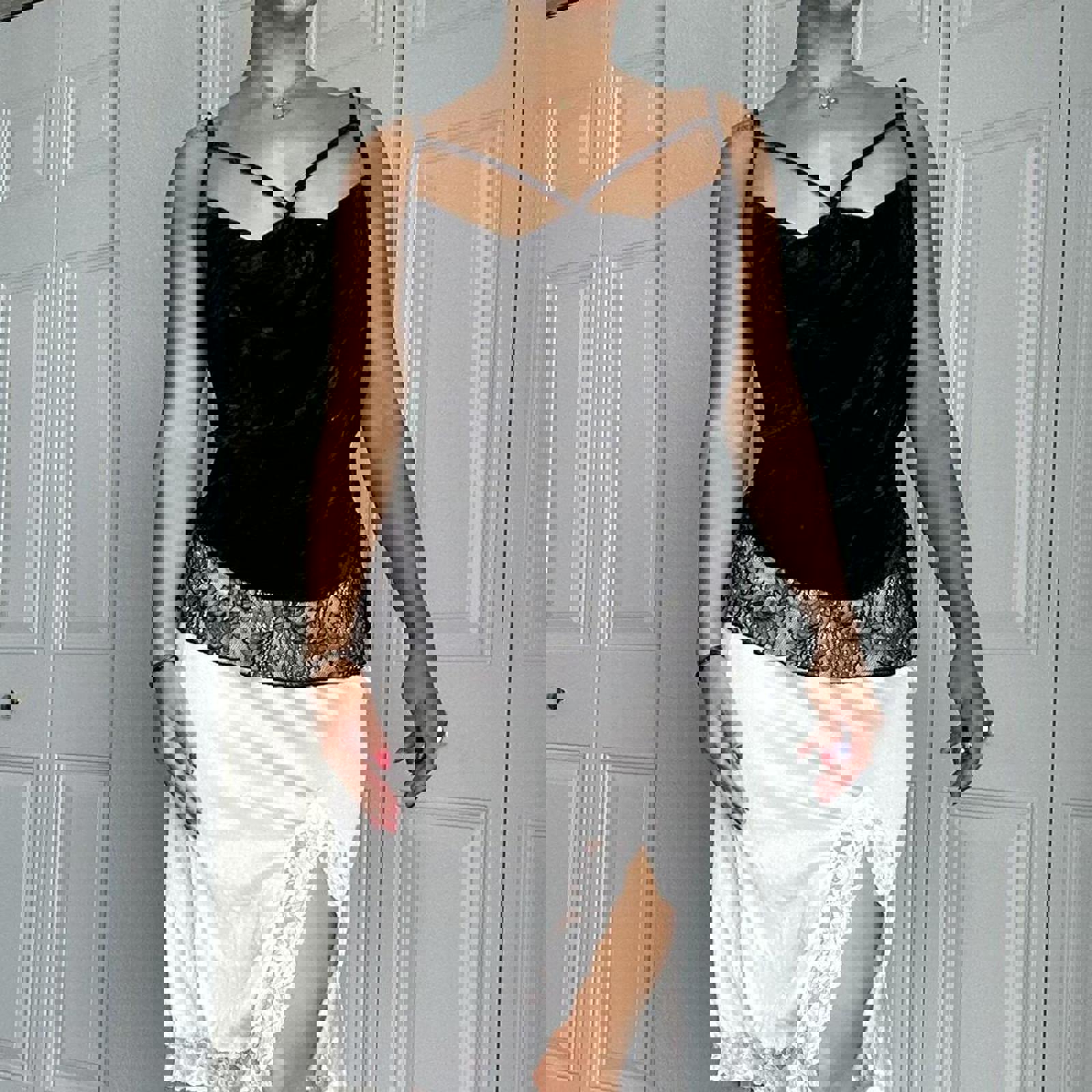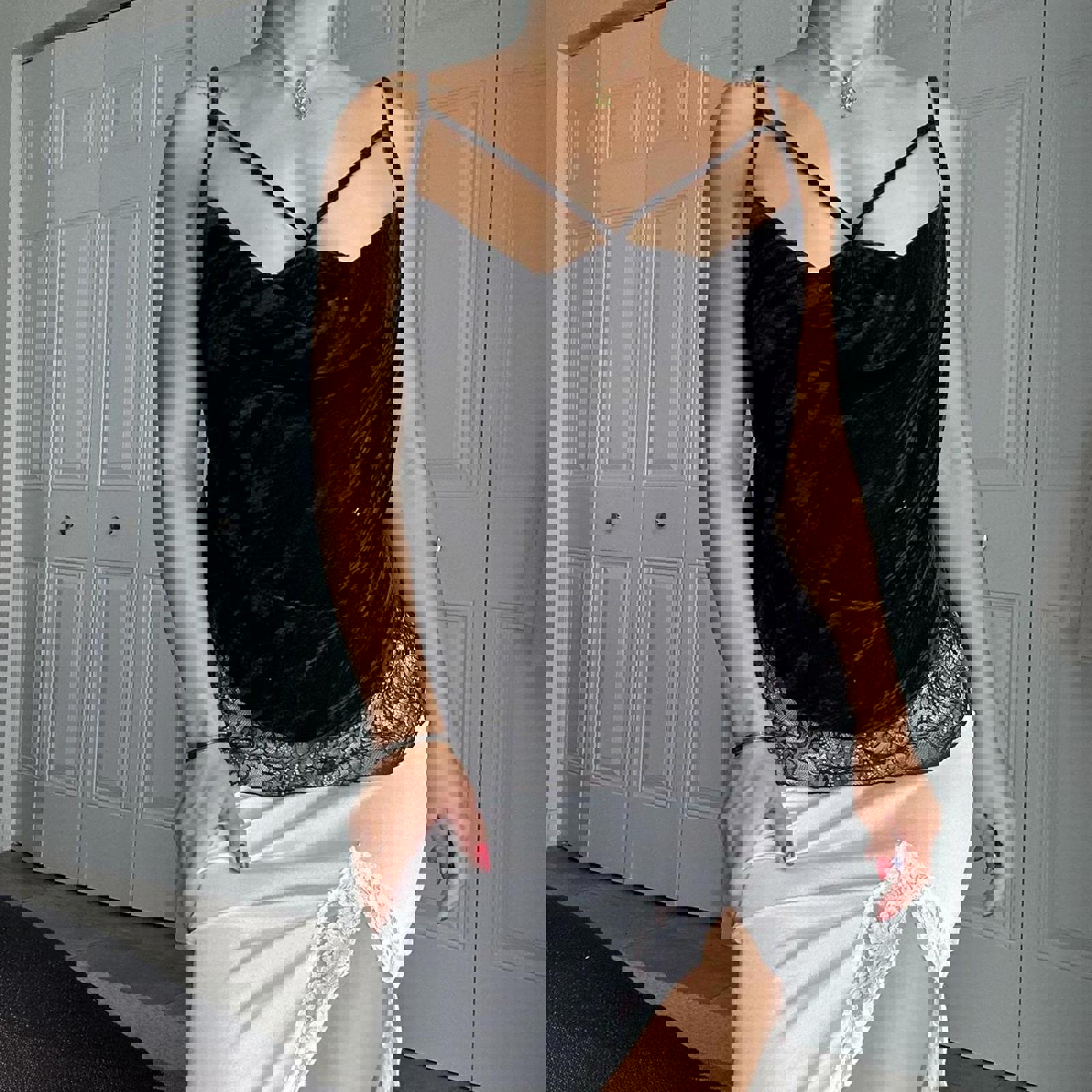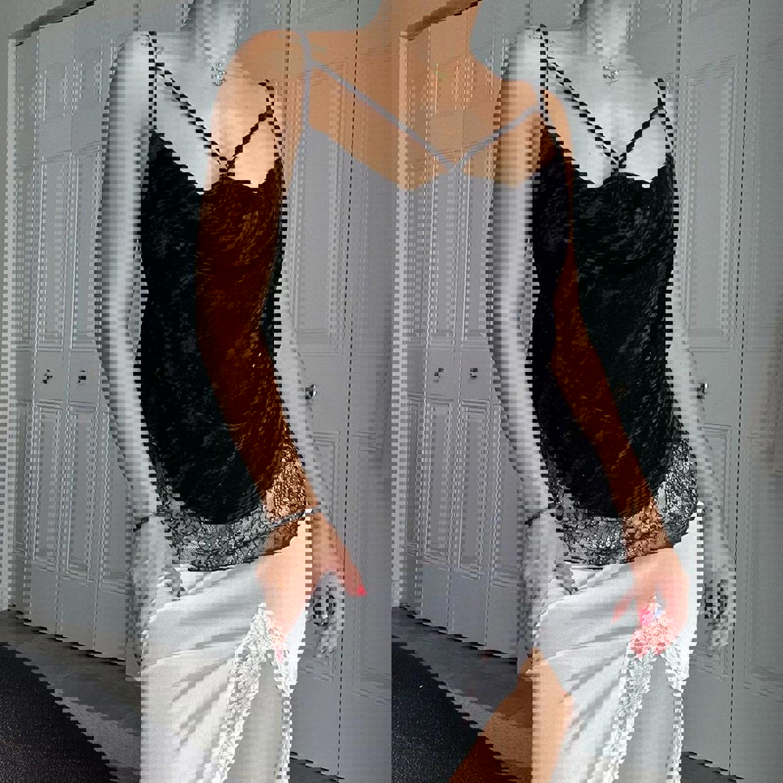 black velvet, cross straps, lace trim, tank top, fitted, elegant, sleeveless, satin finish, nightwear, chic