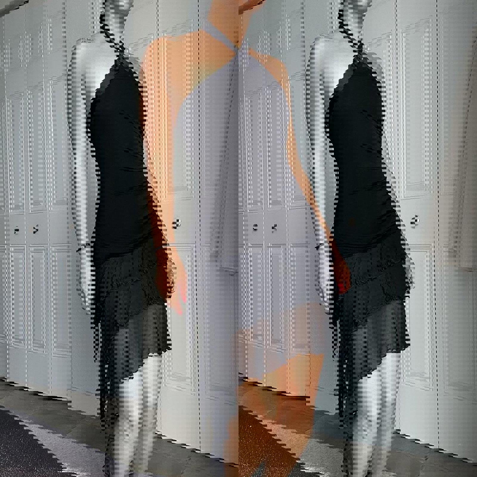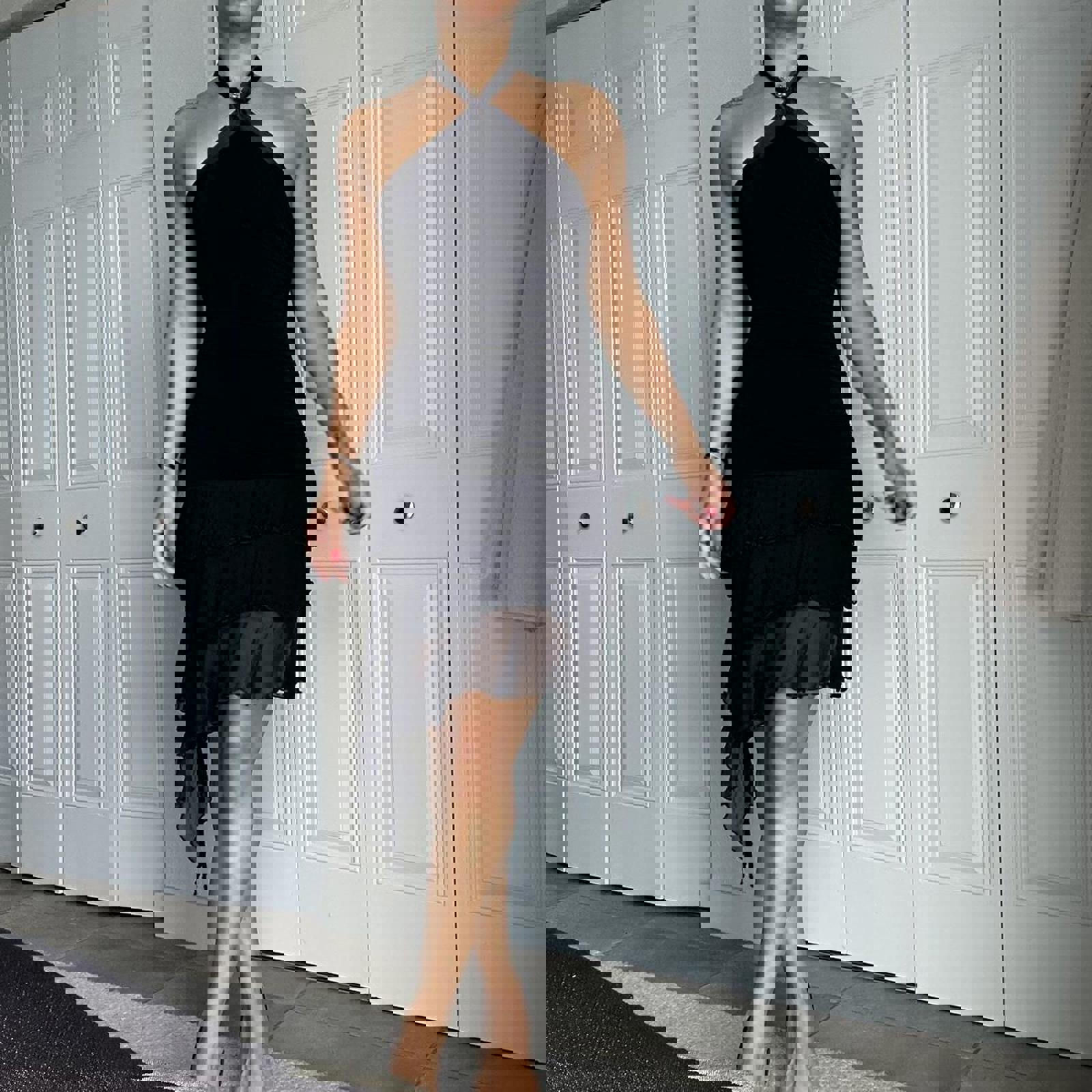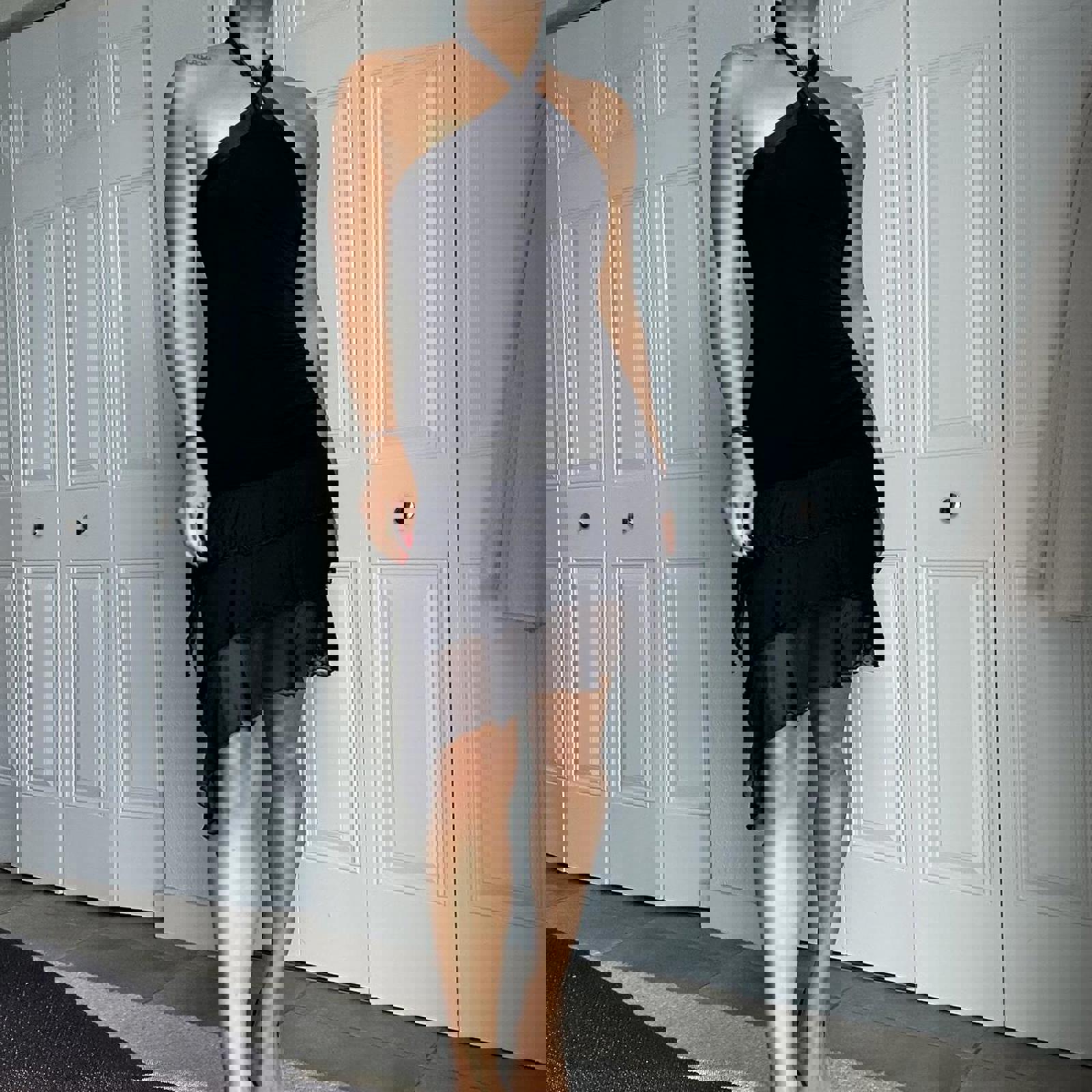 696. Black Bebe halter neck mini dress with ruffle hem