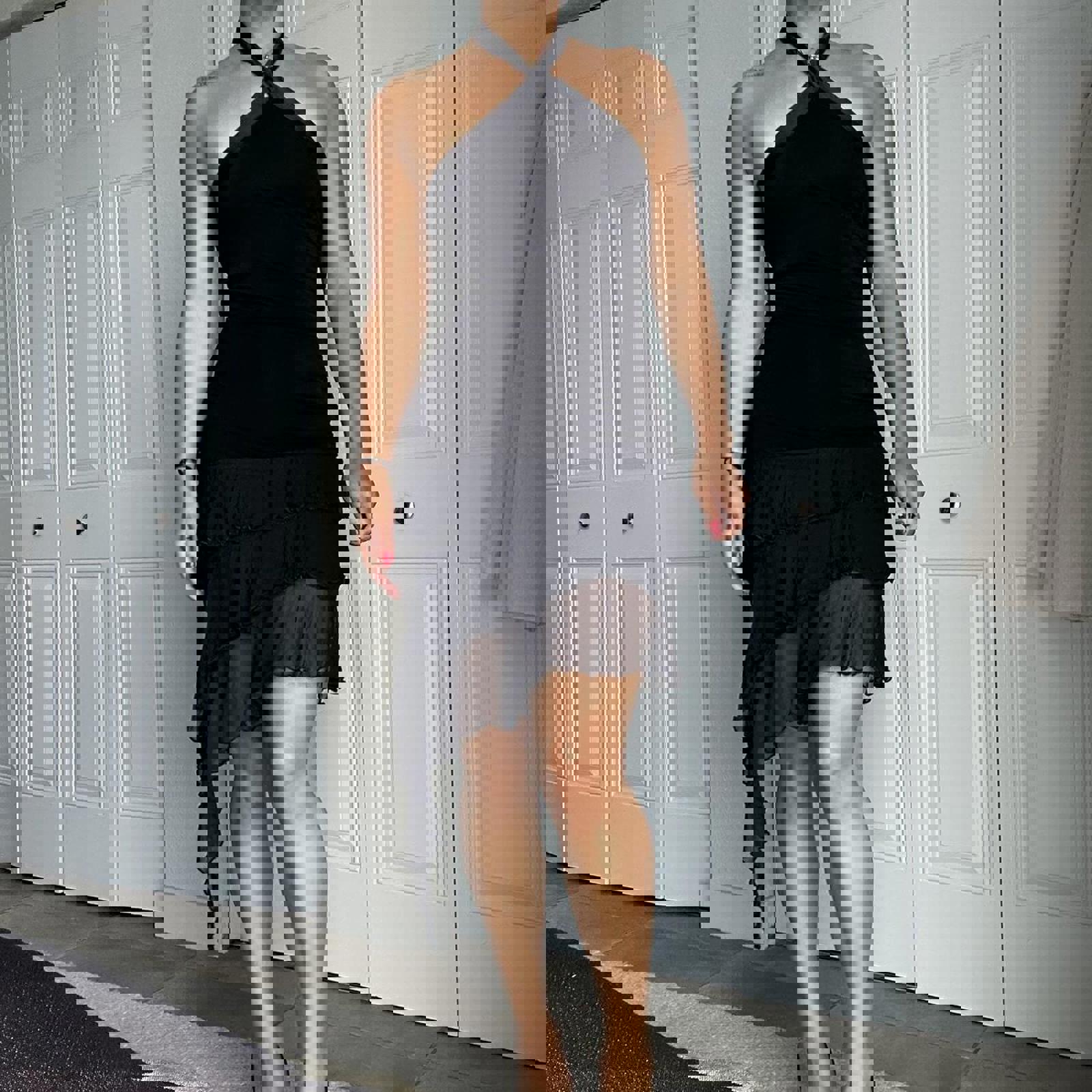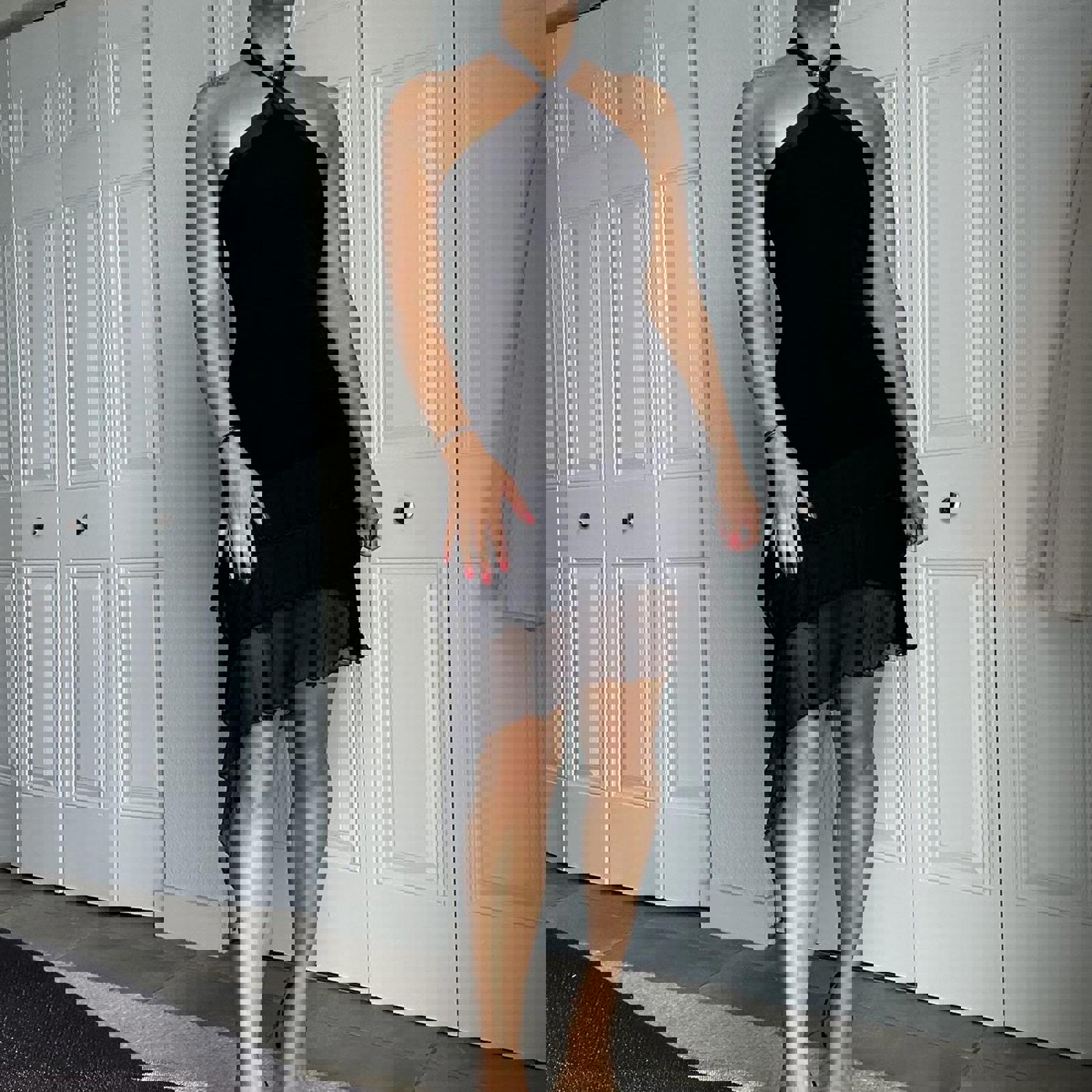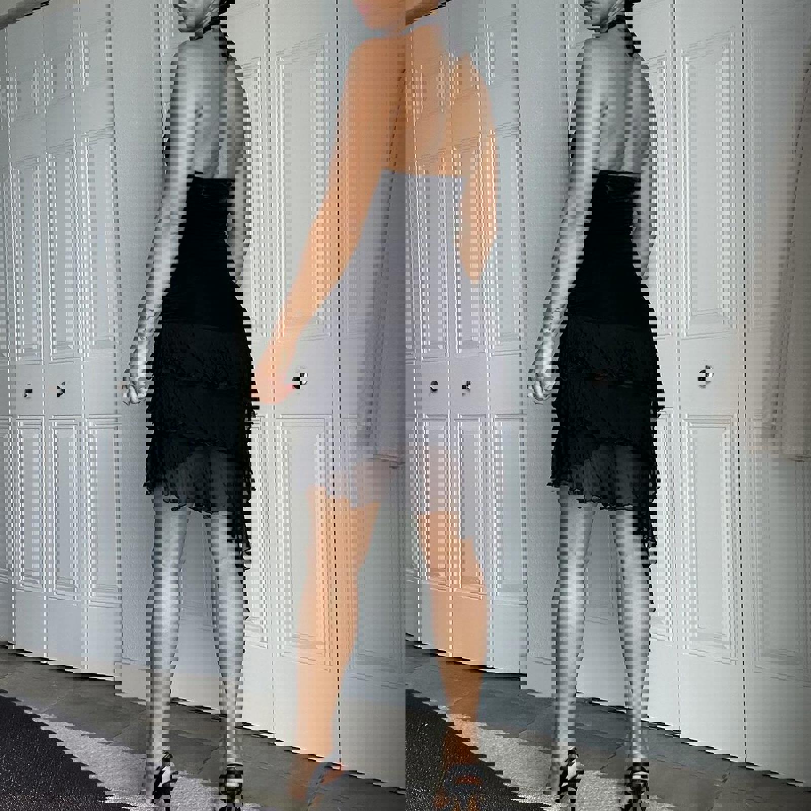 696. Black Bebe halter neck mini dress with ruffle hem