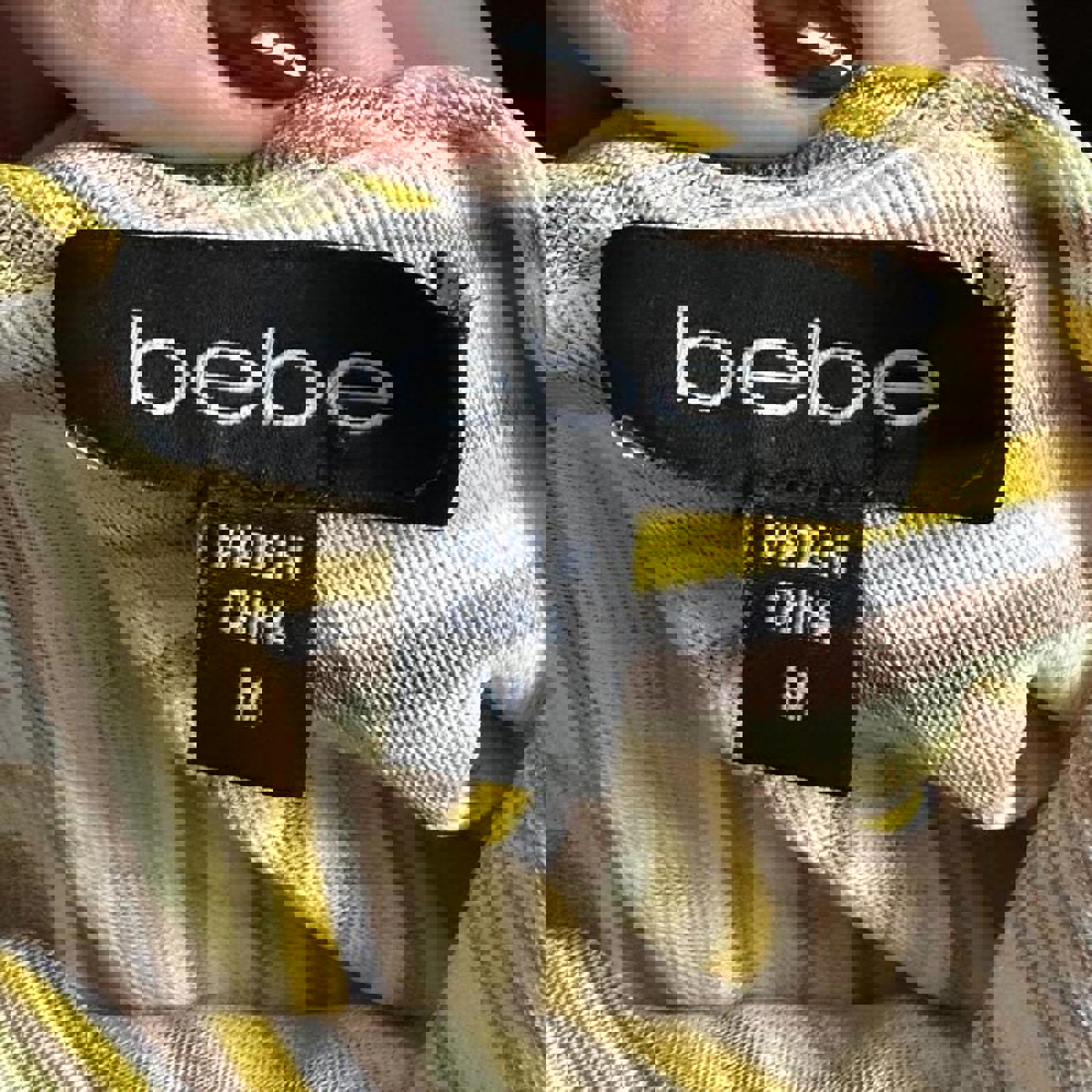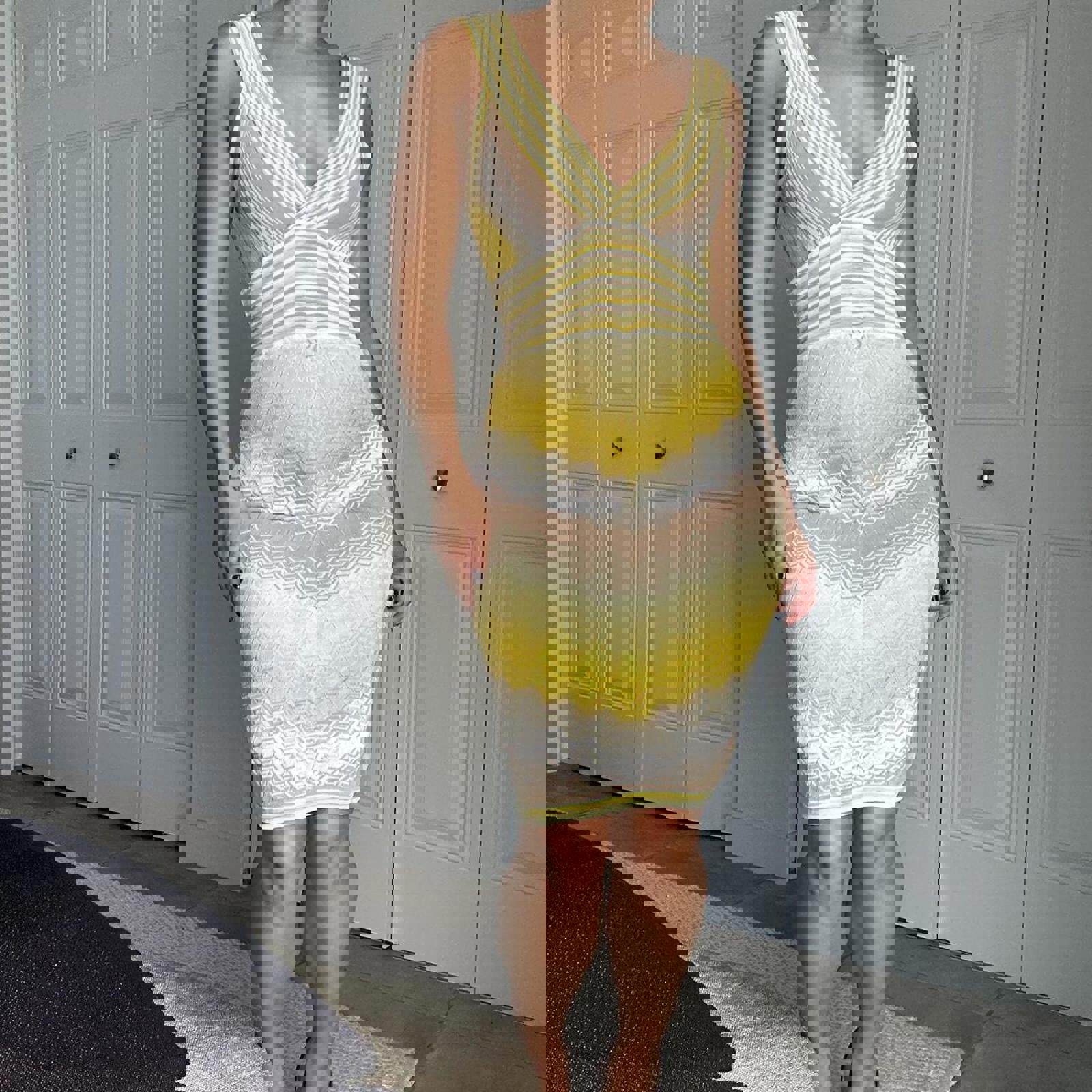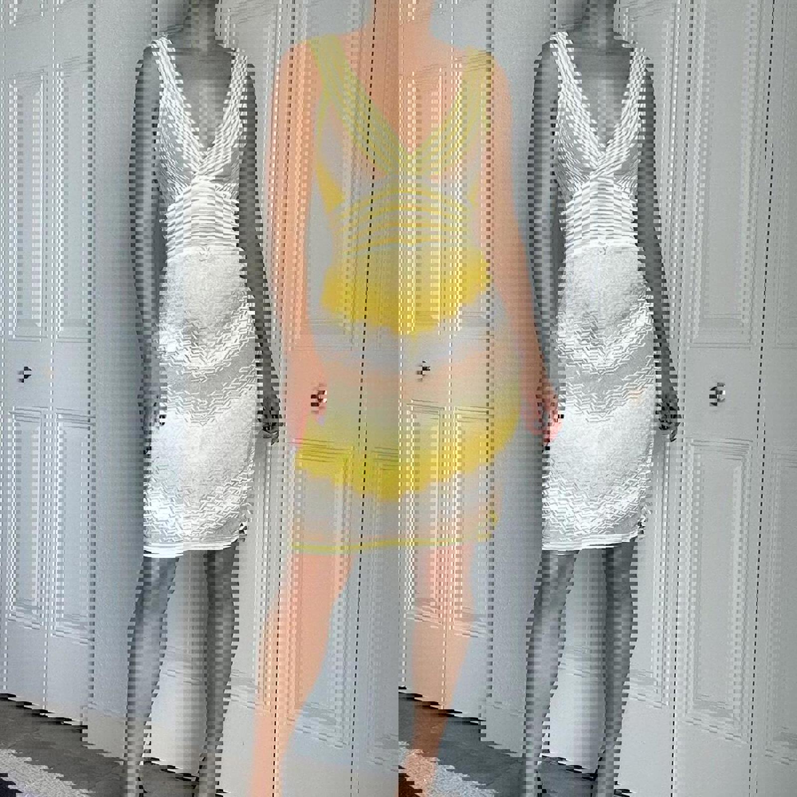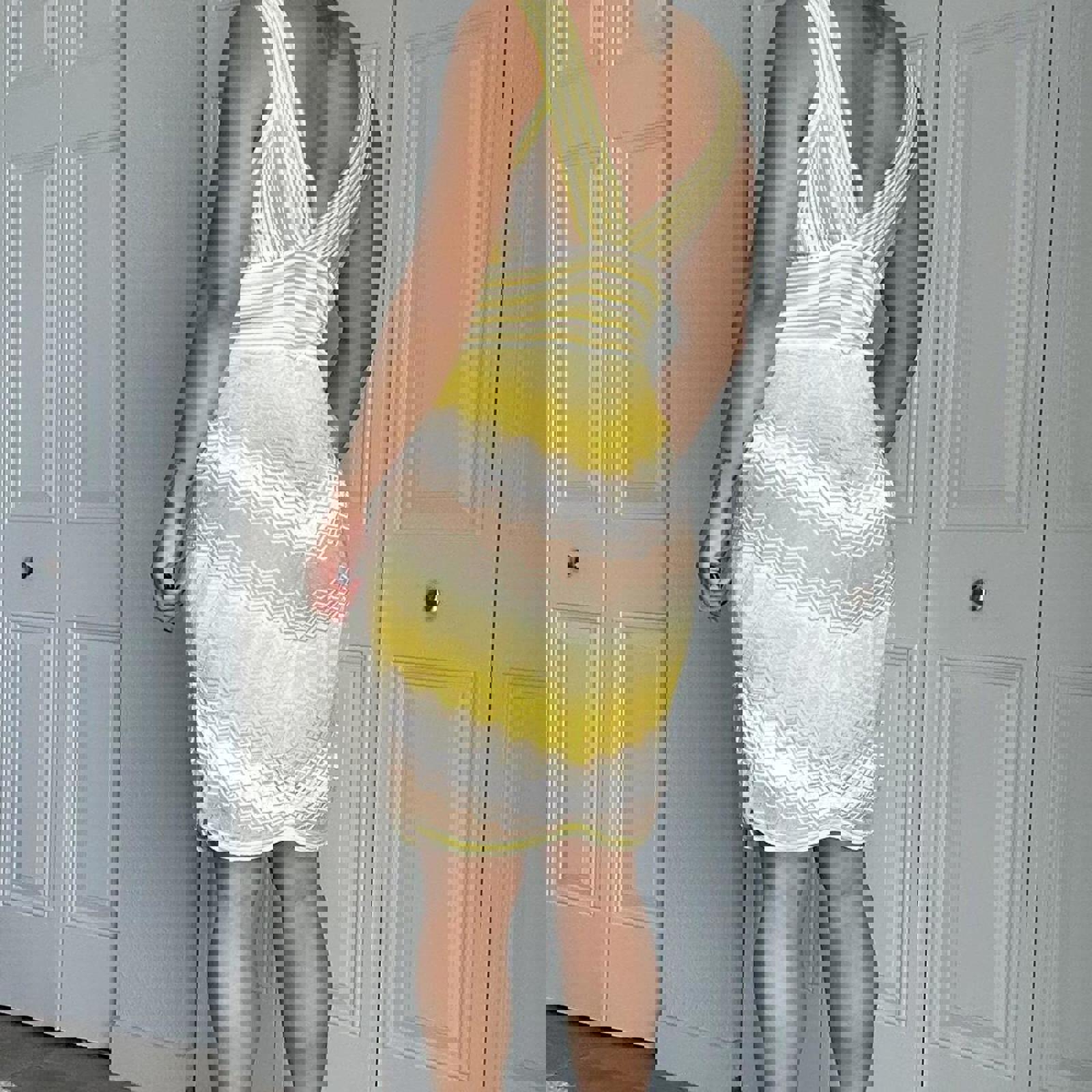 715. Bebe yellow dress with semi sheer bust and chevron print. Great condition, one stain very unnoticeable pointed out in photo. Also has some loose threads on the shoulder, but nothing that is affecting the structure of the dress. Measurements are listed below: