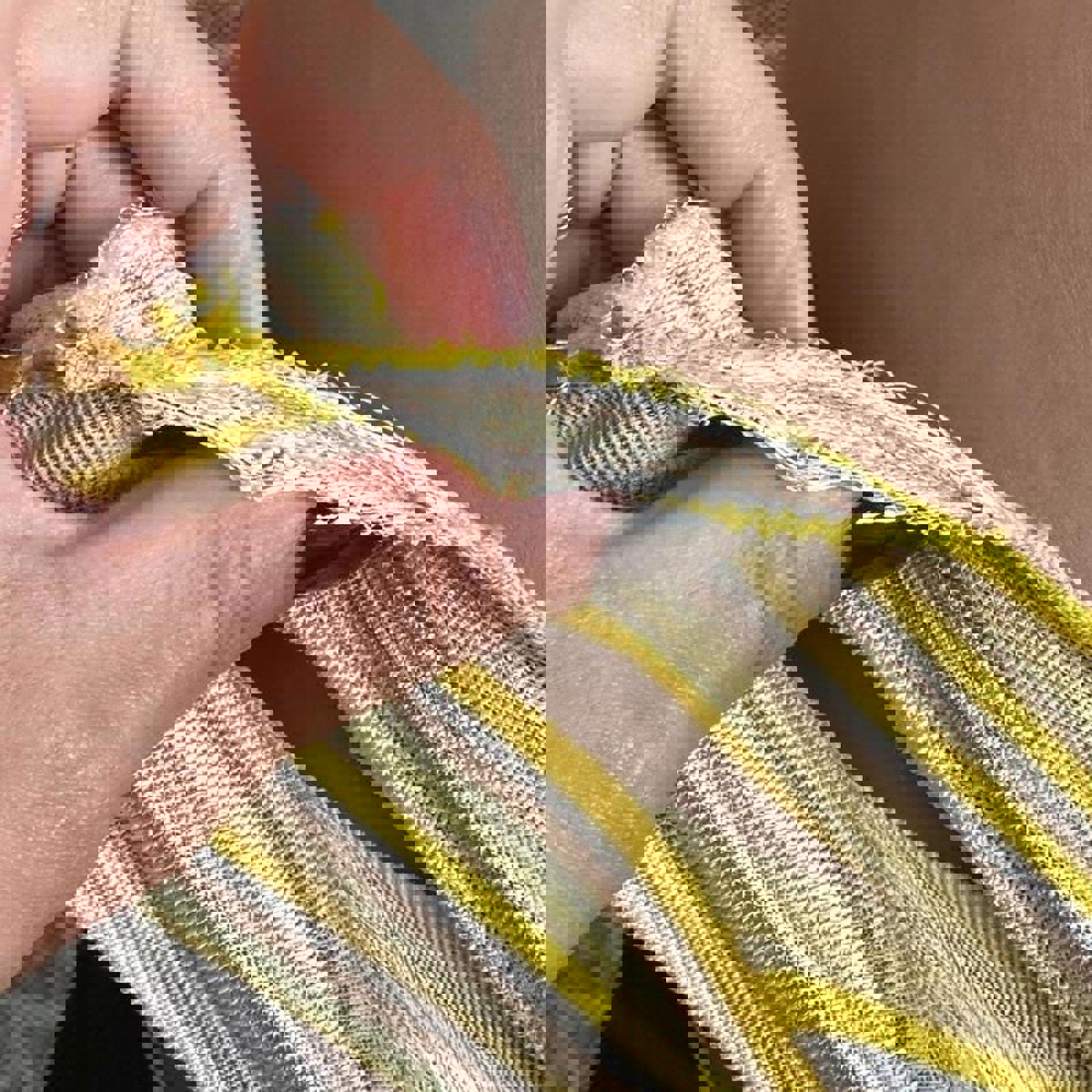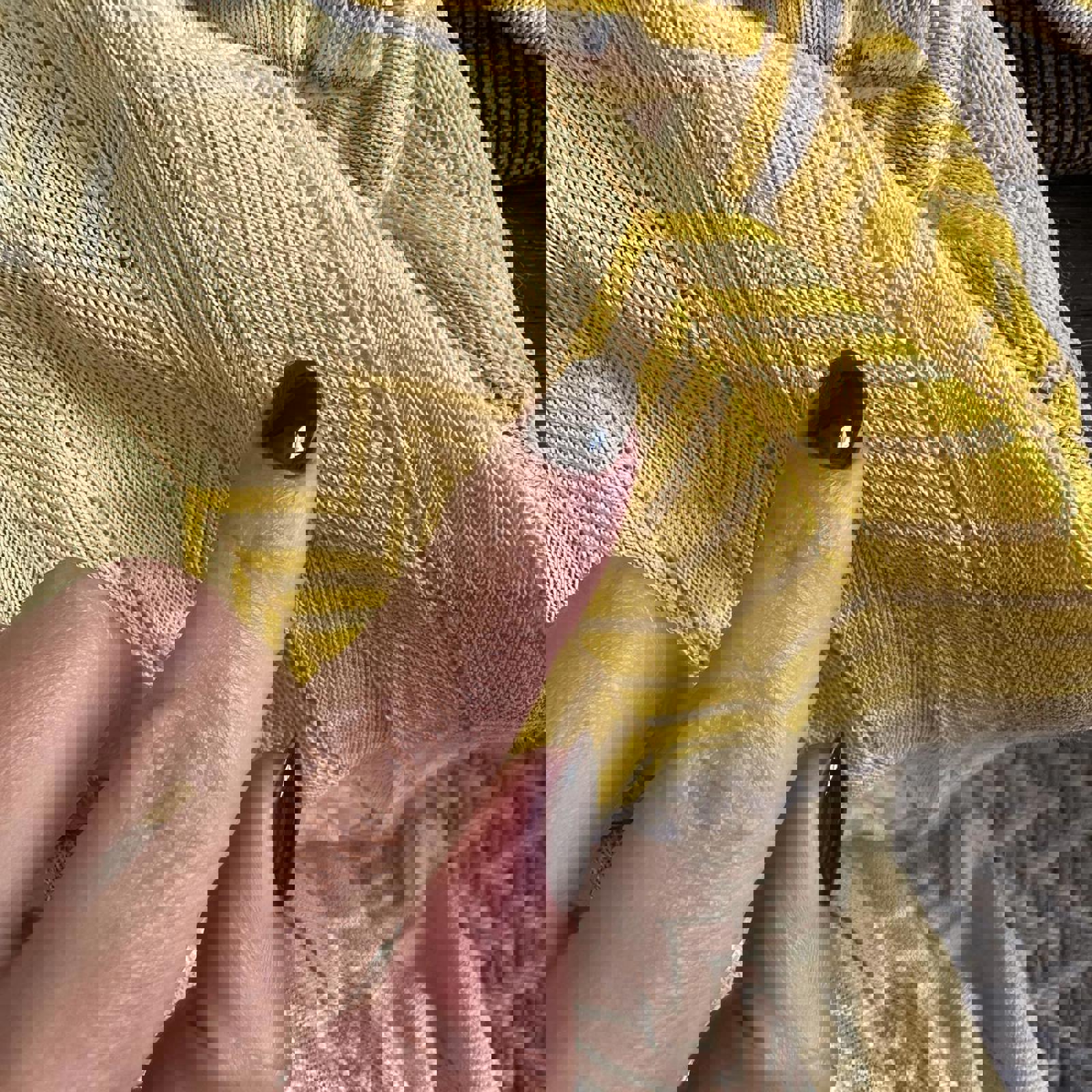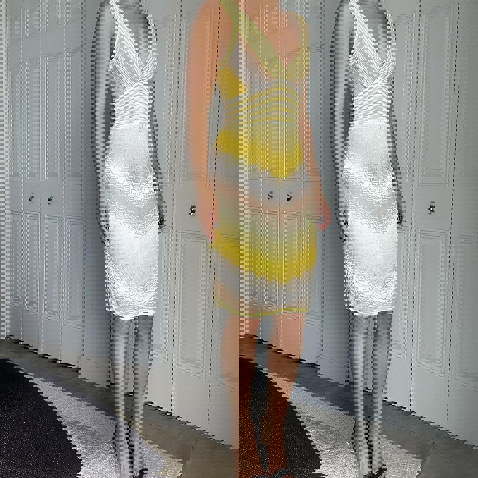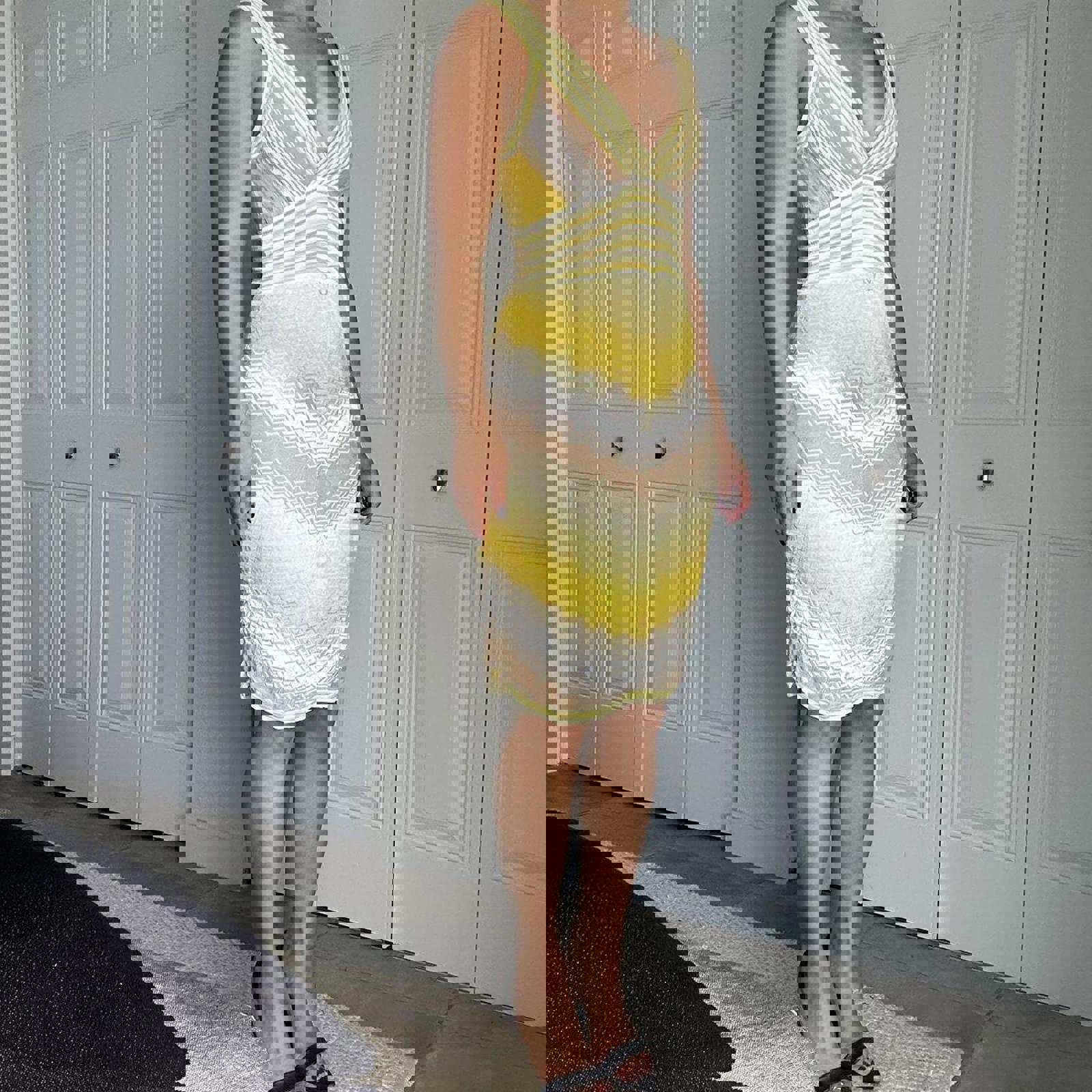 715. Bebe yellow dress with semi sheer bust and chevron print. Great condition, one stain very unnoticeable pointed out in photo. Also has some loose threads on the shoulder, but nothing that is affecting the structure of the dress. Measurements are listed below: