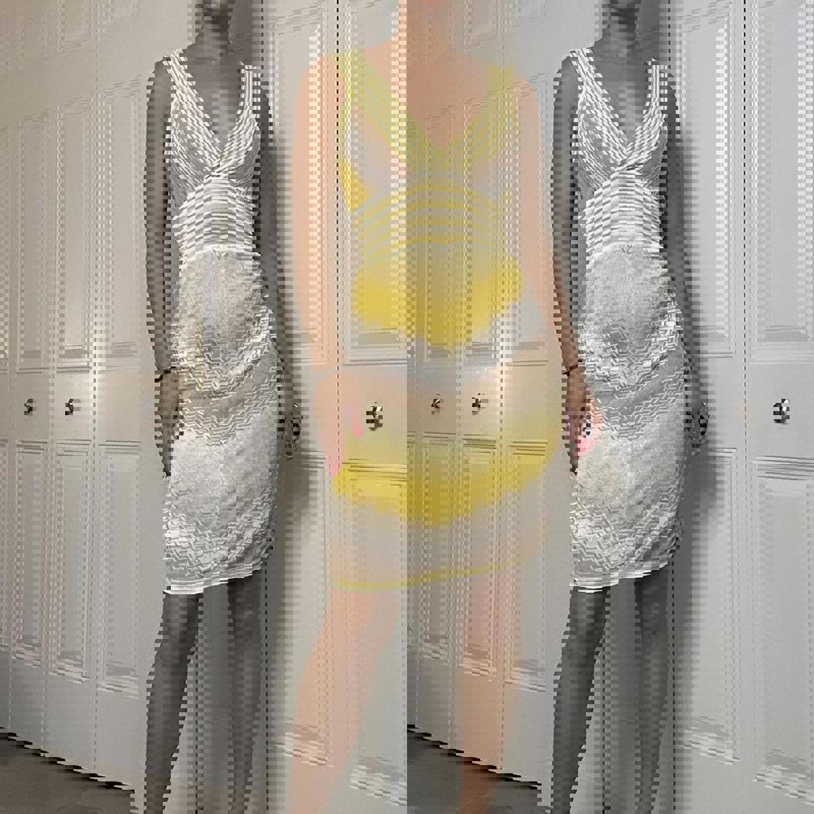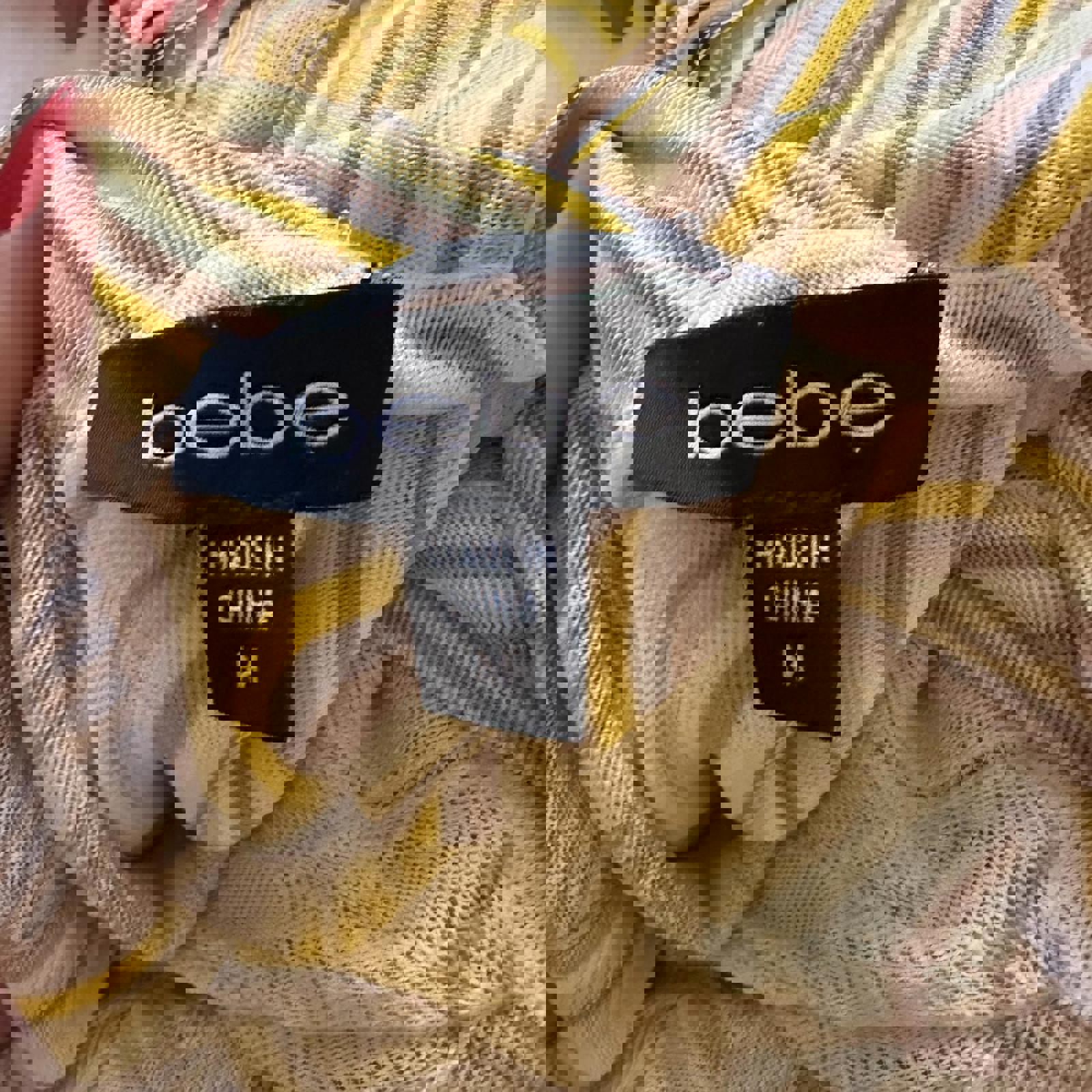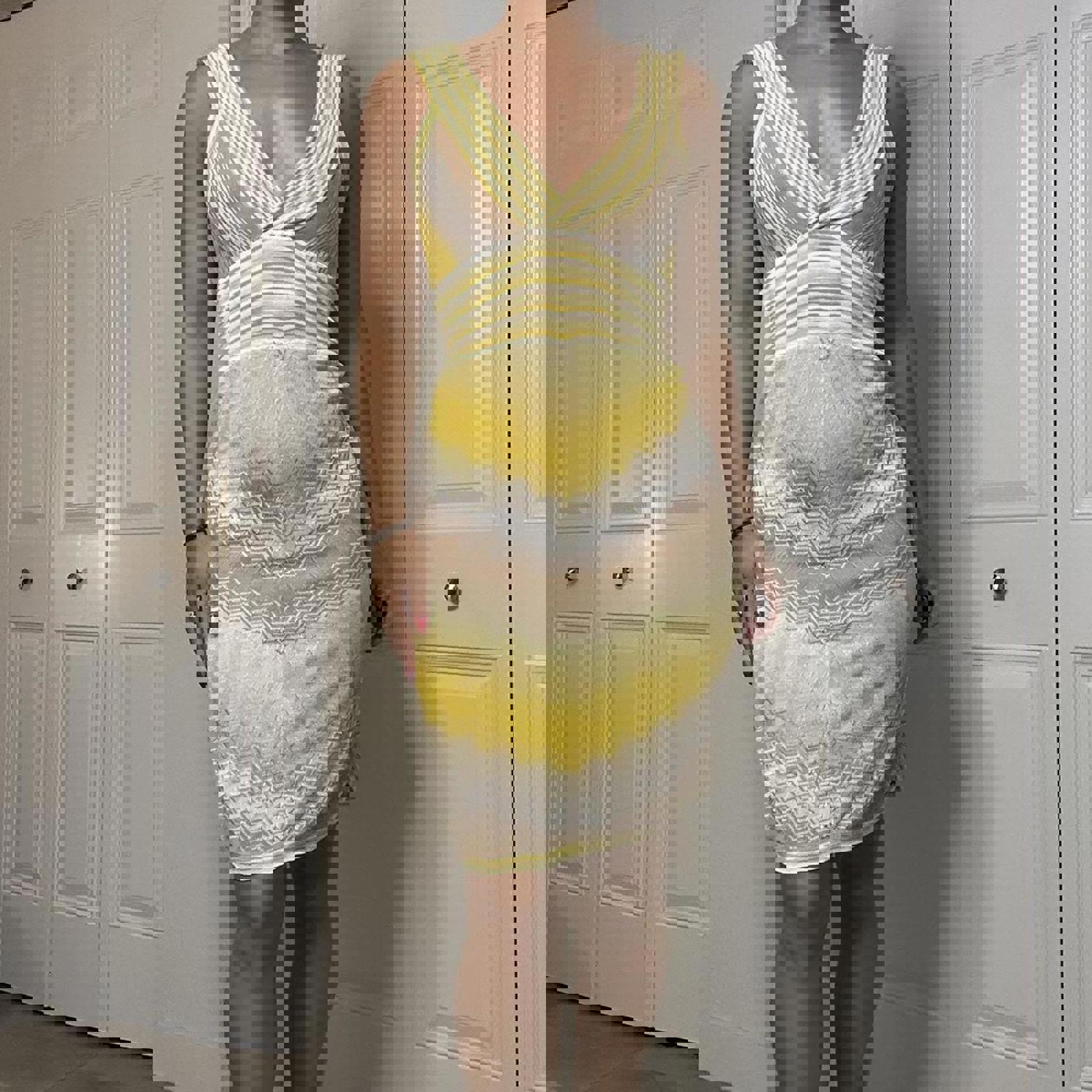 715. Bebe yellow dress with semi sheer bust area and missoni print. Great condition, one stain very unnoticeable pointed out in photo