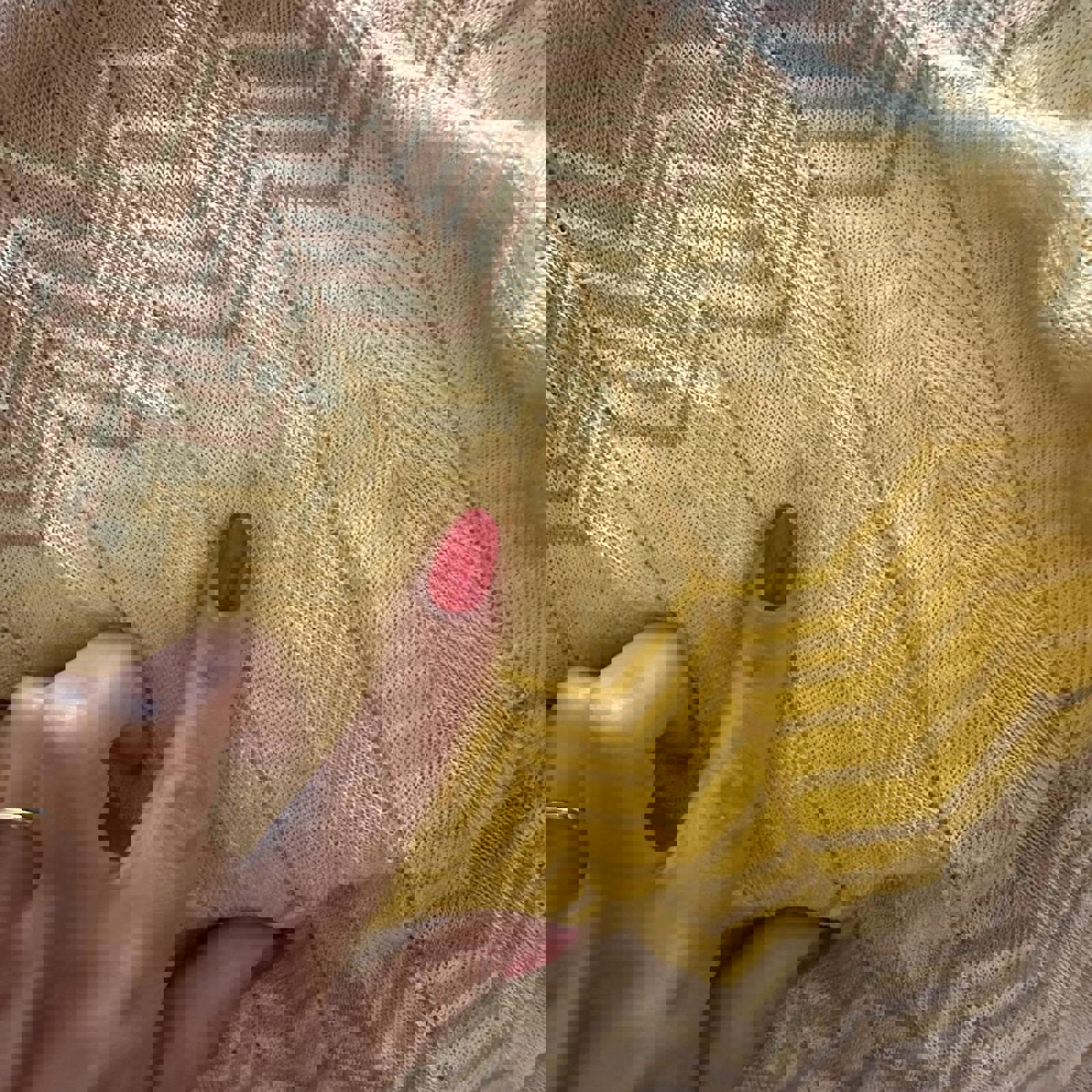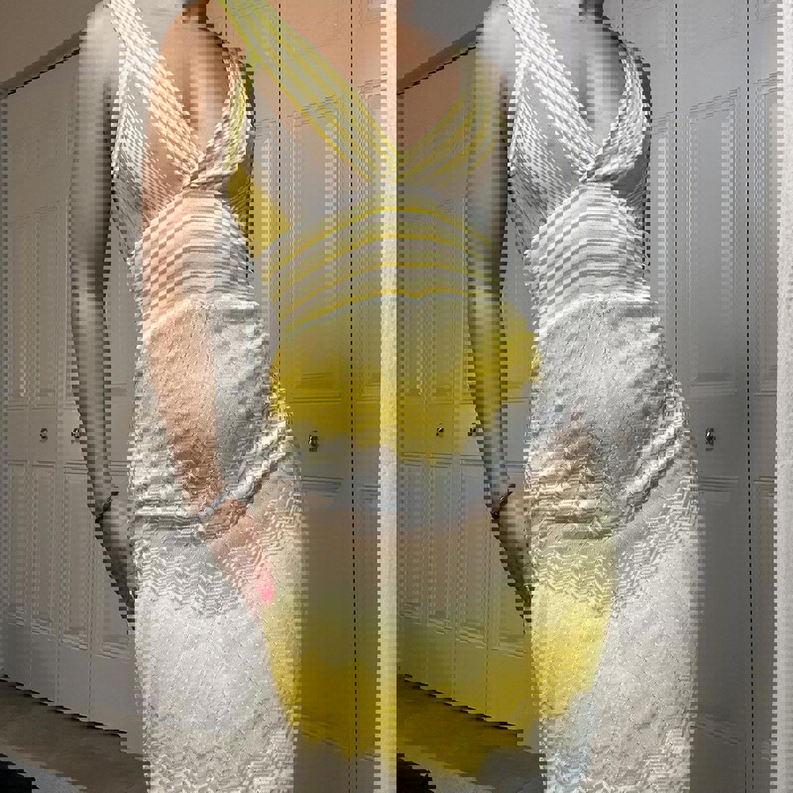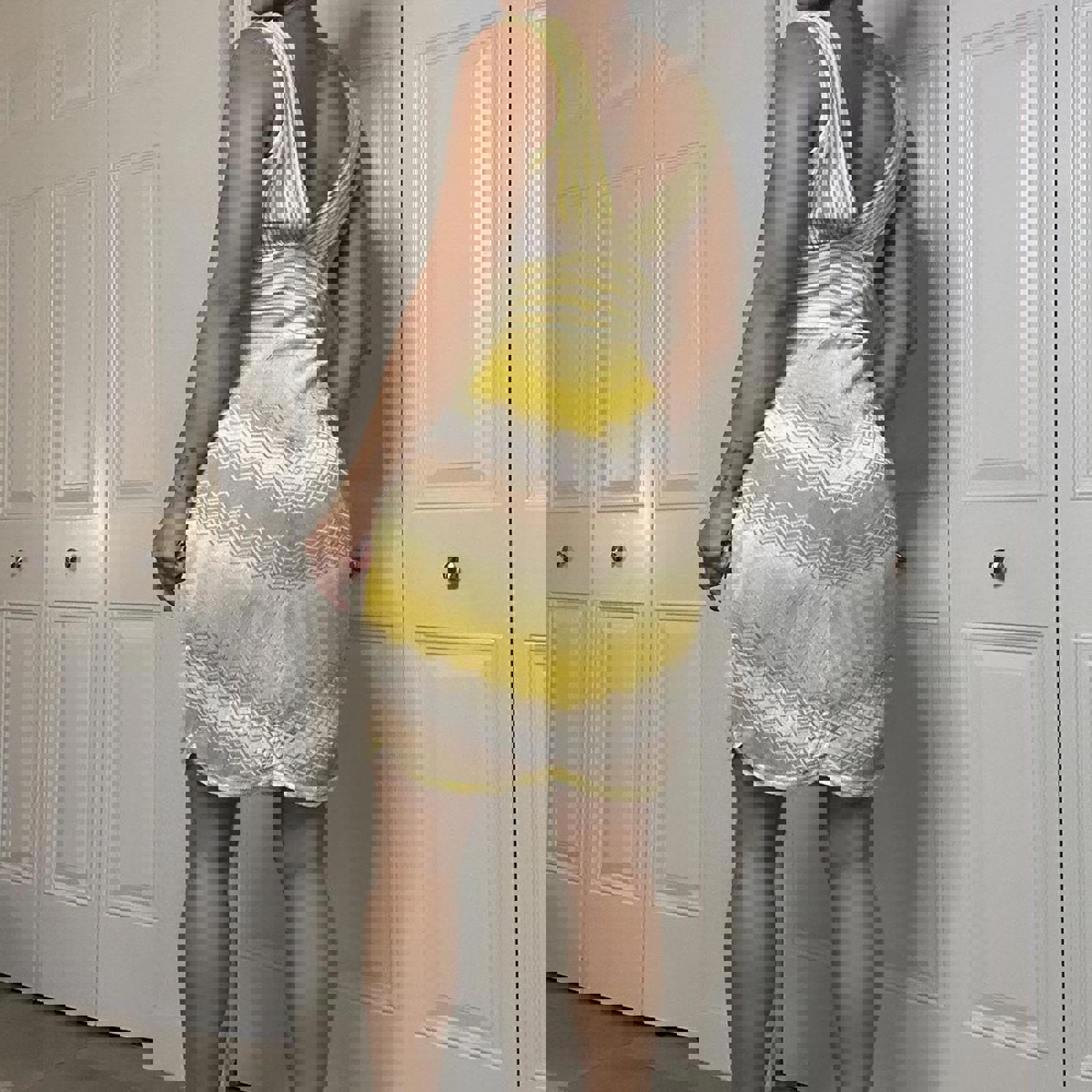 715. Bebe yellow dress with semi sheer bust area and missoni print. Great condition, one stain very unnoticeable pointed out in photo