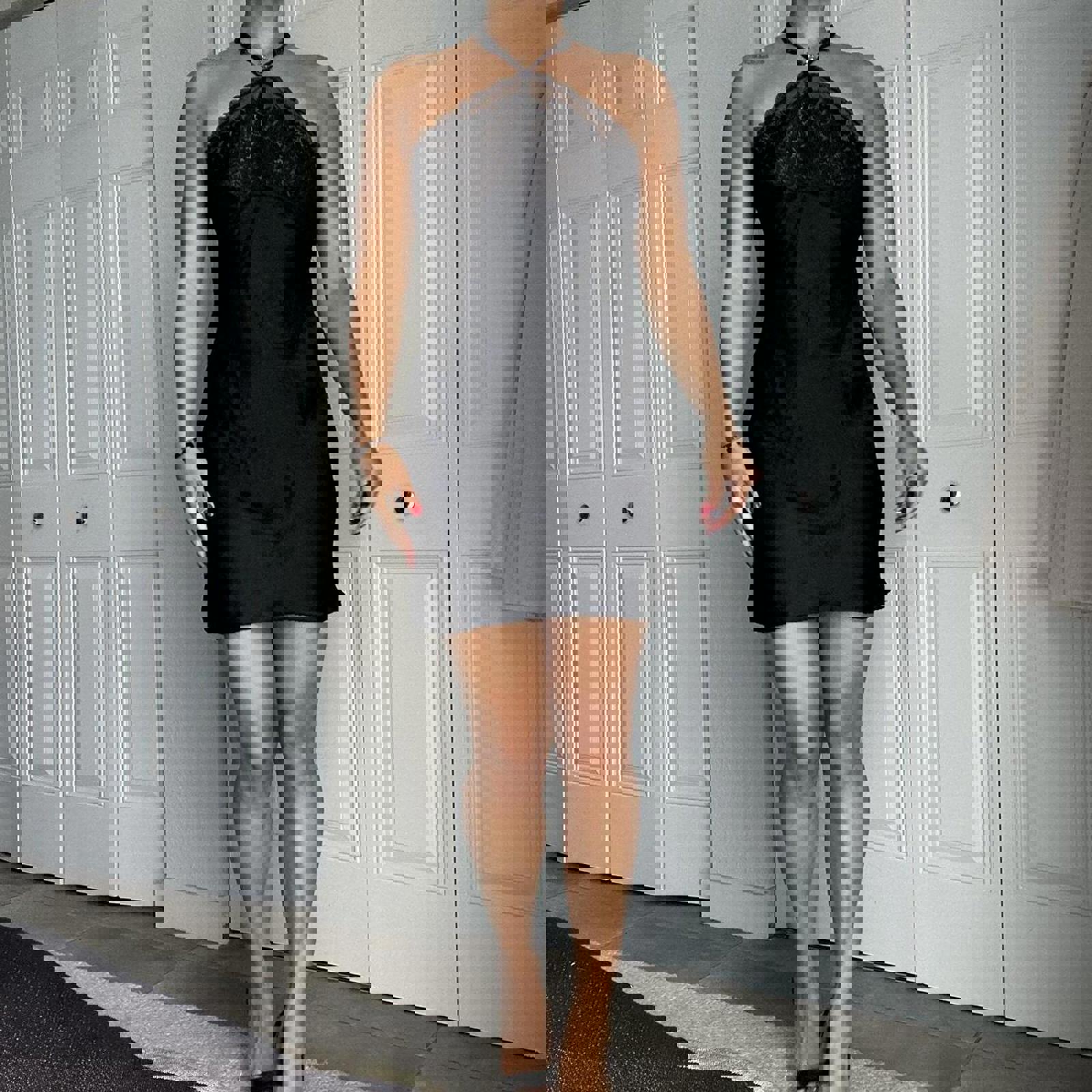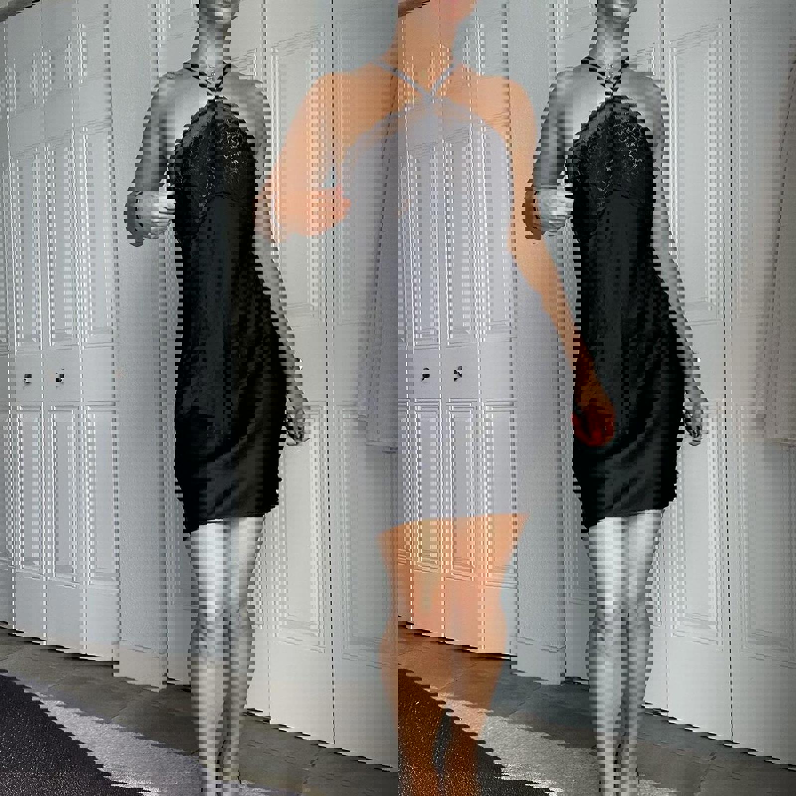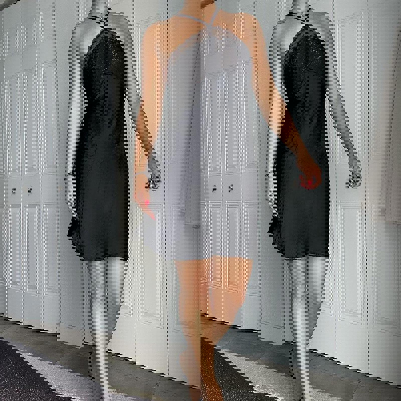 620. Calvin Klein 100% Silk Mini Slip Dress with cross neck front and t-neck back. It's in perfect condition. The top is completely lace, so it is sheer, but the darkening of the lace covers the nipples.