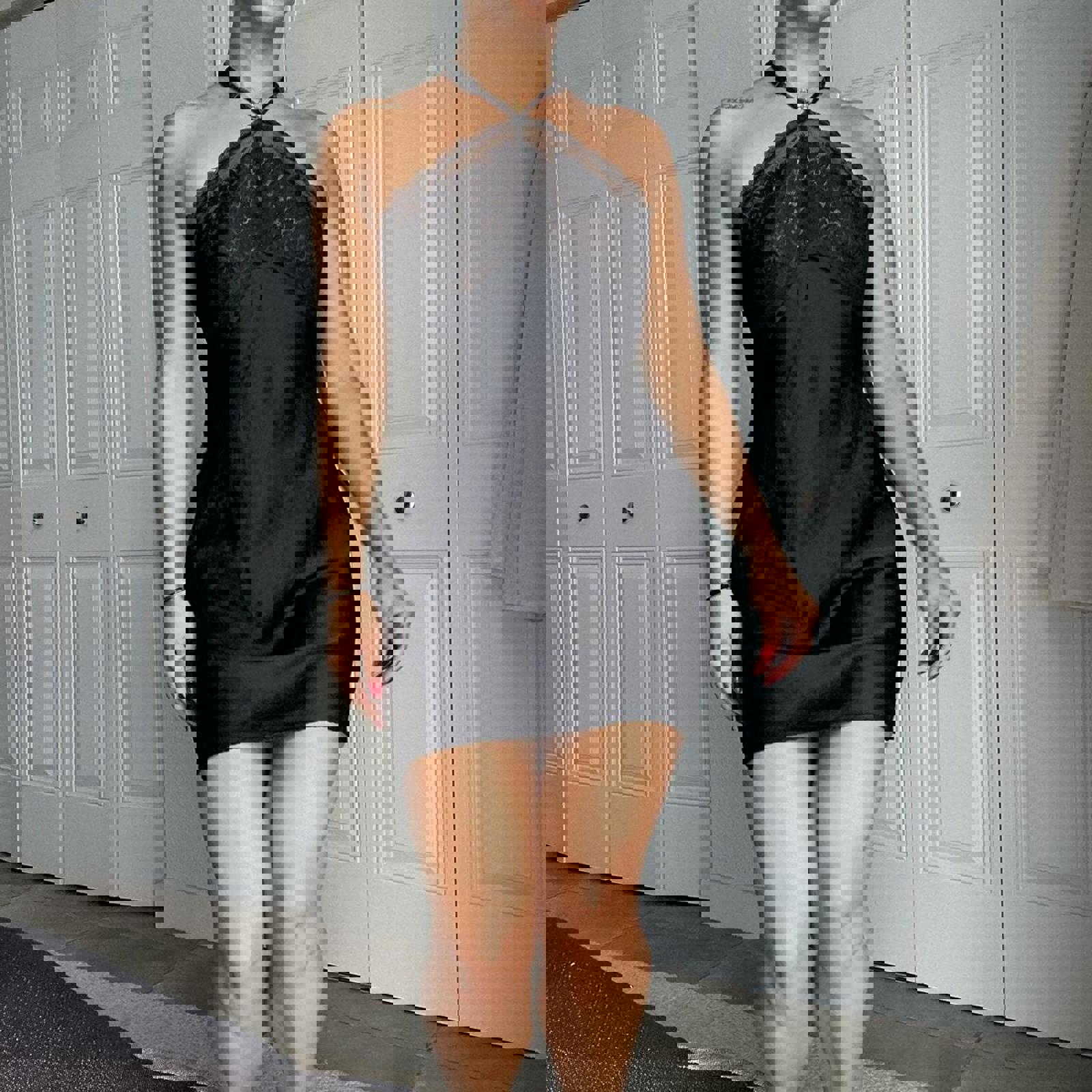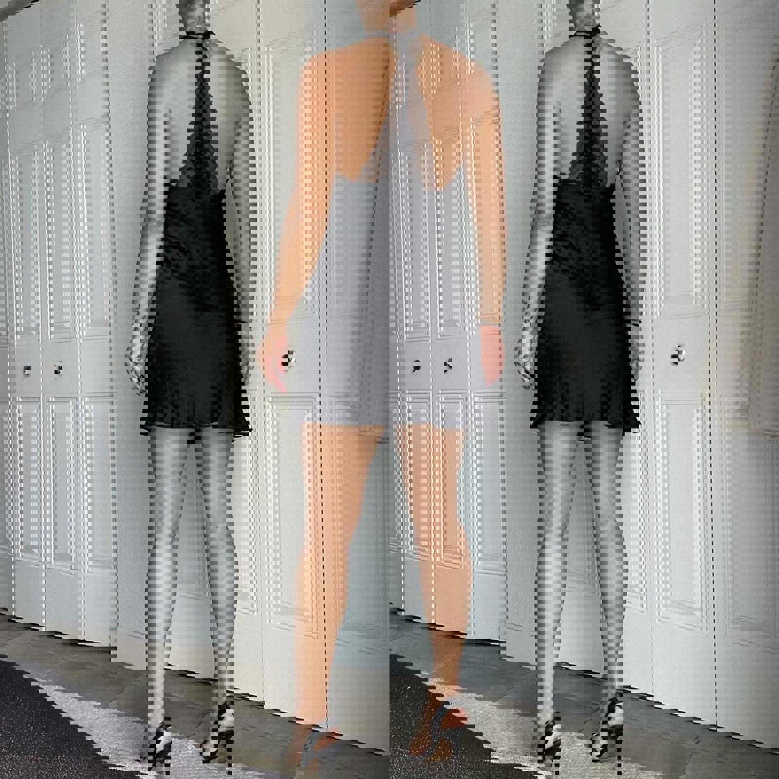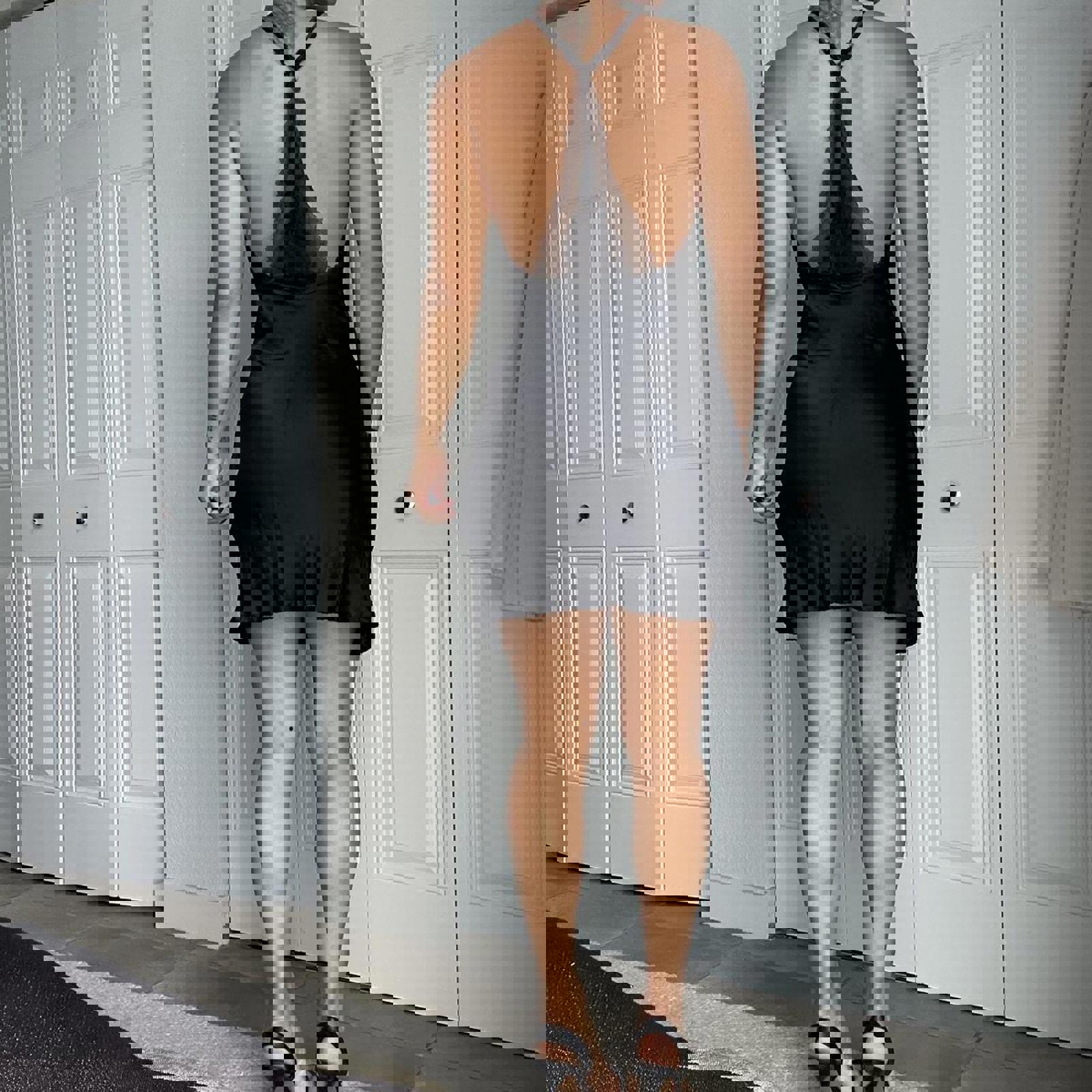 620. Calvin Klein 100% Silk Mini Slip Dress with cross neck front and t-neck back. It's in perfect condition. The top is completely lace, so it is sheer, but the darkening of the lace covers the nipples.