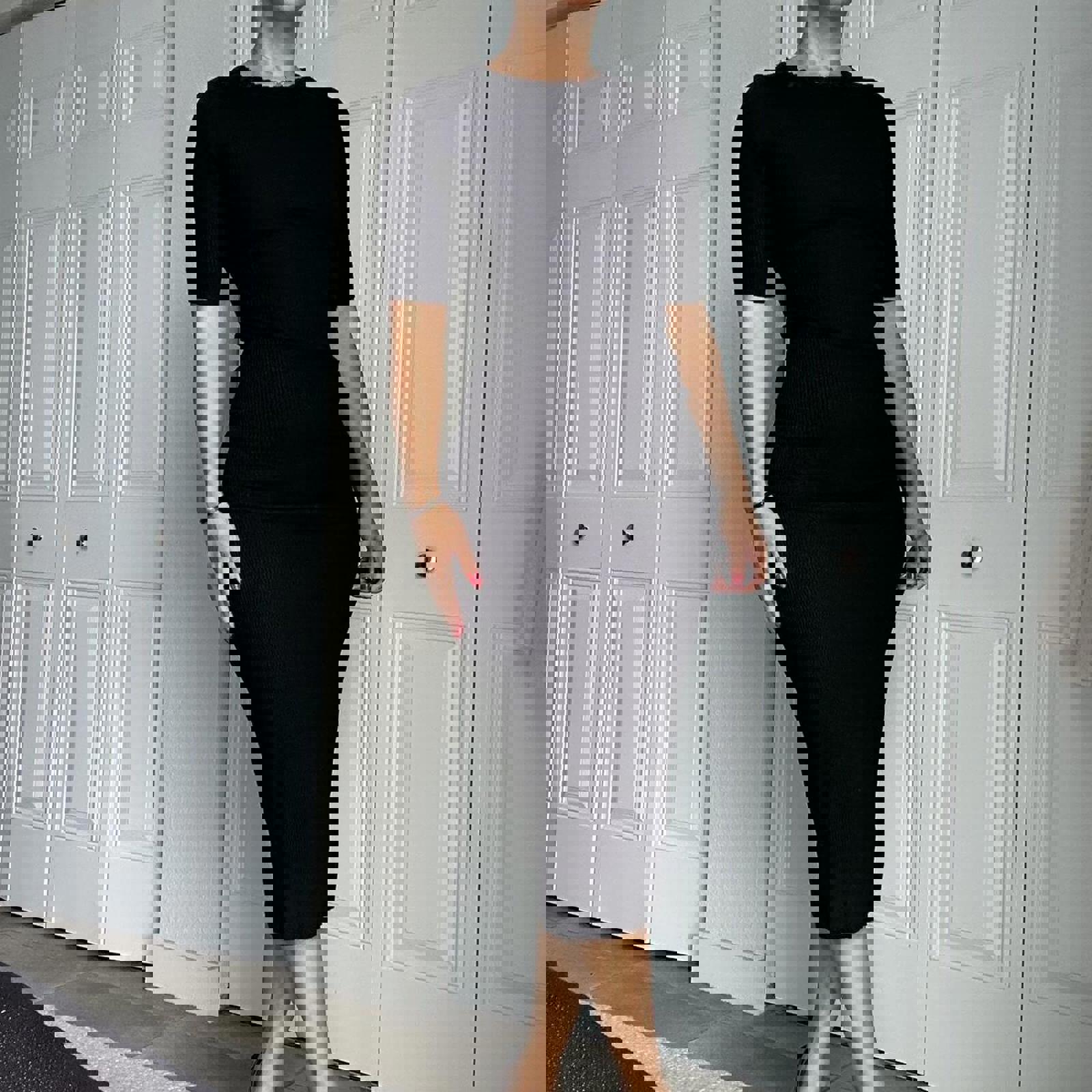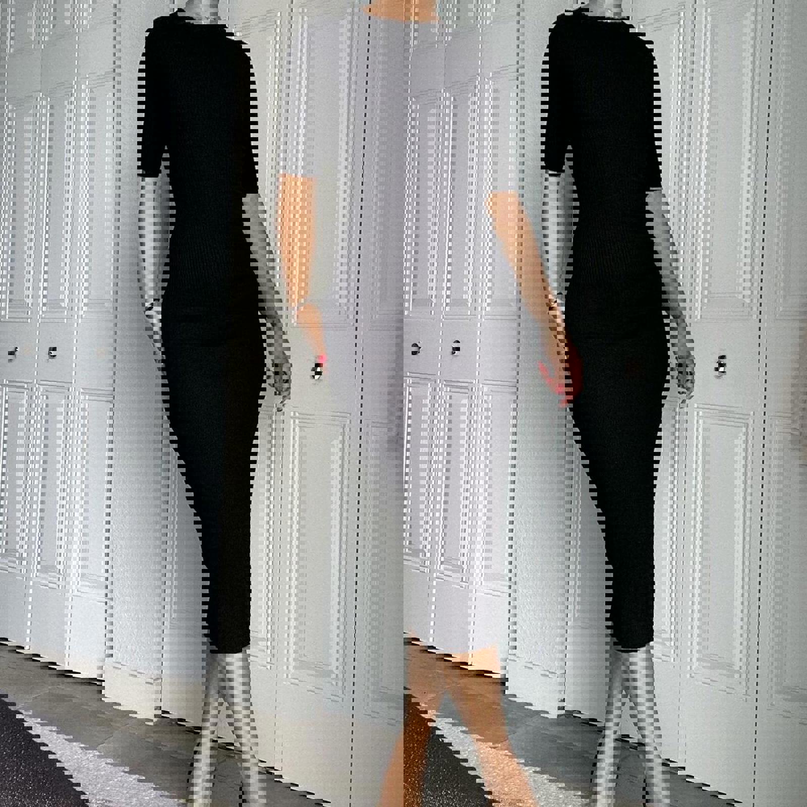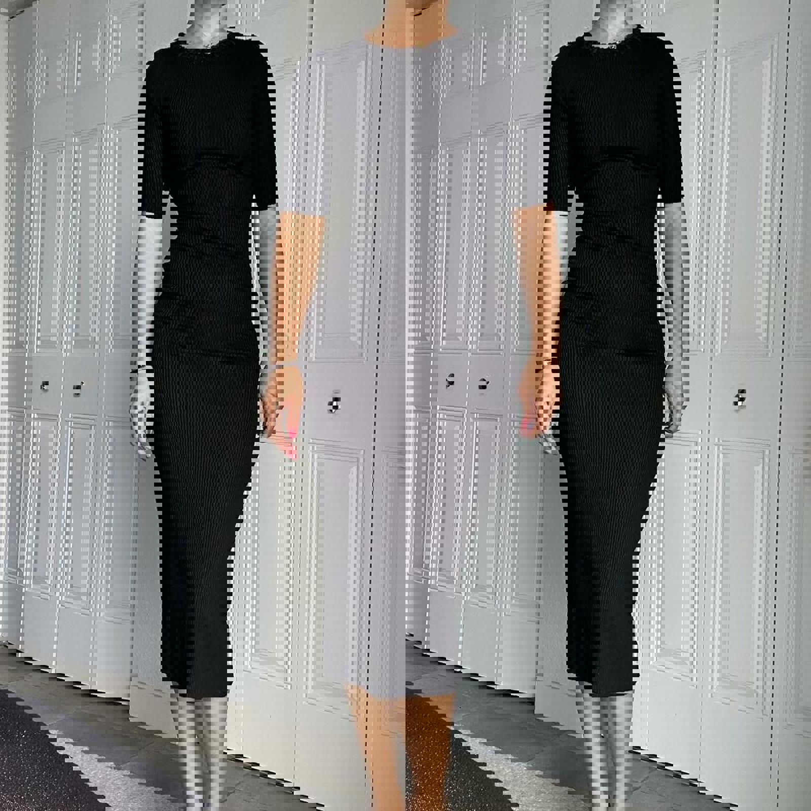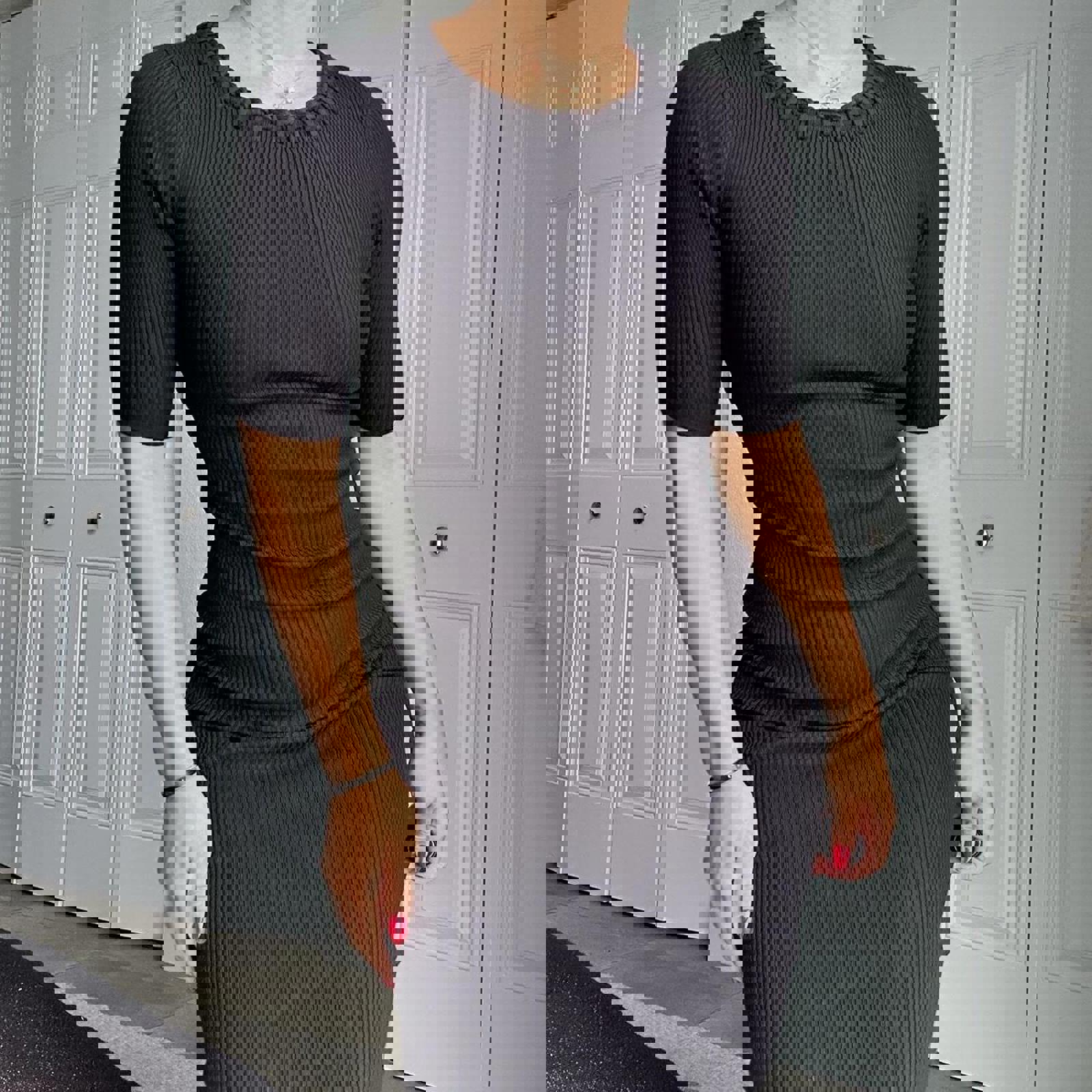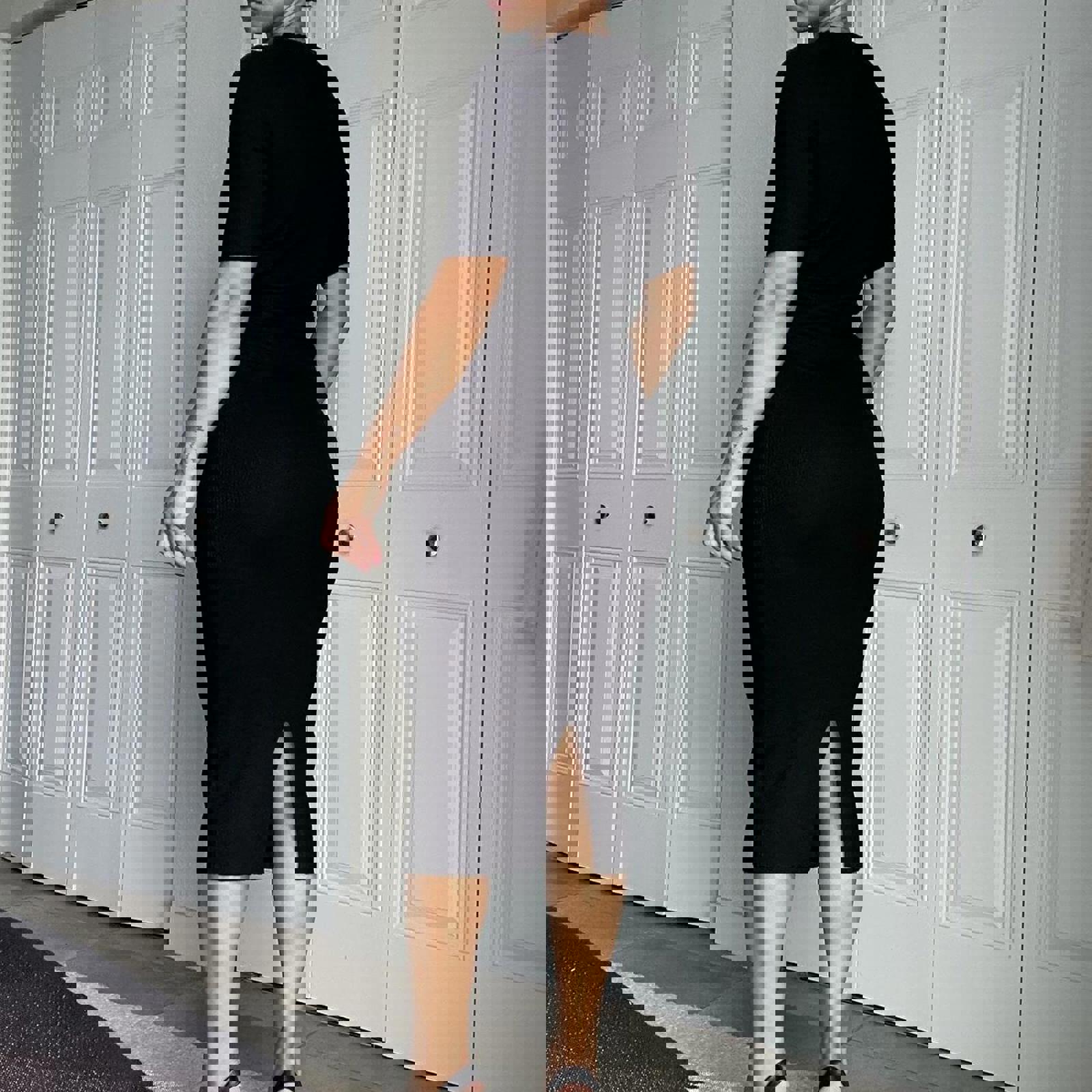 black midi dress, stretchy fabric, unique neckline, bodycon style, evening wear, formal dress, fitted silhouette, sophisticated, sleek, versatile