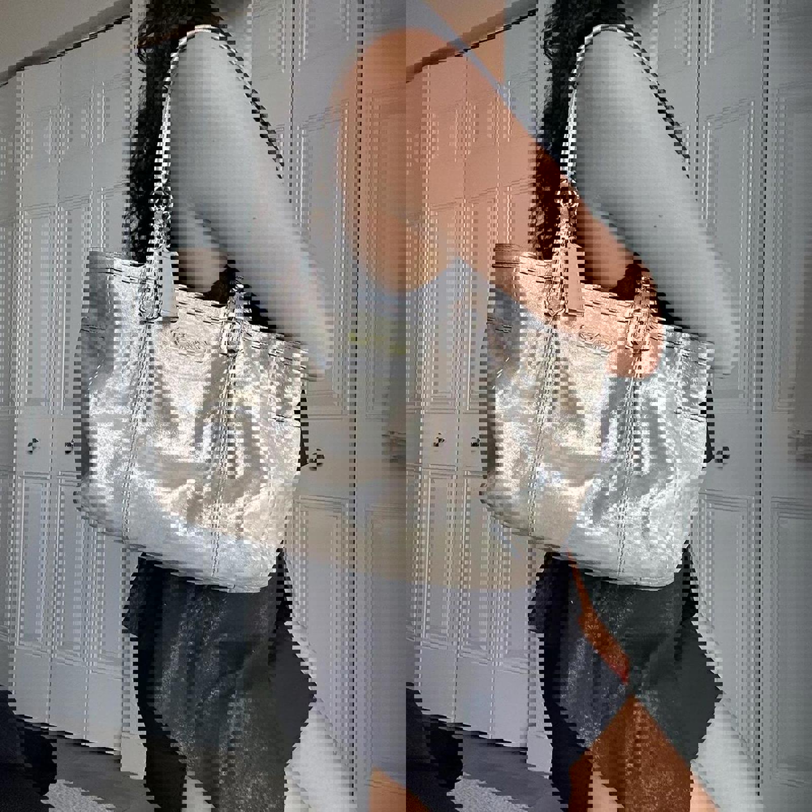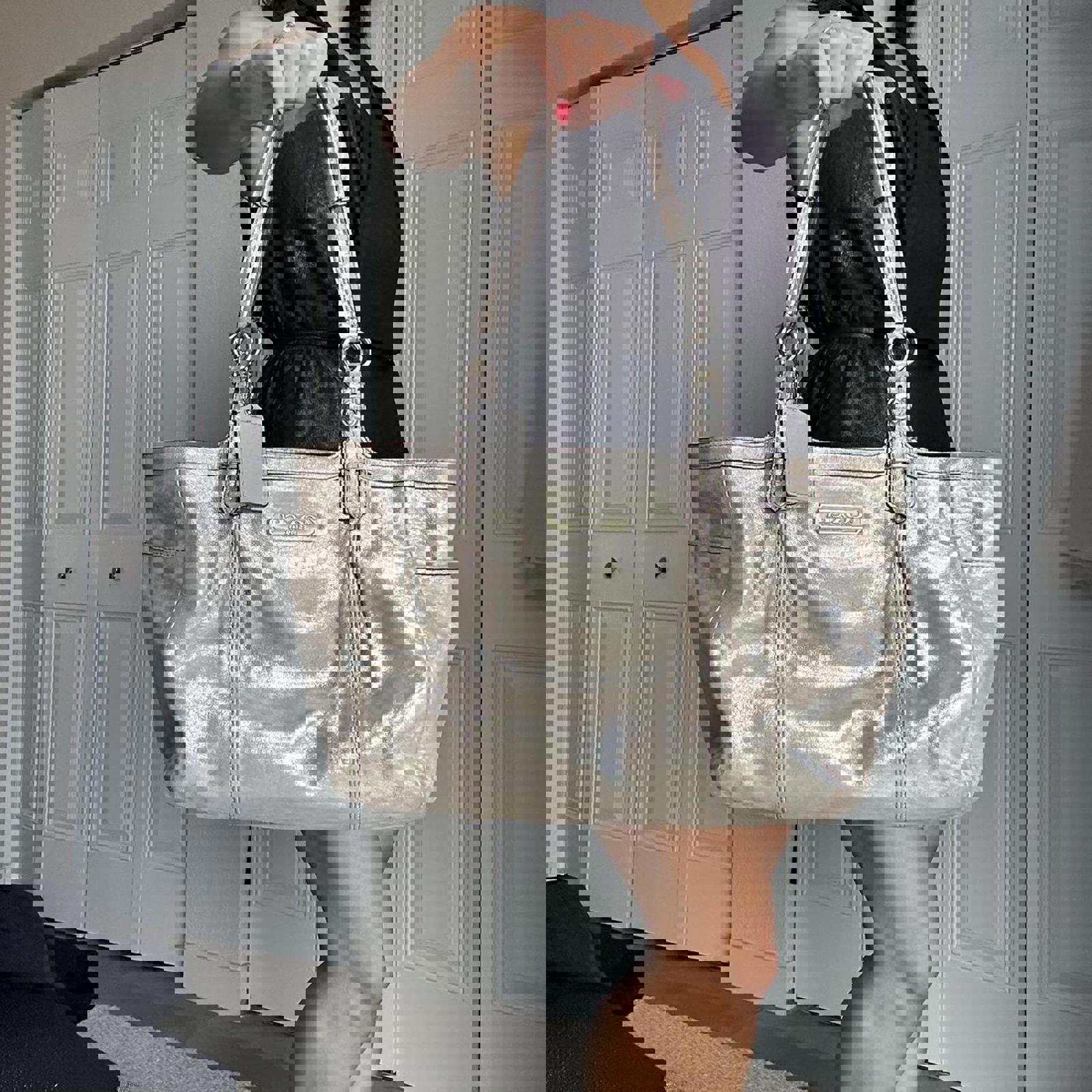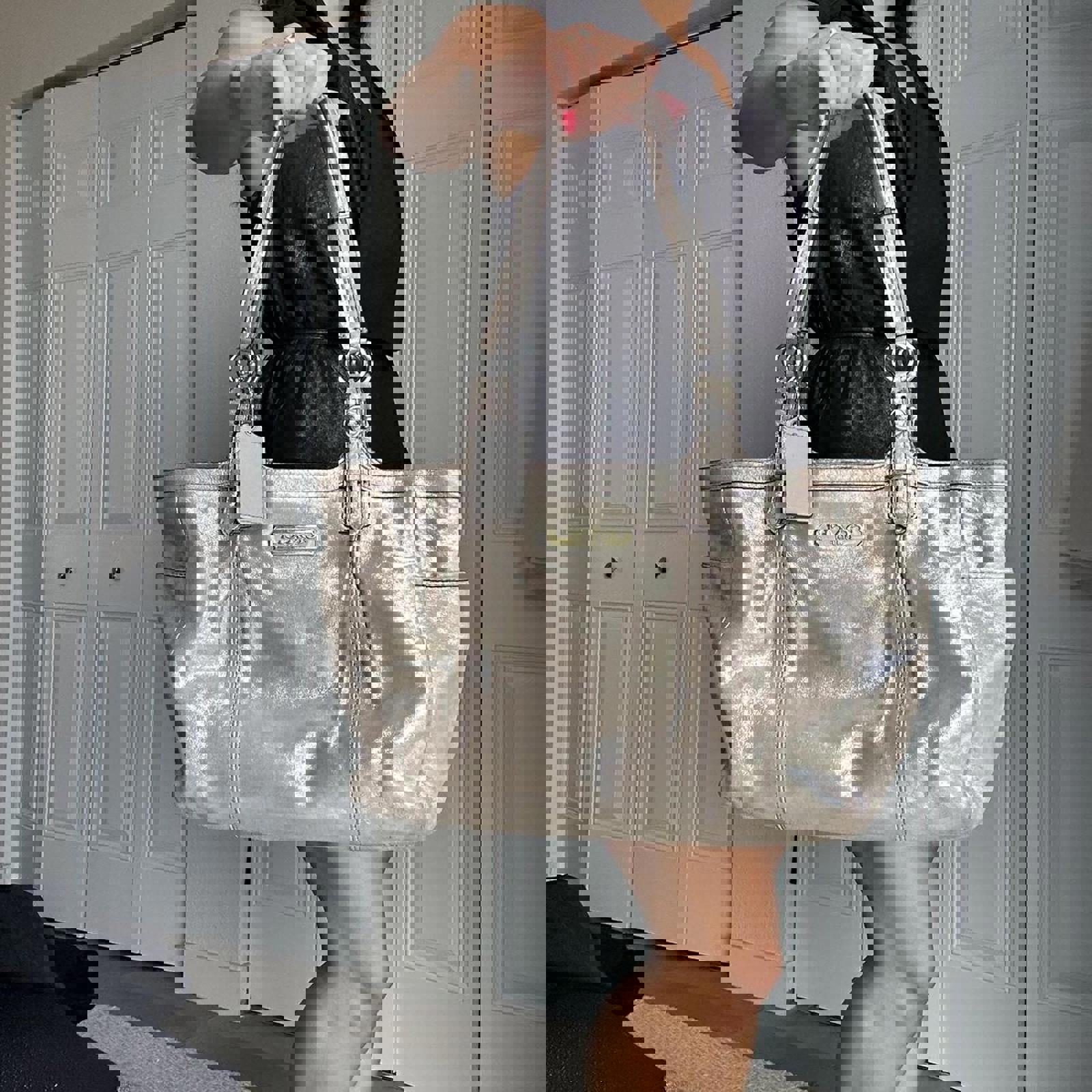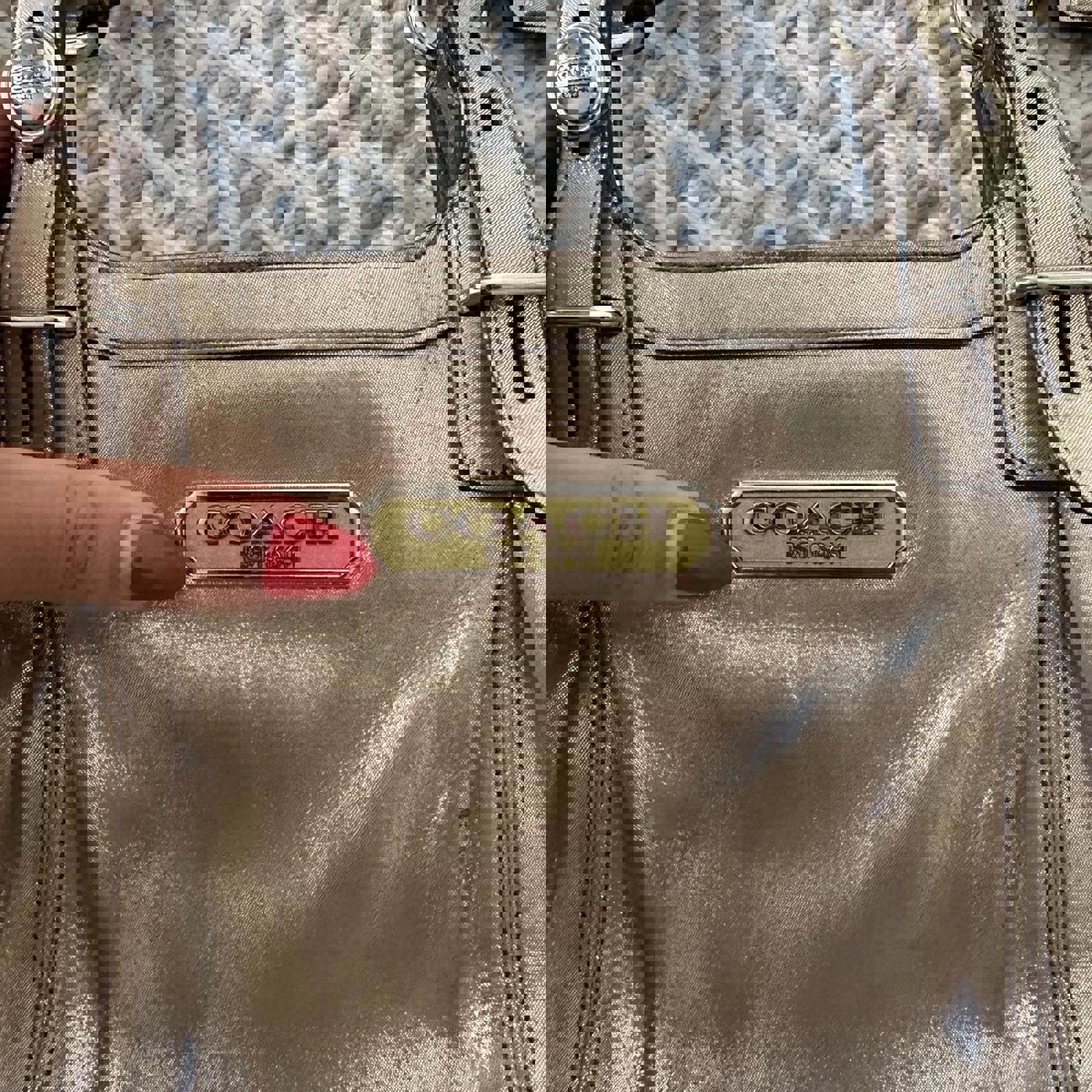 754. Gold coach bag with purple lining in a great vintage condition. Some flaws on the front which are shown. Measurements are listed below.