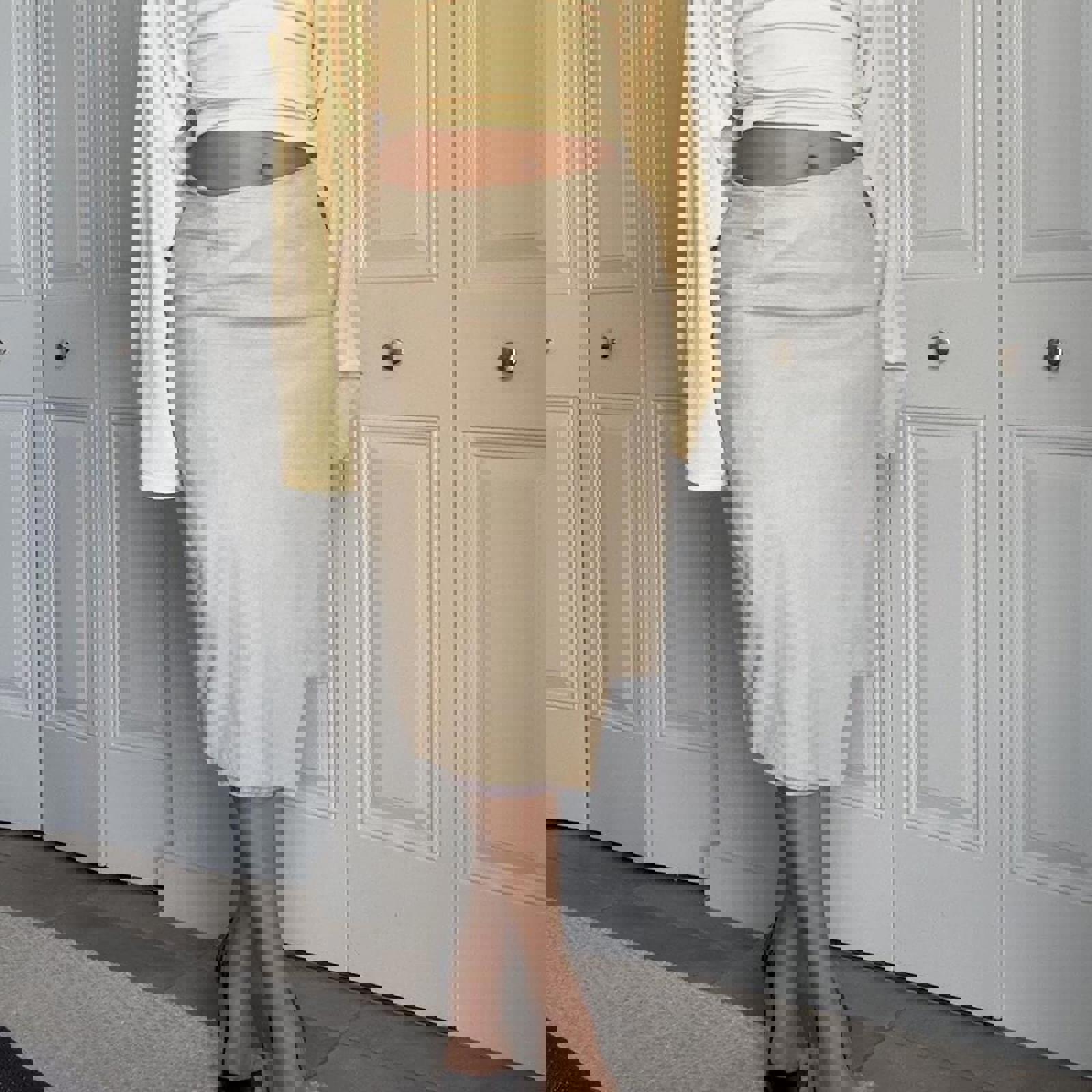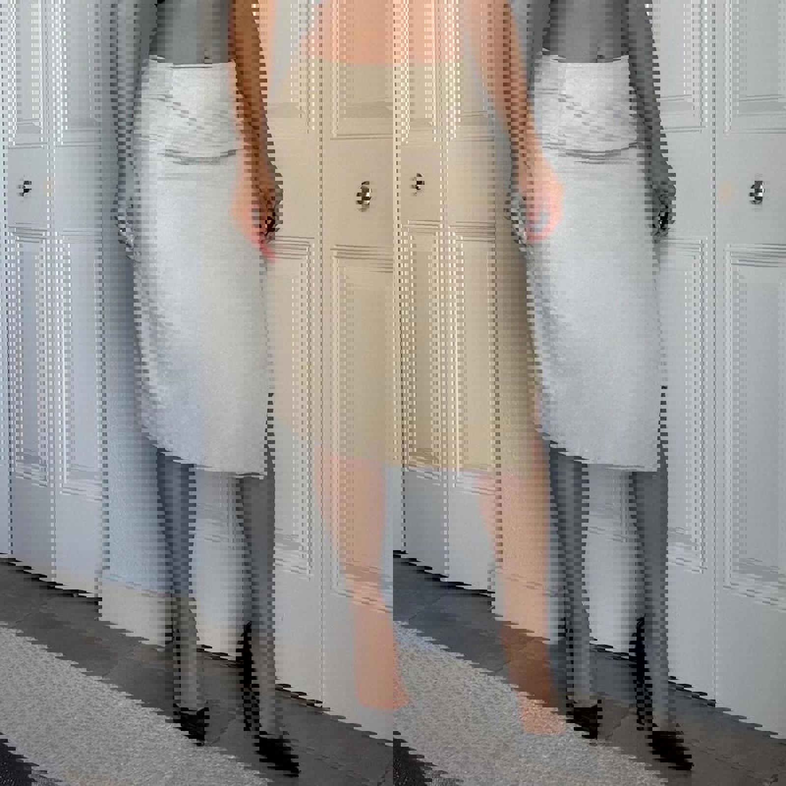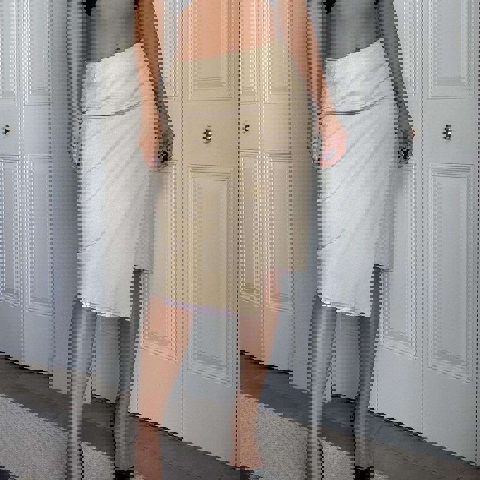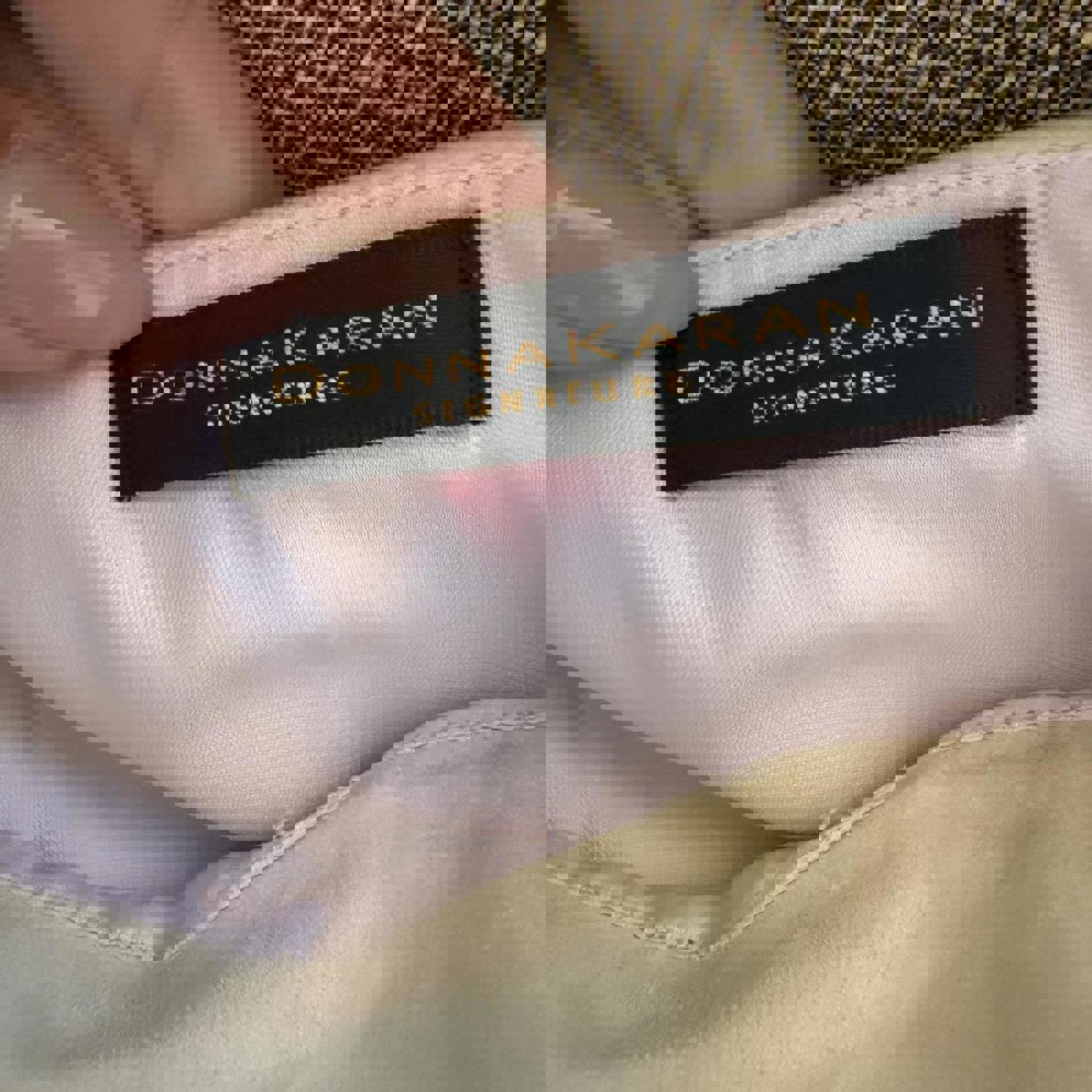 1003. Vintage Donna Karan 100% goat suede tan skirt with light pink/purple lining. Asymmetrical hem, perfect condition, no visible flaws. Measurements laying flat are listed below: