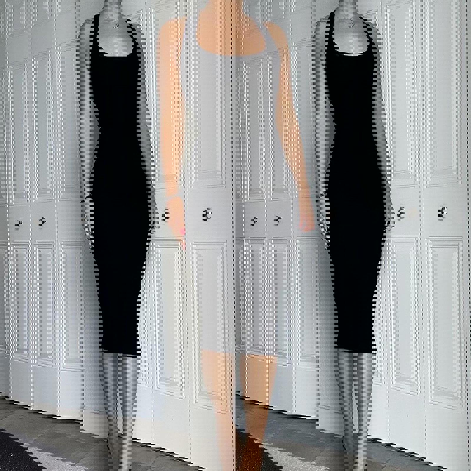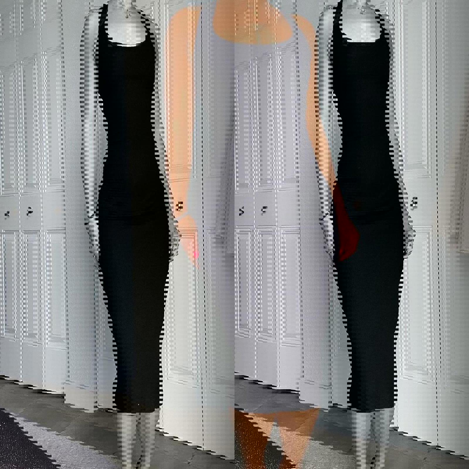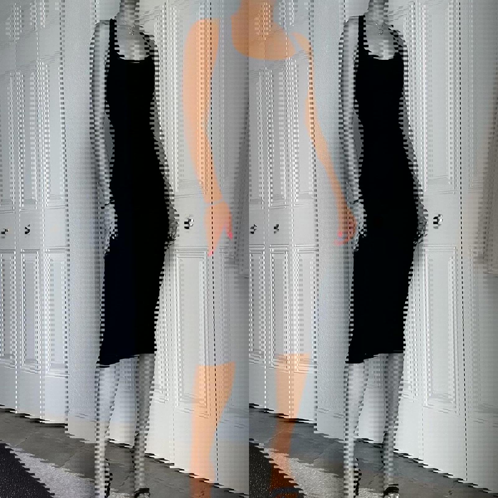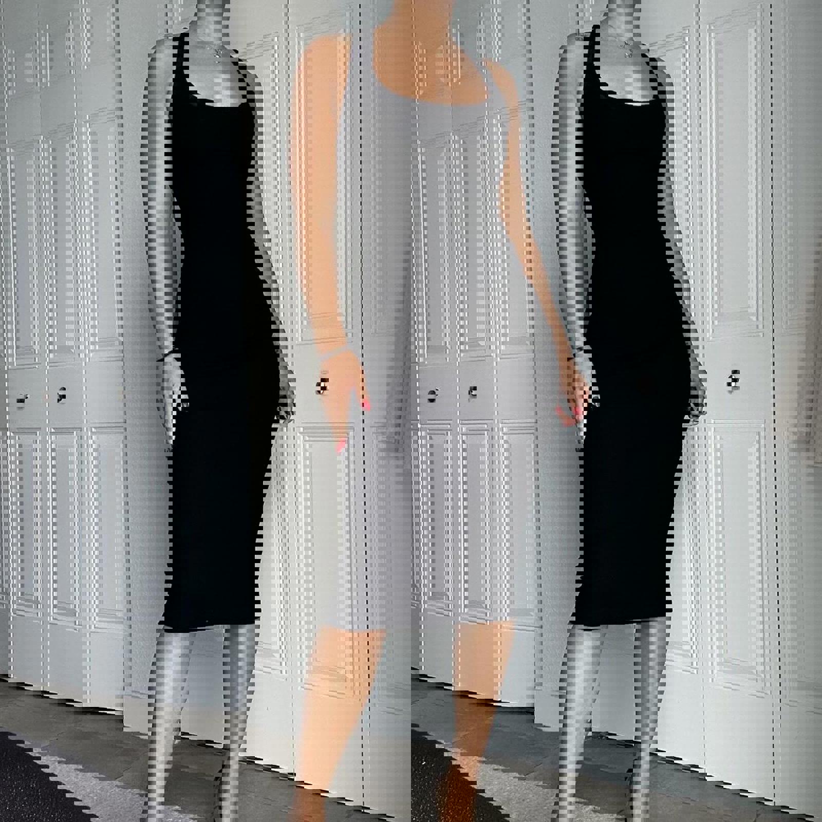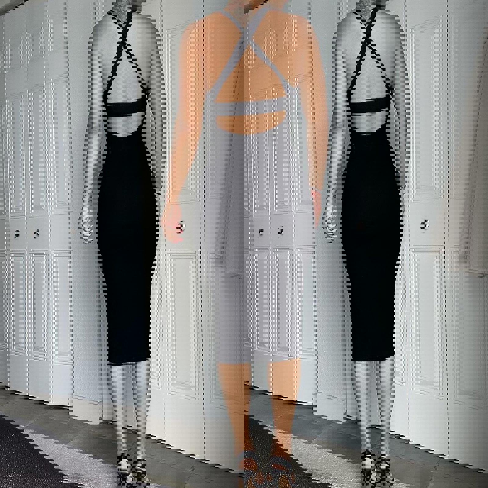 black, bodycon, midi dress, crossback, sleeveless, minimalist, stretch fabric, elegant, fitted, sophisticated