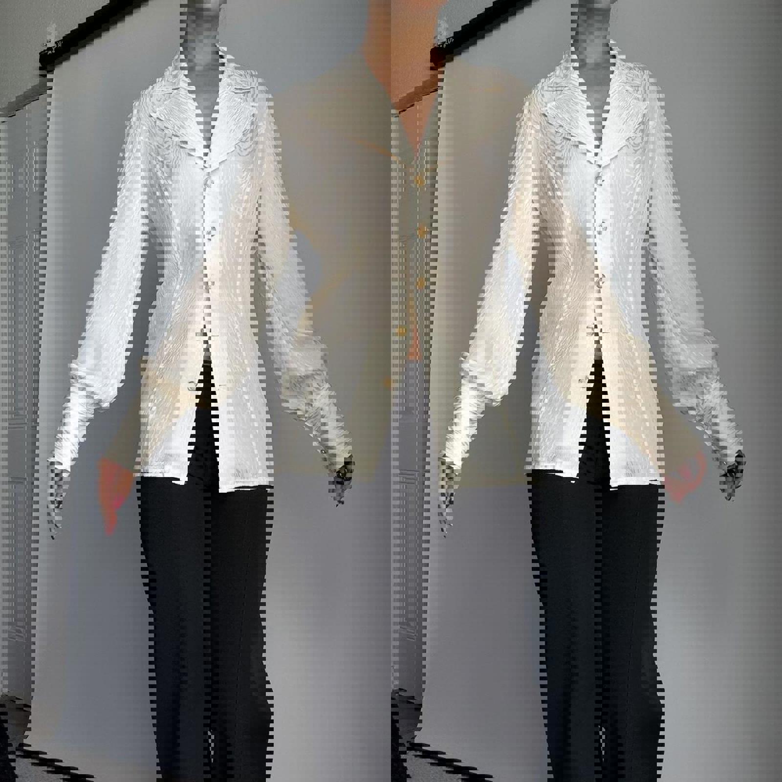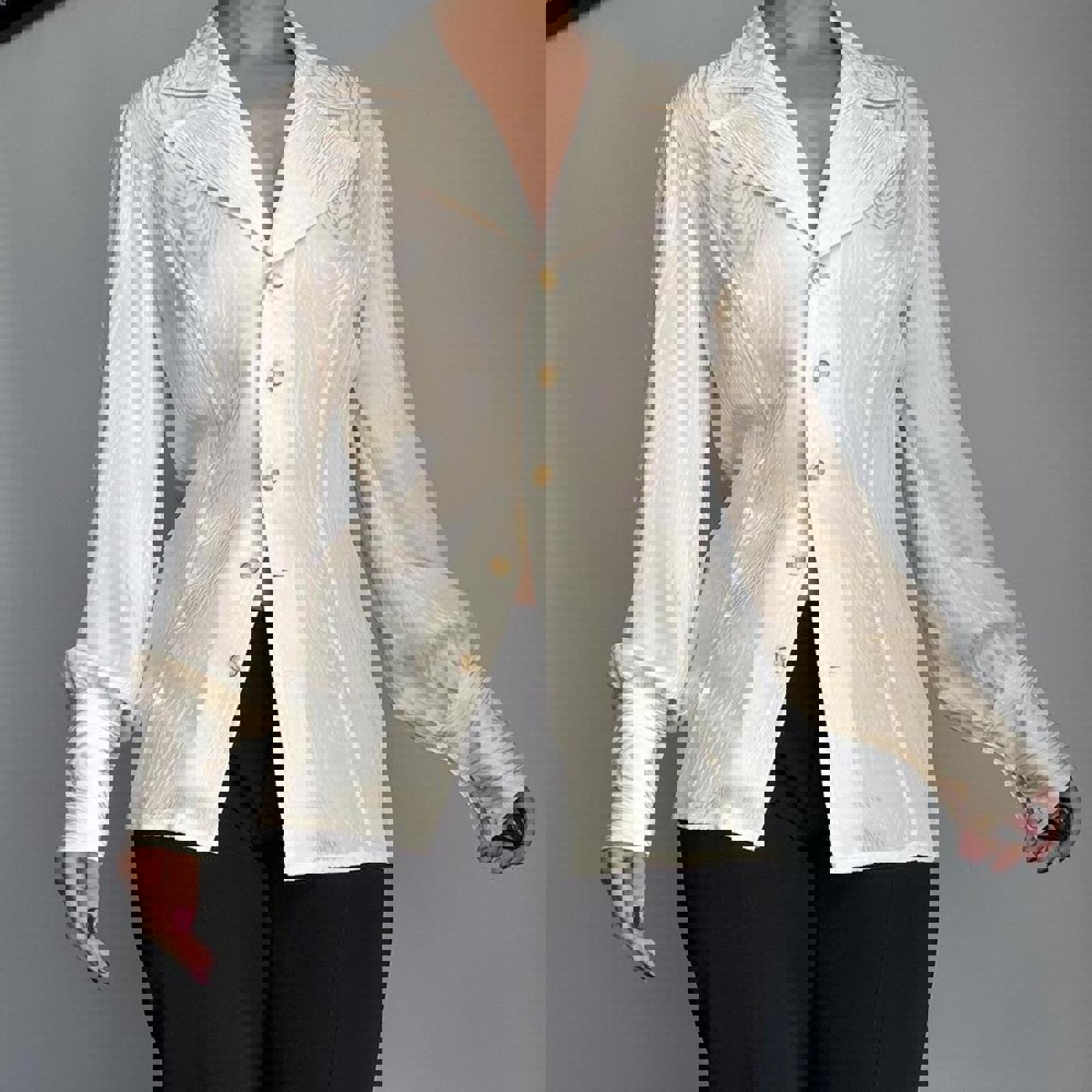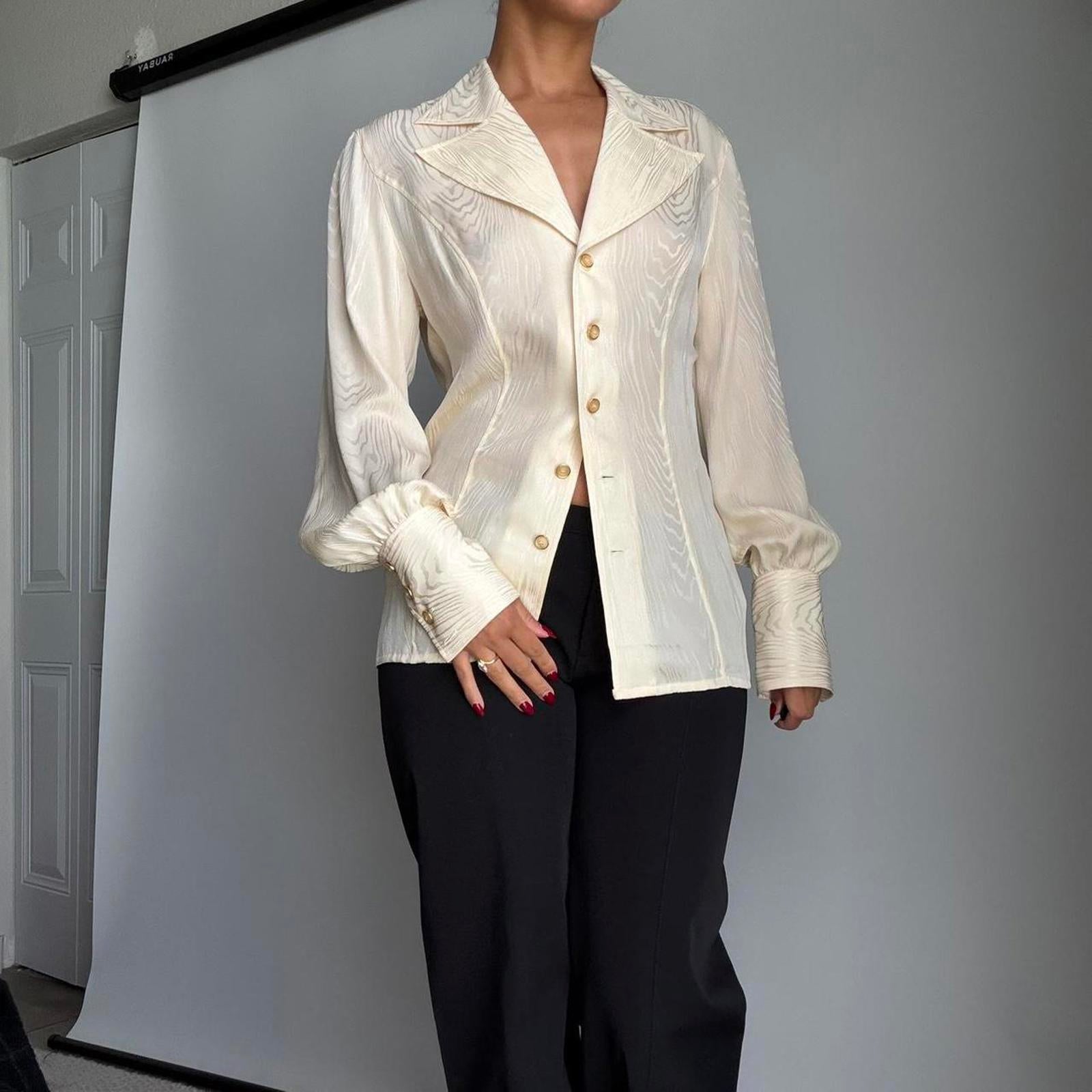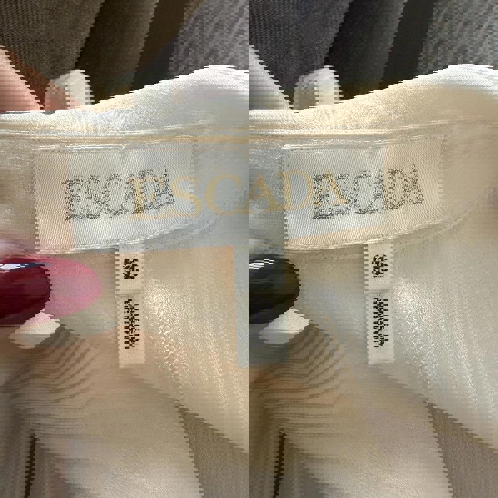916. Vintage Escada cream 100% silk collared top in perfect condition. Labeled a size 36, it fits like a small. However, measurements are listed below.