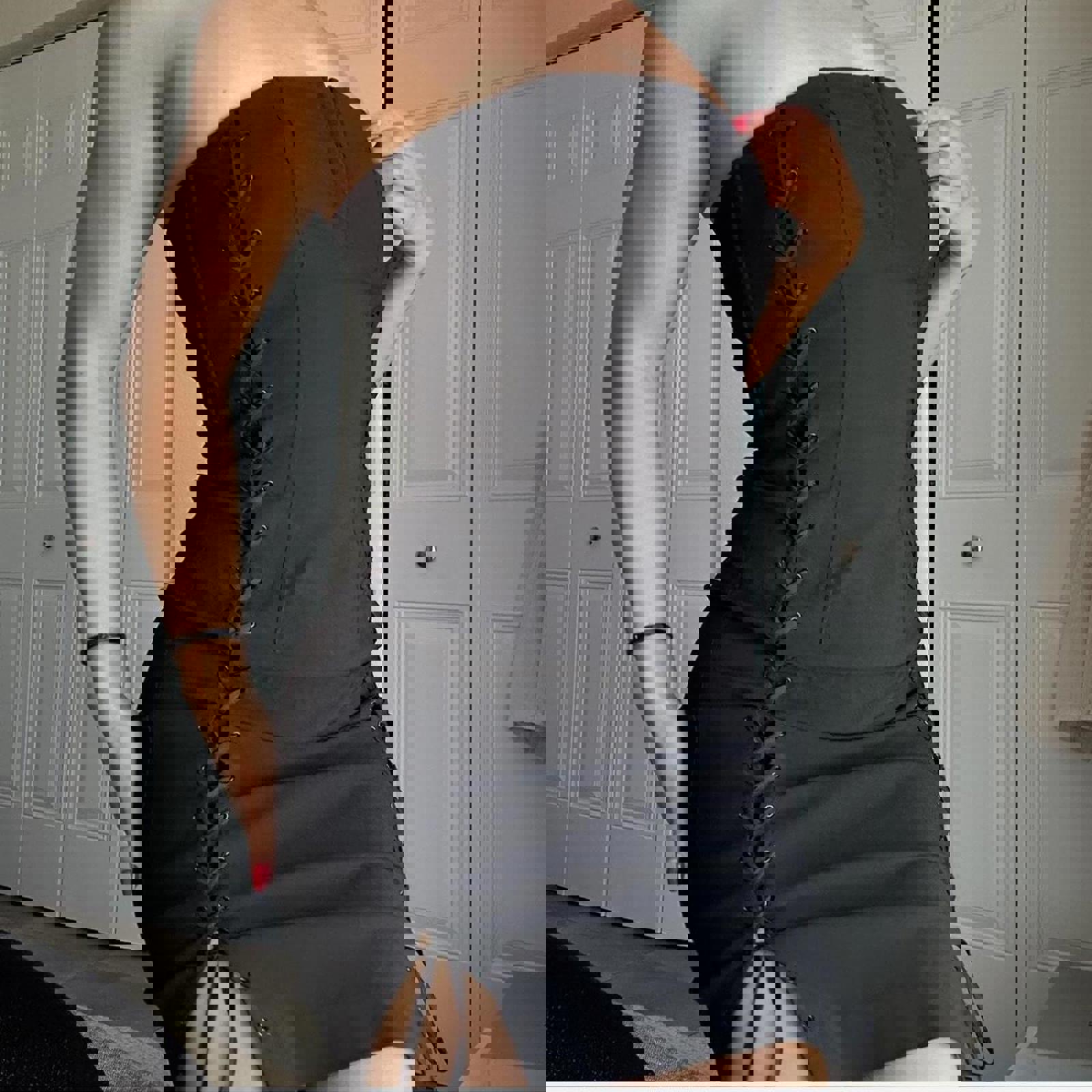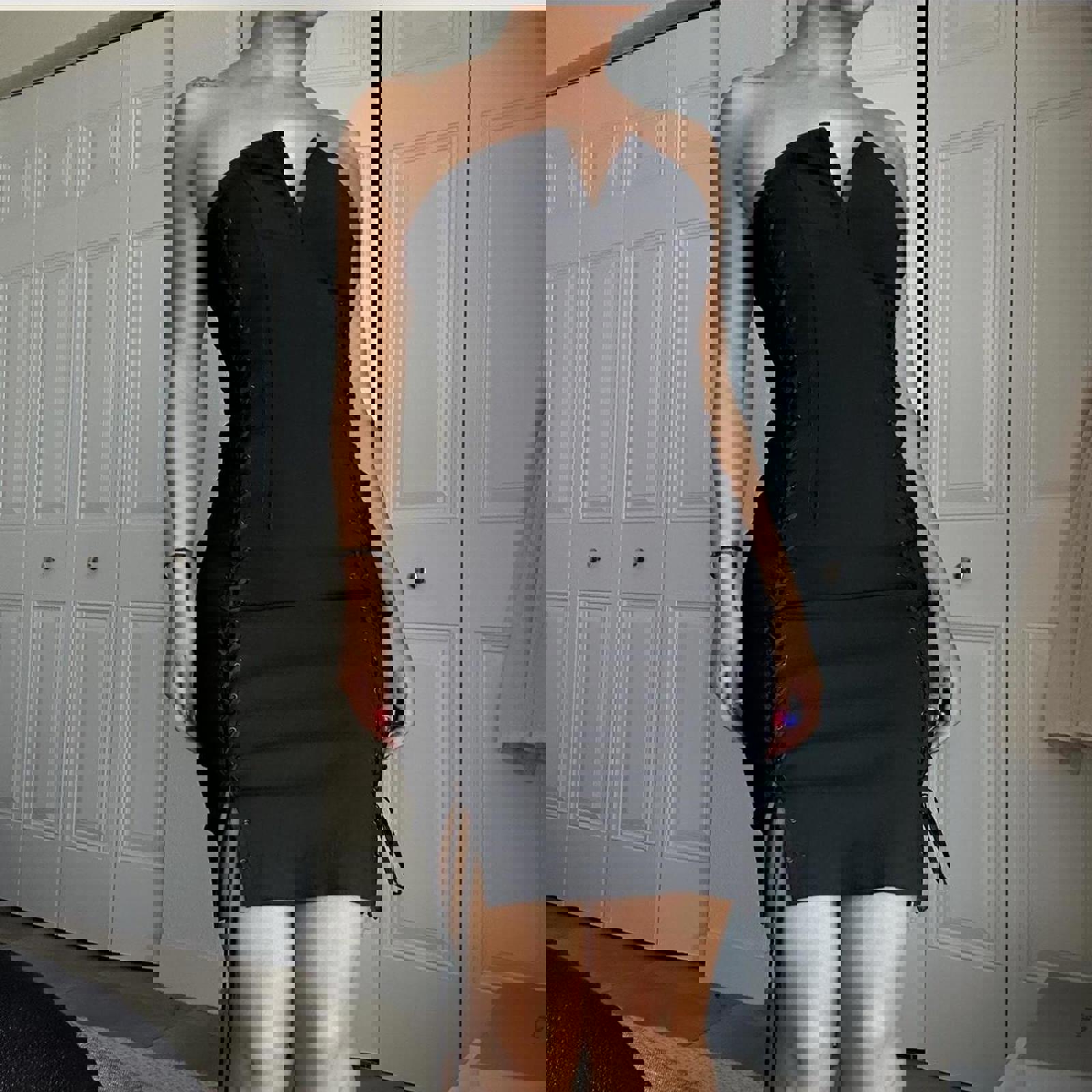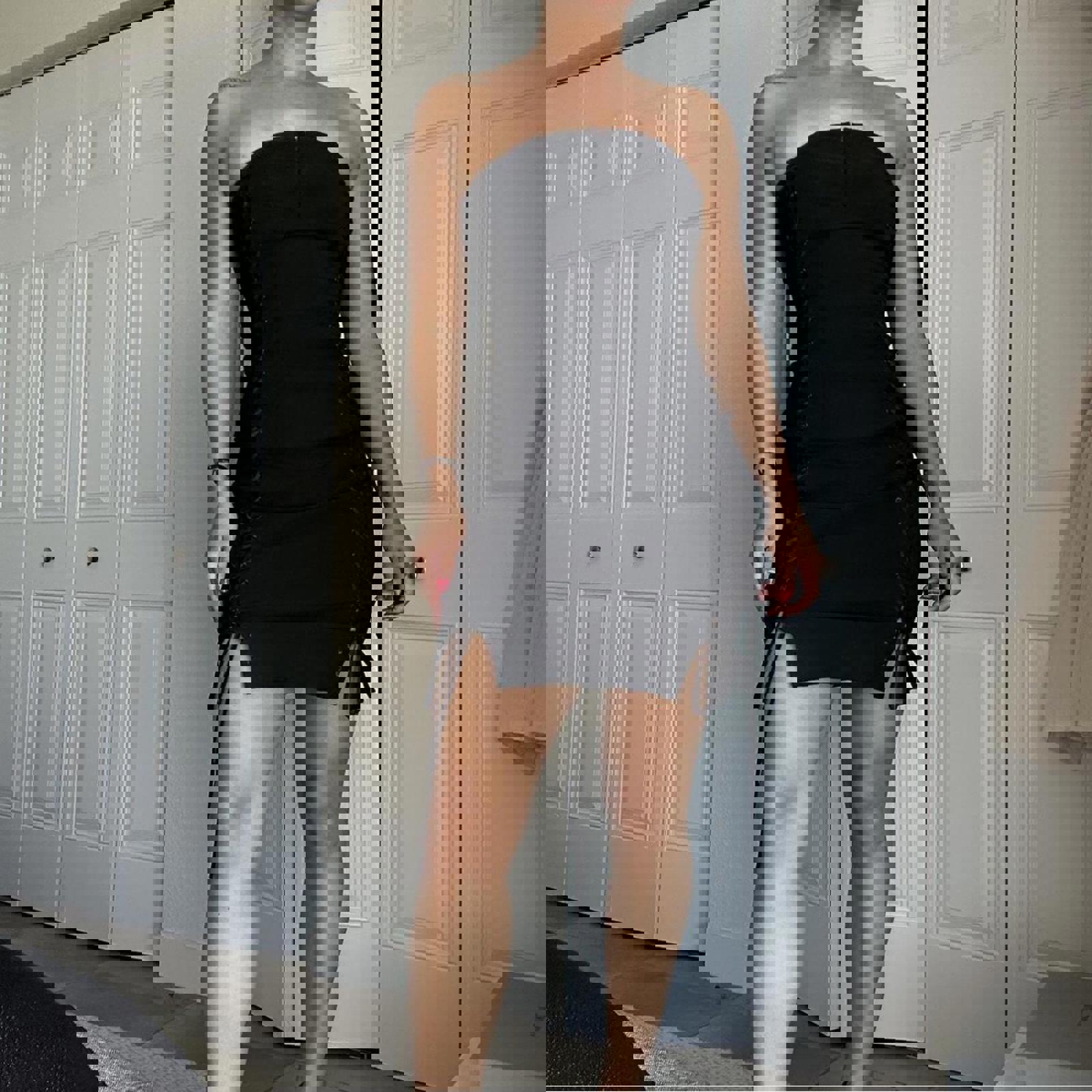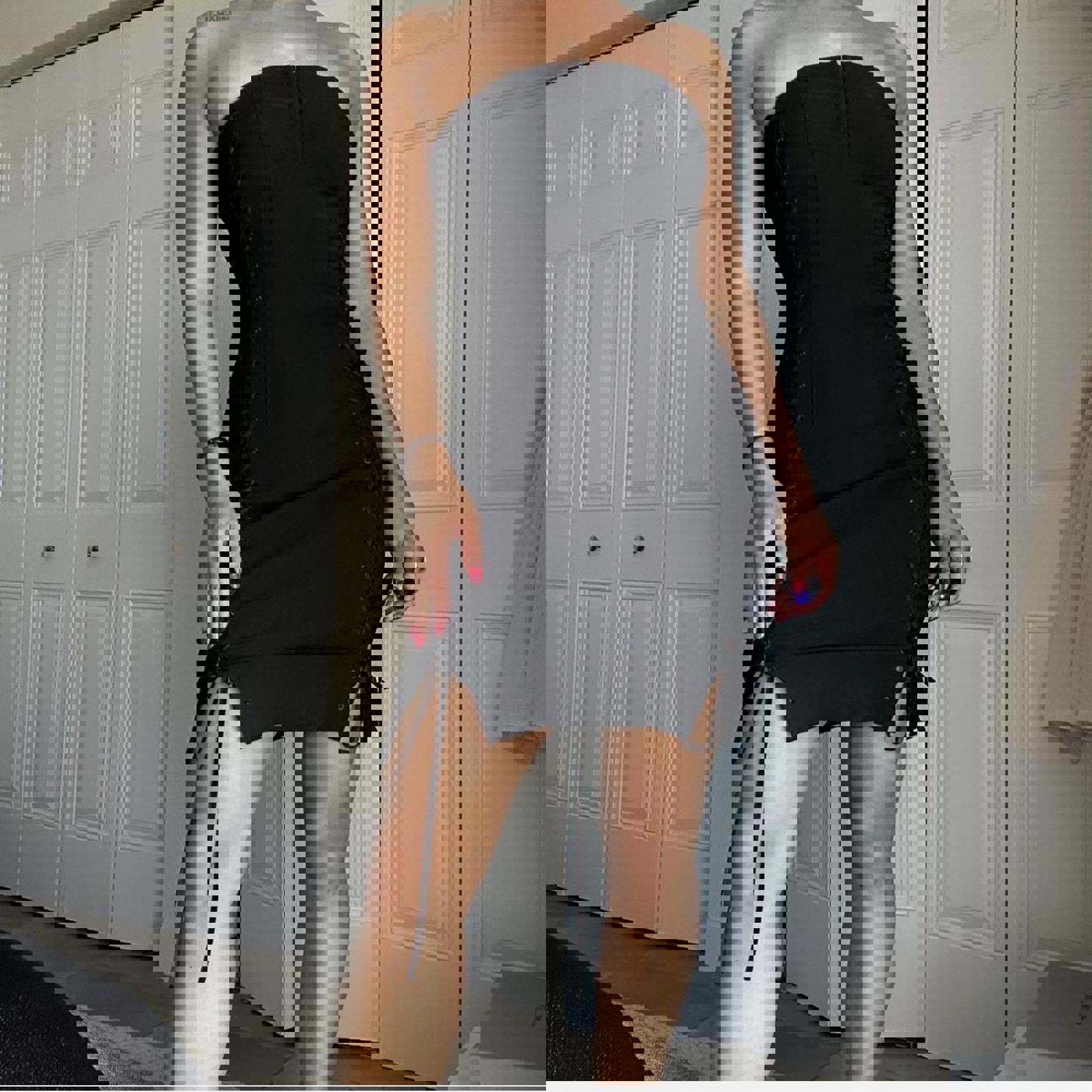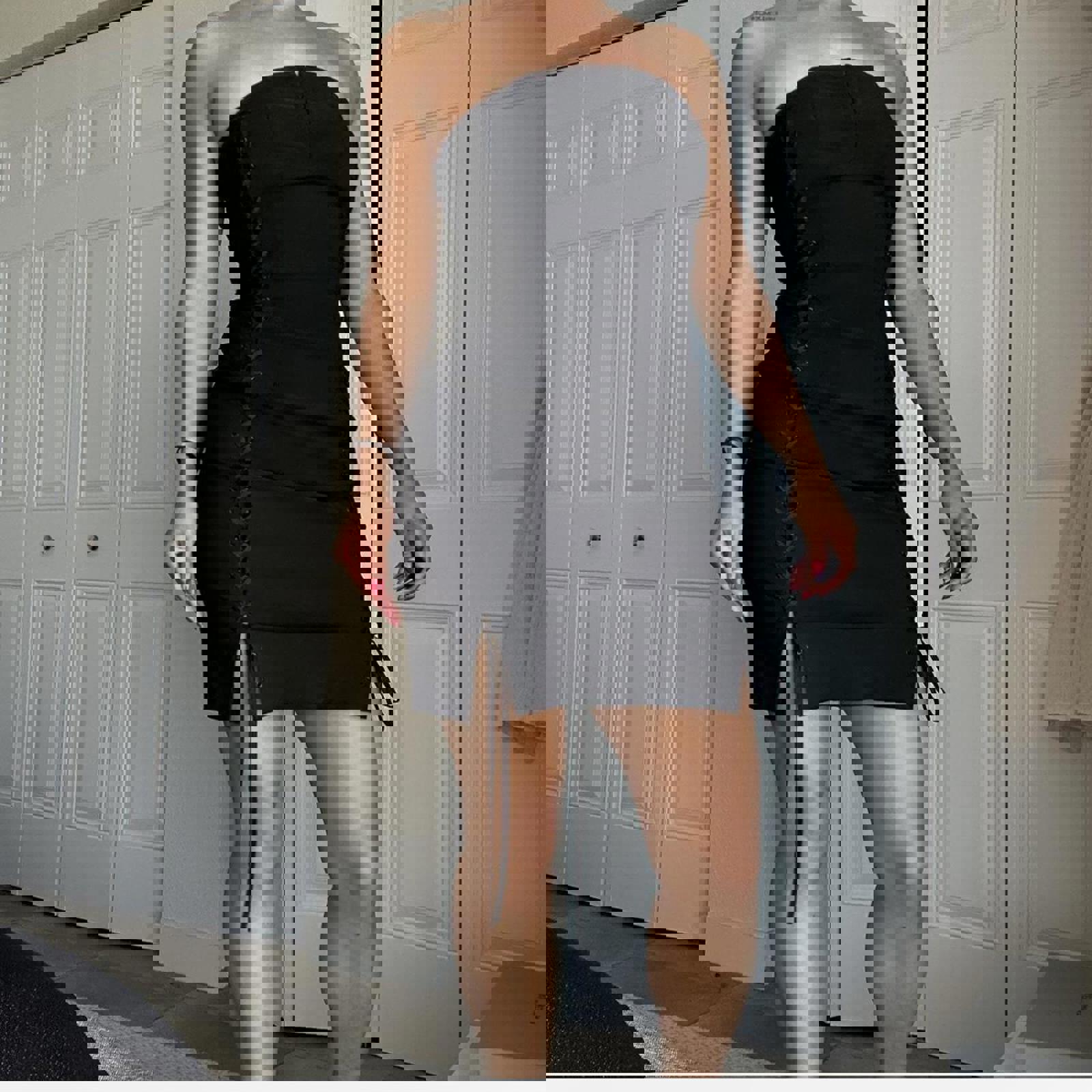 230. Express black lace up dress on both sides with eyelet clasp at front and invisible zipper in the back. Labeled a size 1/2 I would say it fits like a small or extra small. The material really doesn’t have any stretch but you could unlace it a little bit