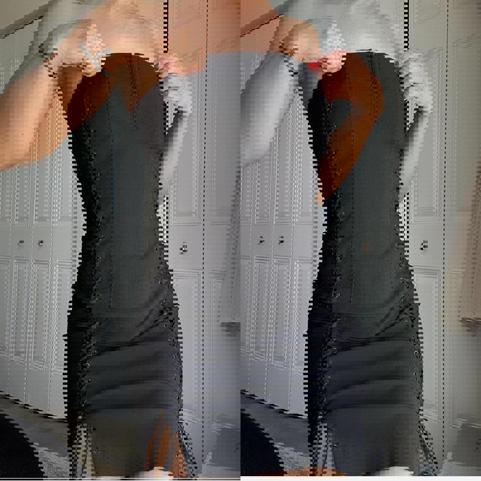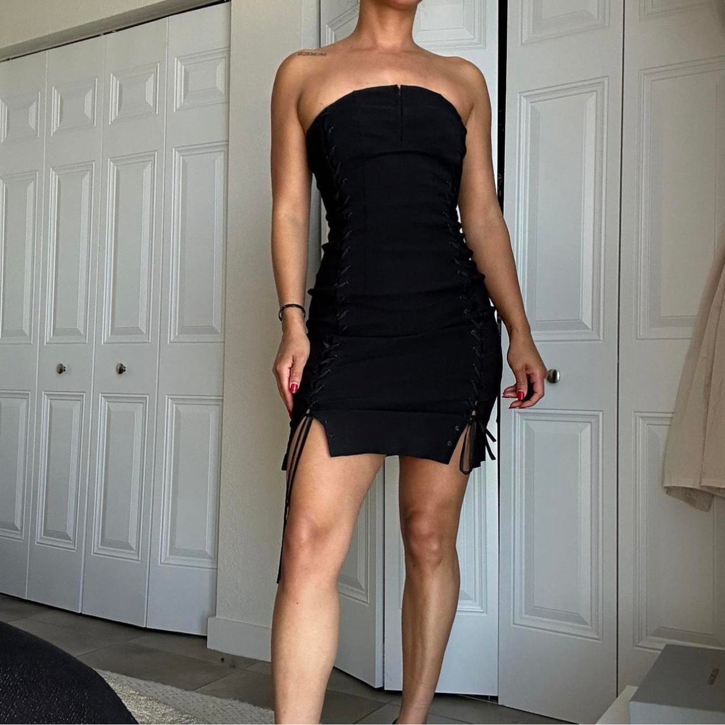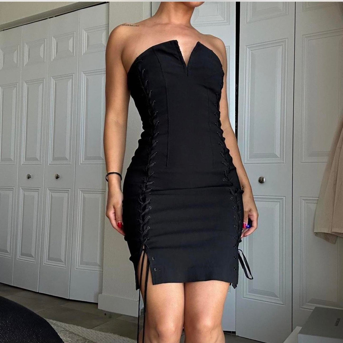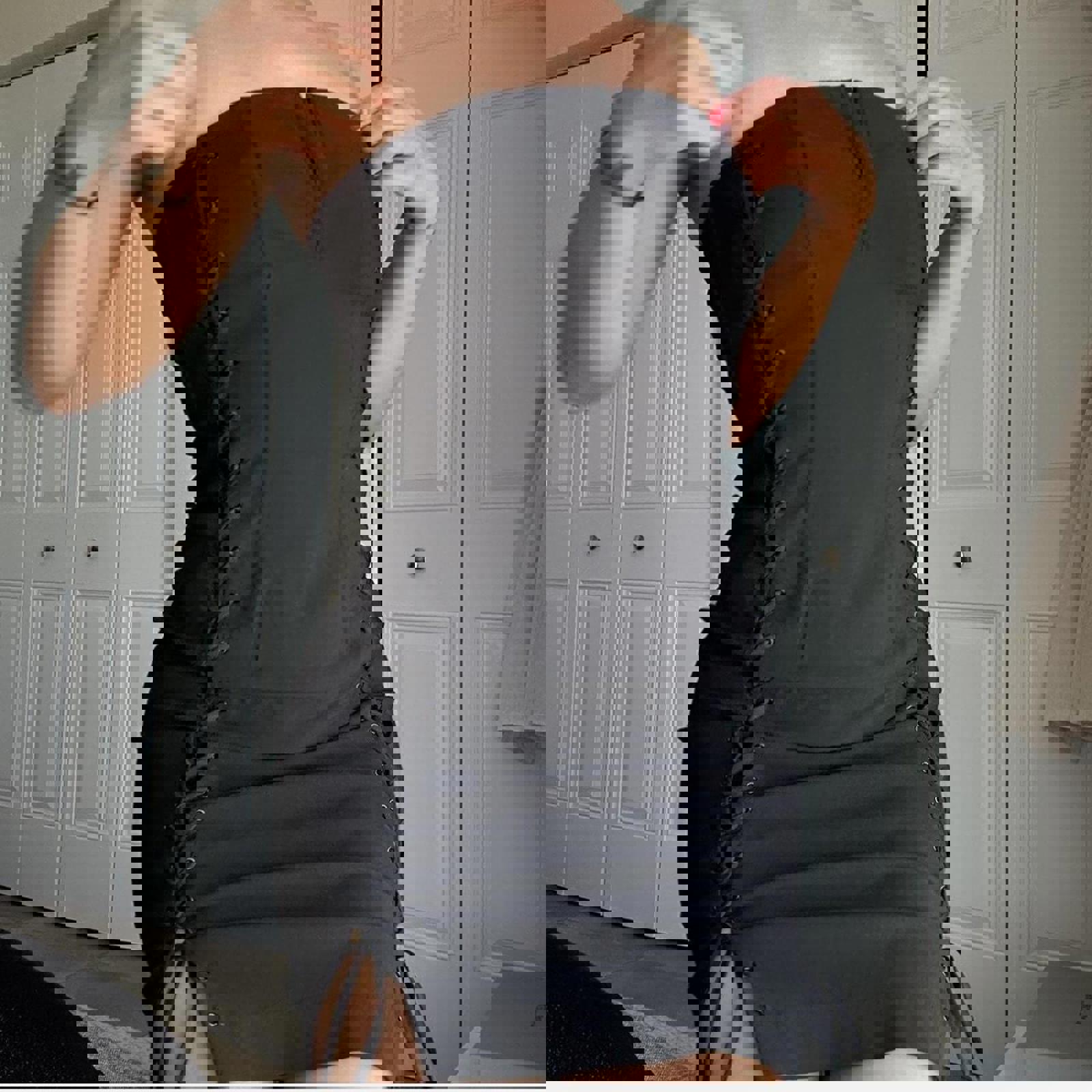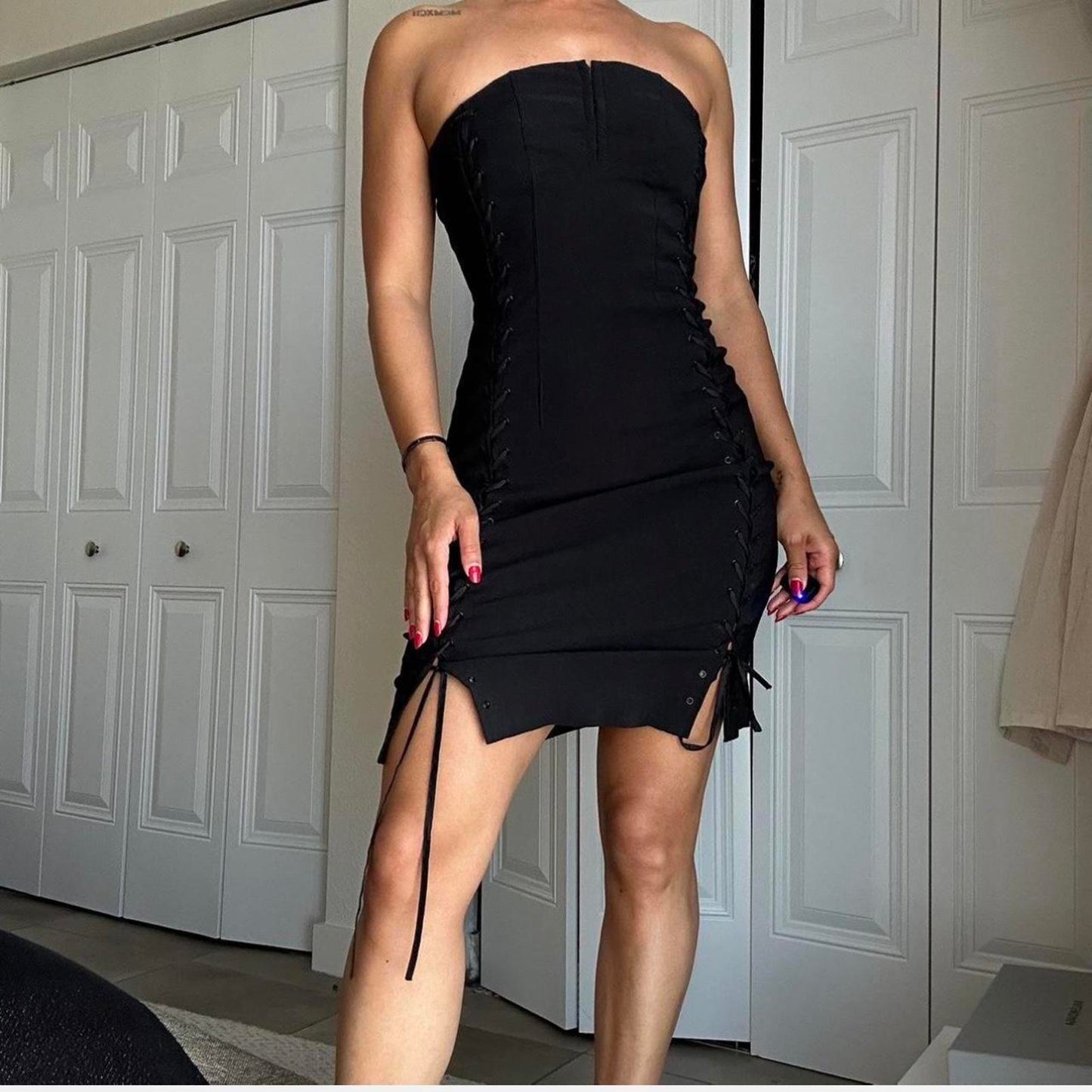 230. Express black lace up dress on both sides with eyelet clasp at front and invisible zipper in the back. Labeled a size 1/2 I would say it fits like a small or extra small. The material really doesn’t have any stretch but you could unlace it a little bit