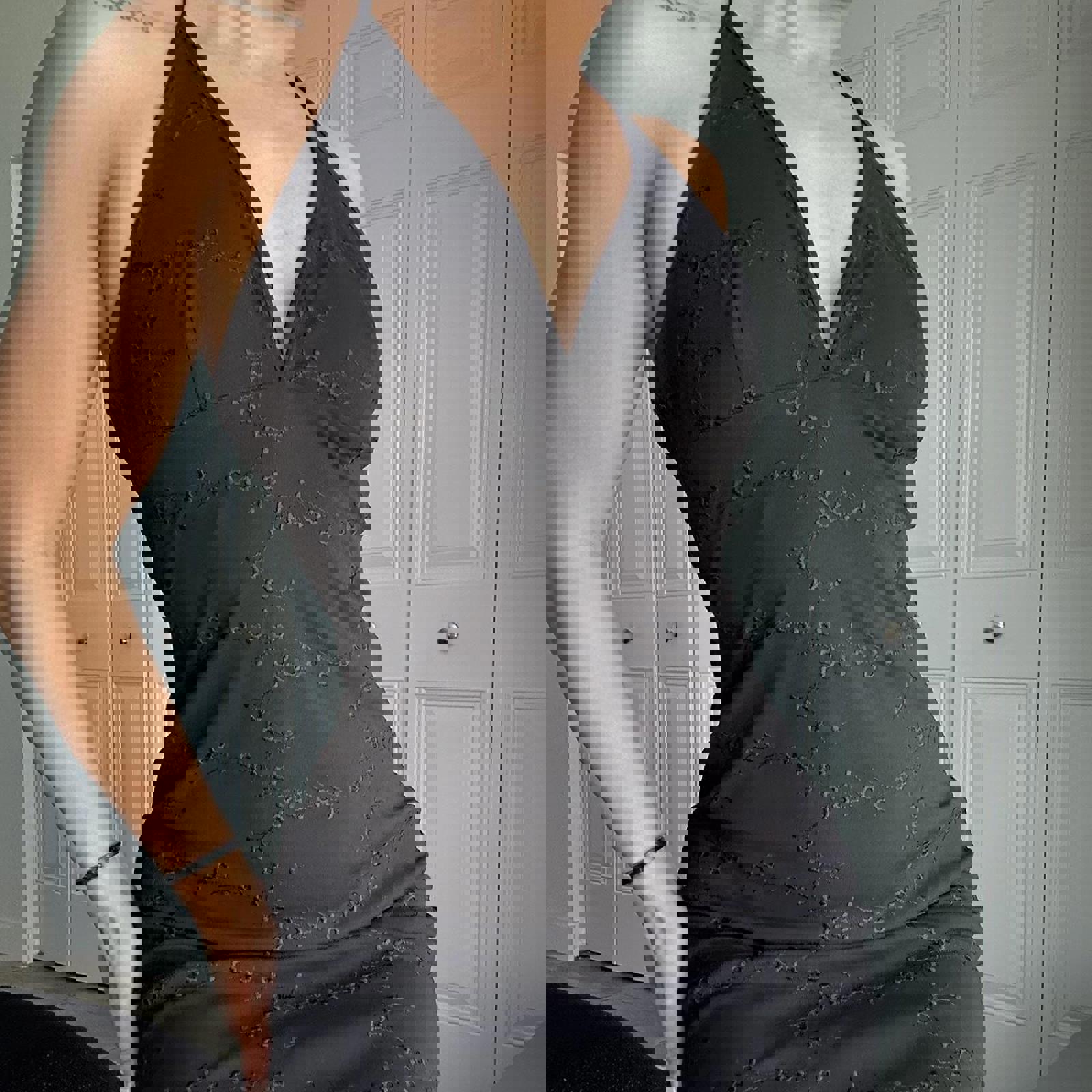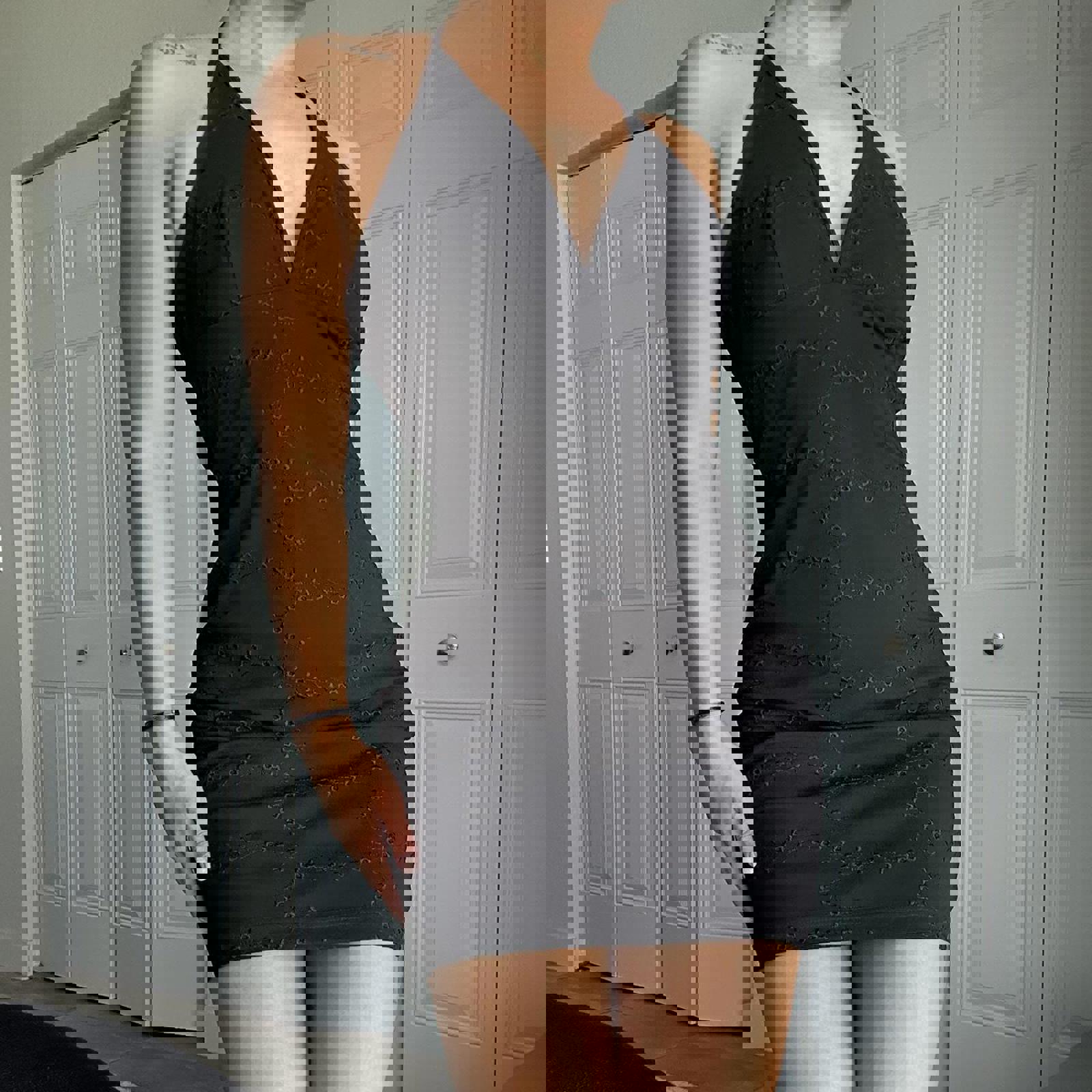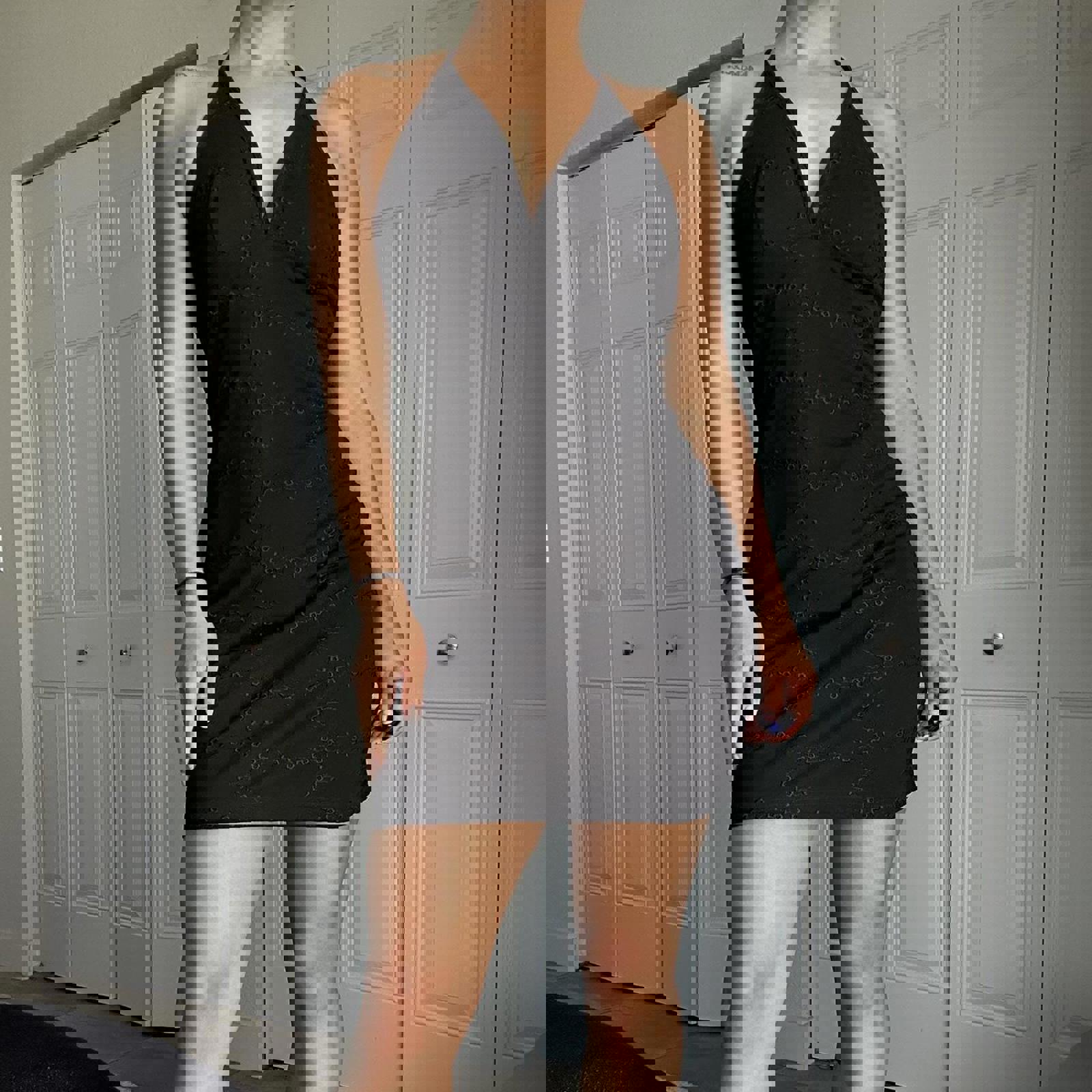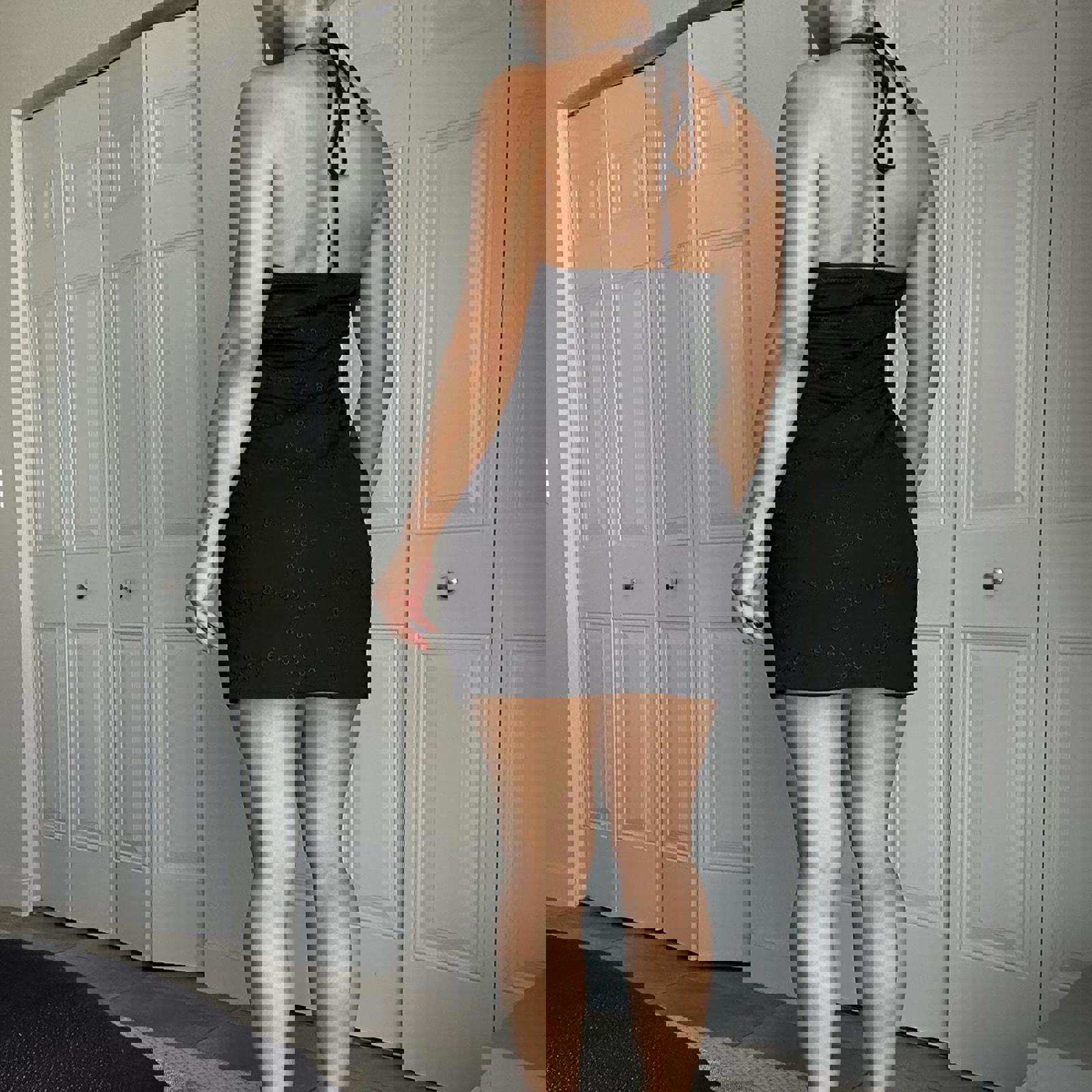 105. Vintage mini halter dress with flower print all over! The perfect black dress. In excellent condition it is a size medium but could also fit a size small. Brand is hourglass