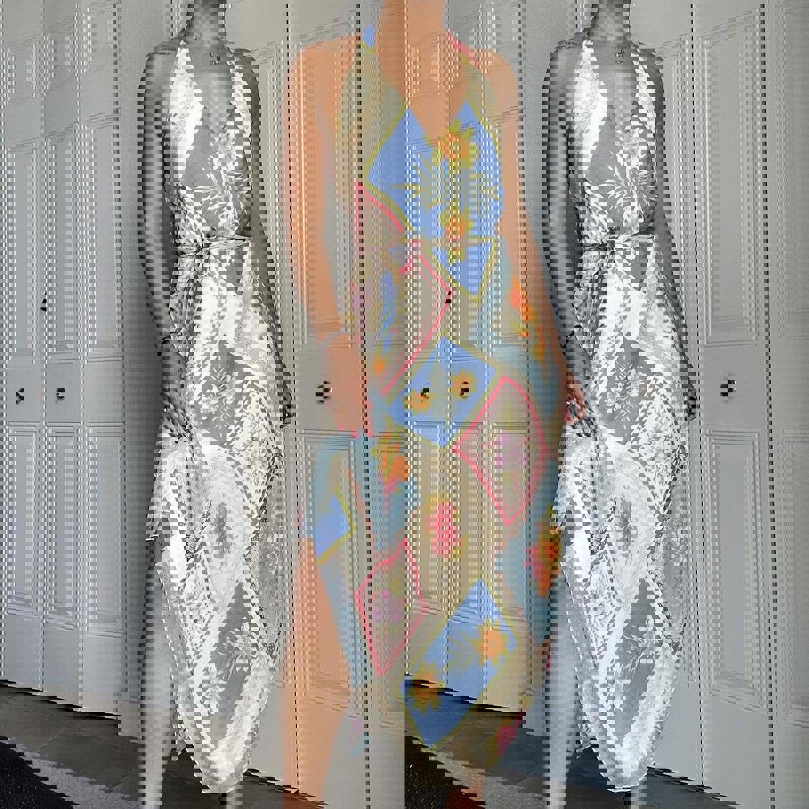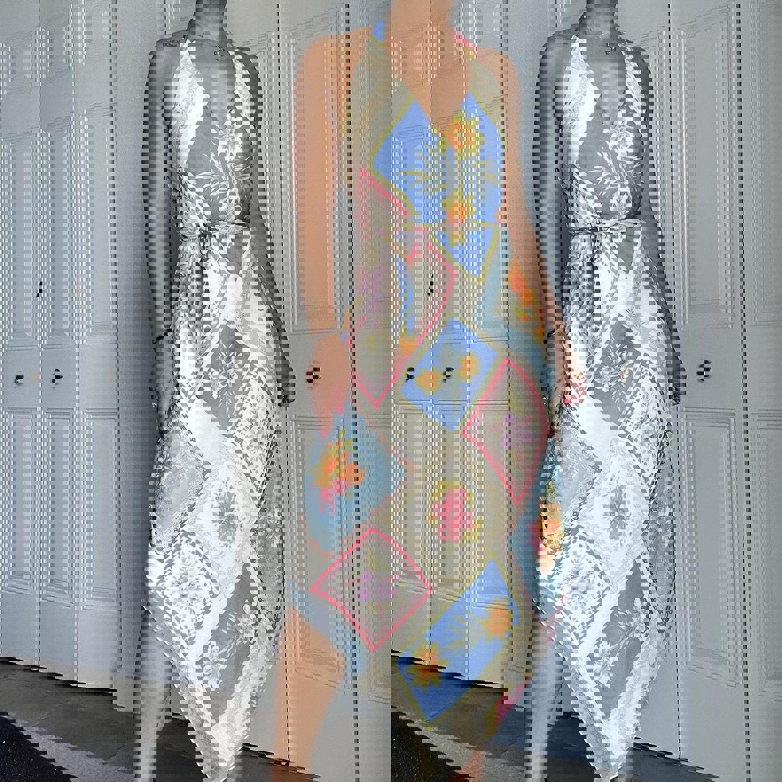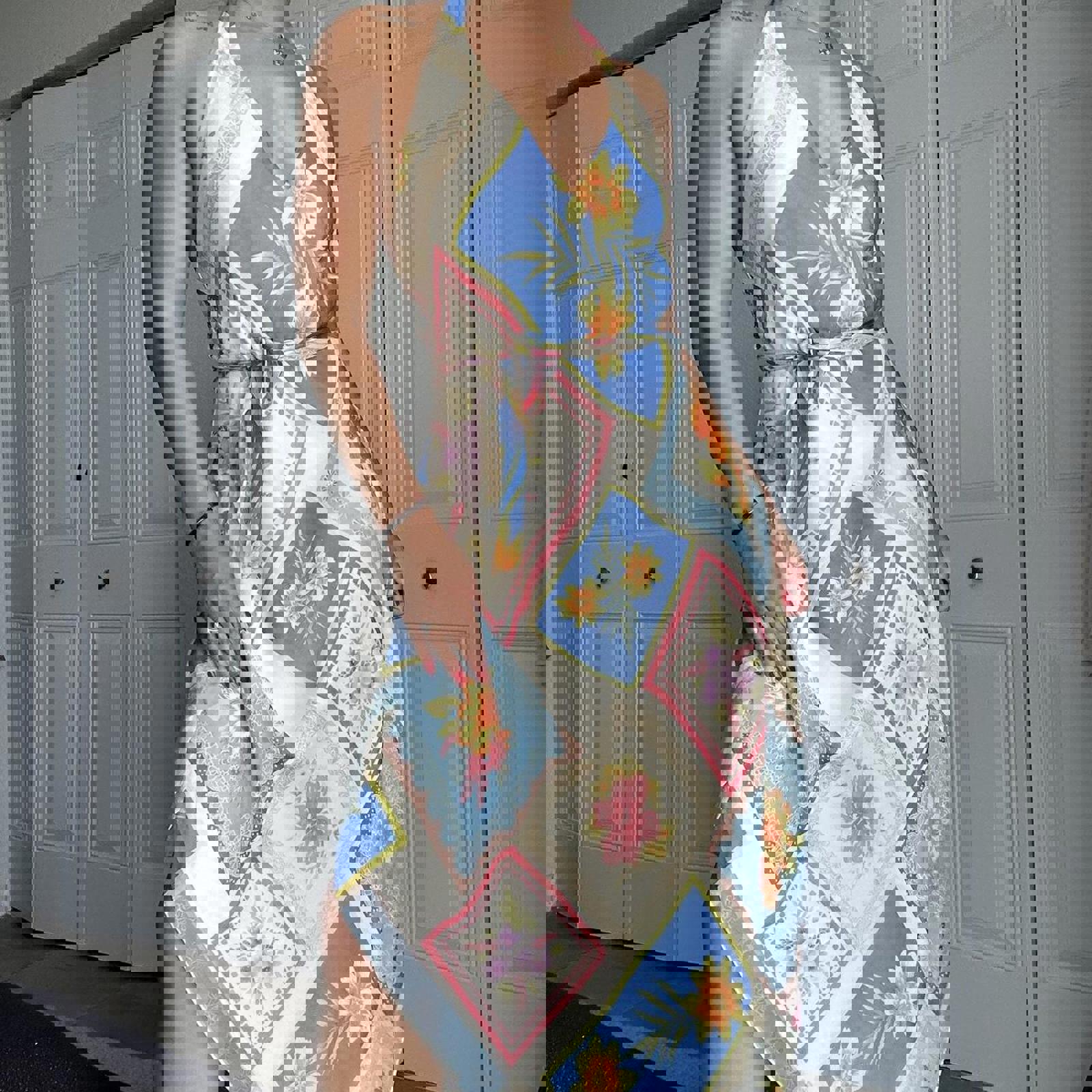 659. Absolutely adorable laundry by Shelly Segal. 100% silk dress. It is in perfect condition. Has V-cut bottom and tie back that I used to tie in the front. This is a size 10. It fits like a medium shown on a small. I just wrapped it in the front to fit me.