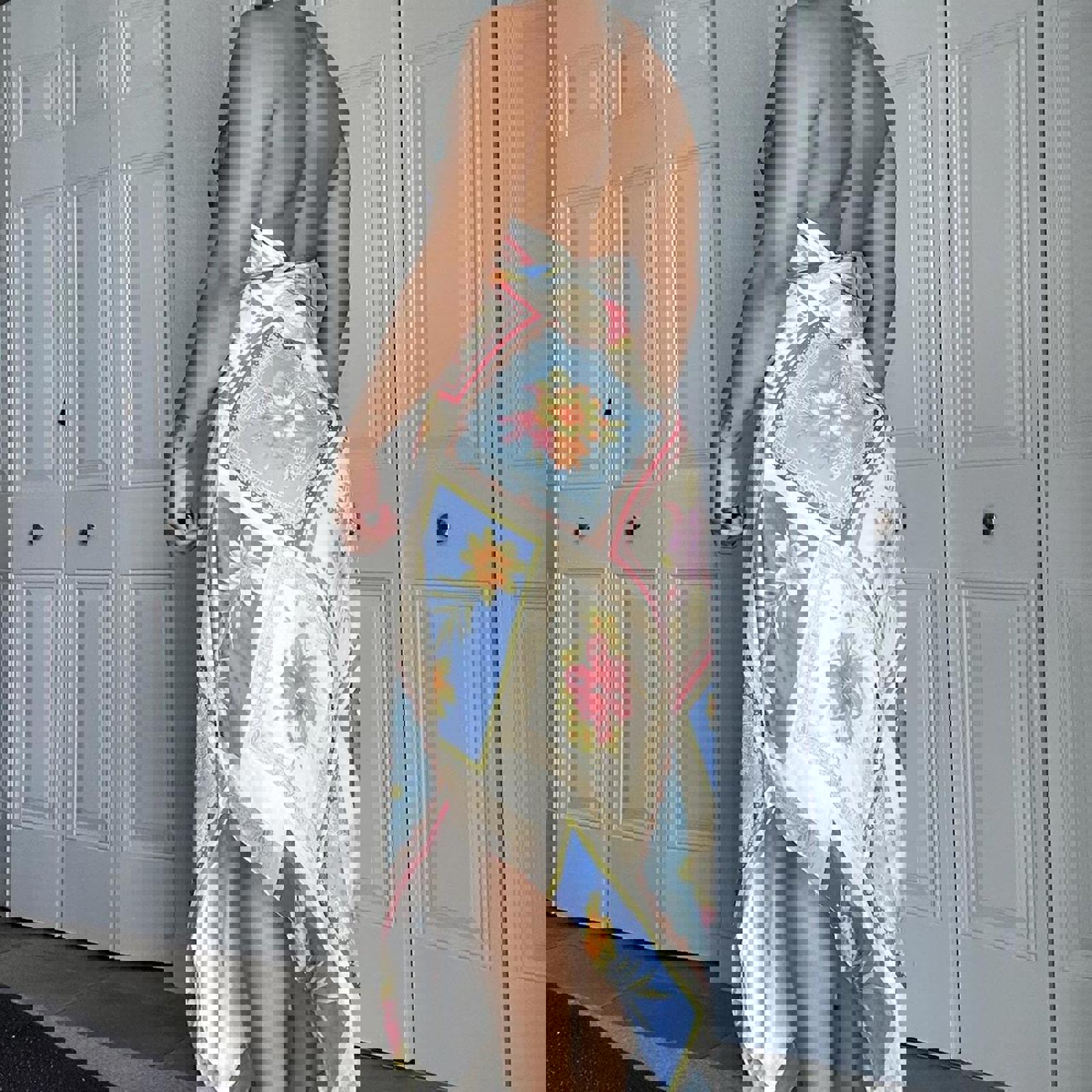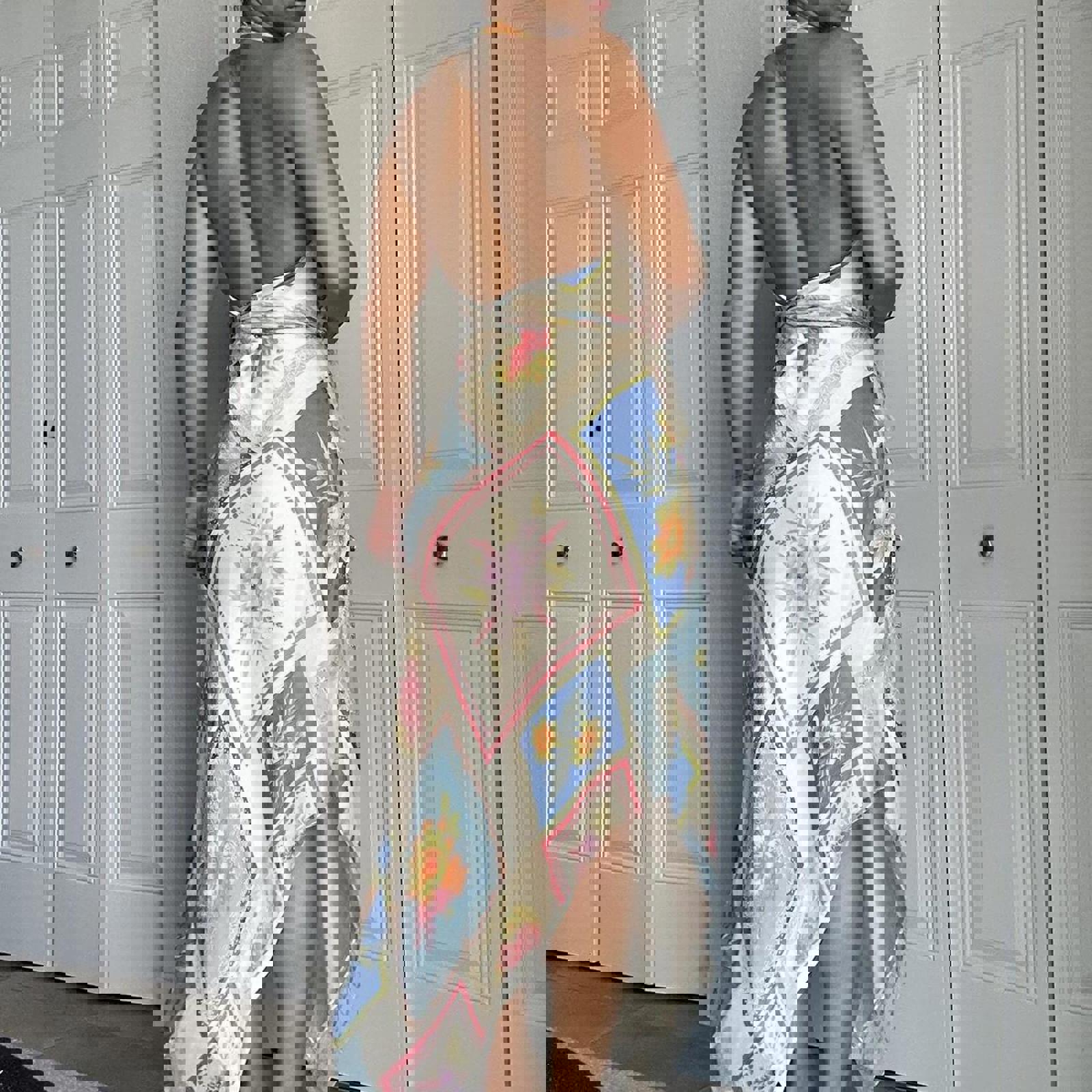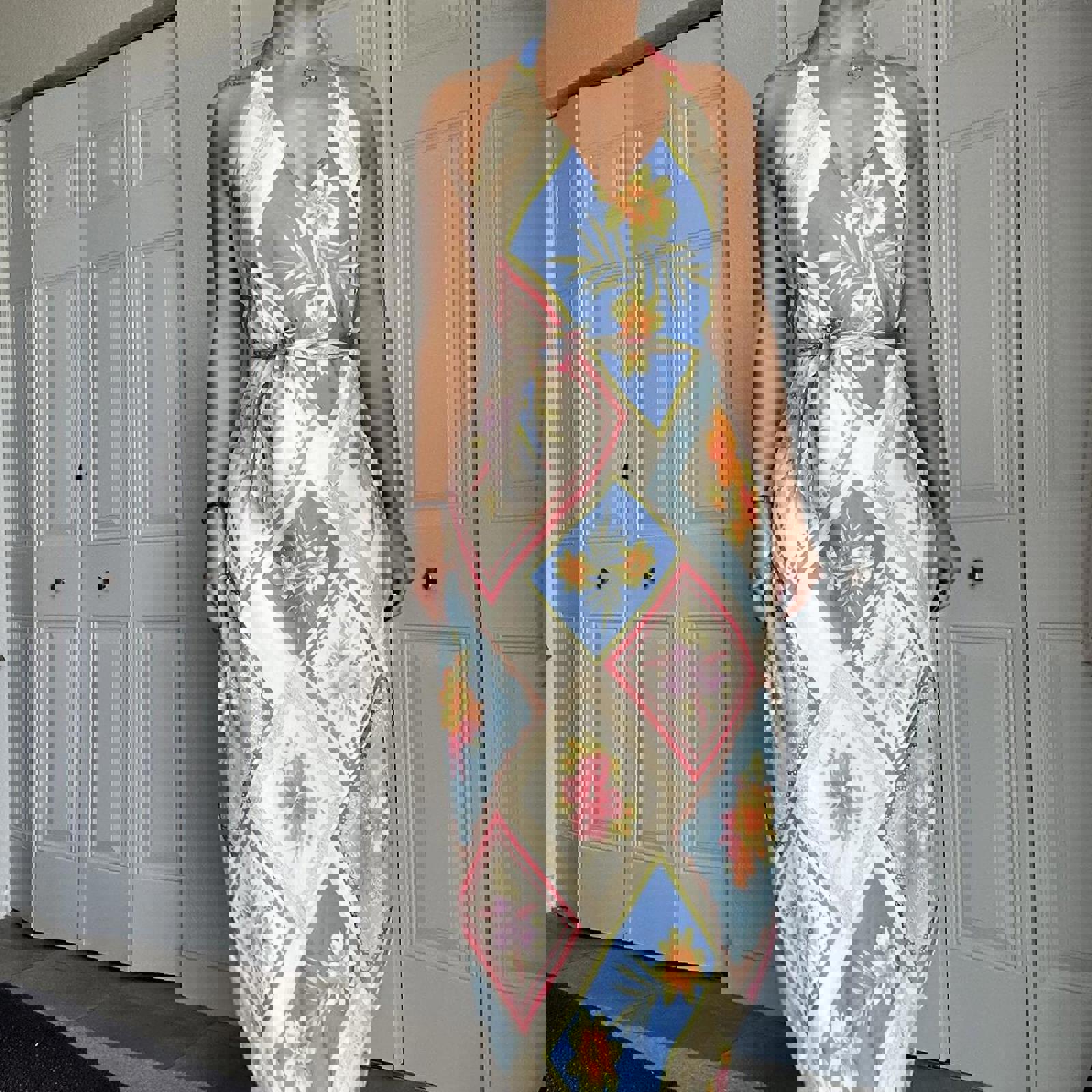 659. Absolutely adorable laundry by Shelly Segal. 100% silk dress. It is in perfect condition. Has V-cut bottom and tie back that I used to tie in the front. This is a size 10. It fits like a medium shown on a small. I just wrapped it in the front to fit me.