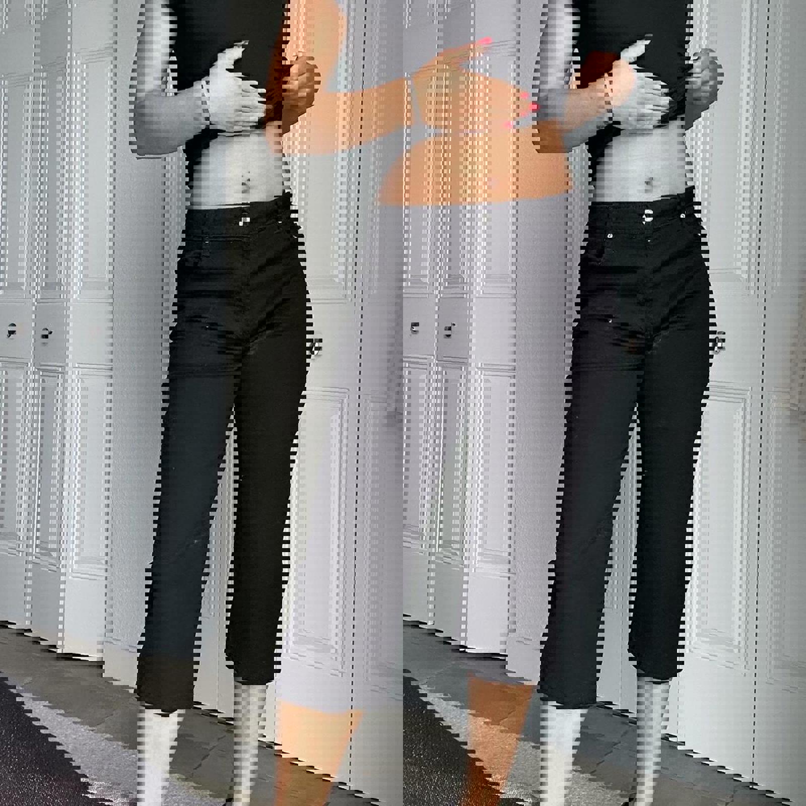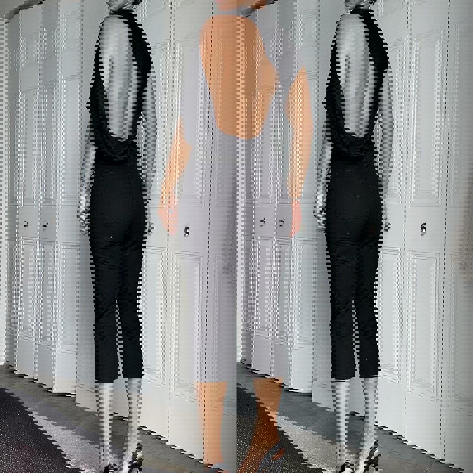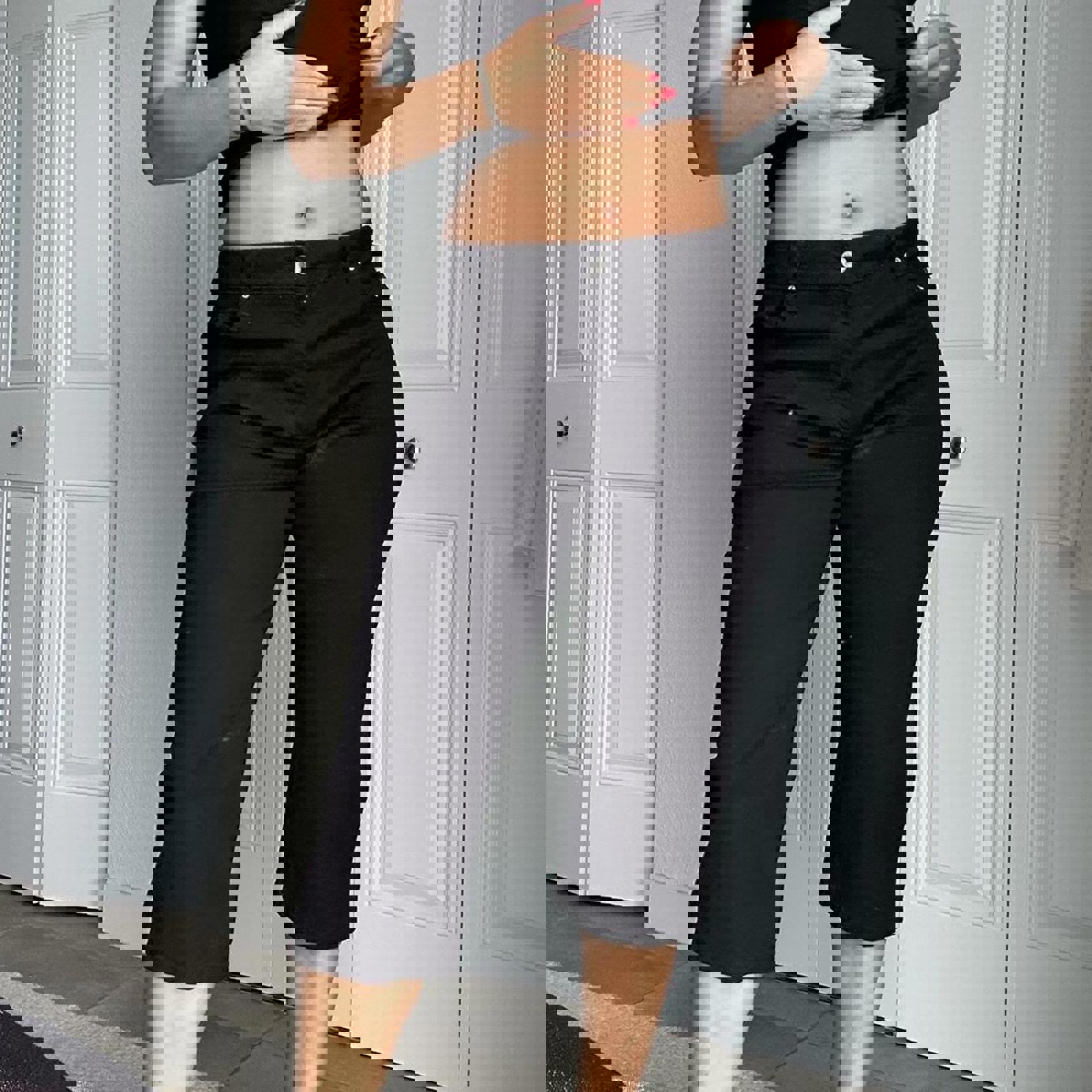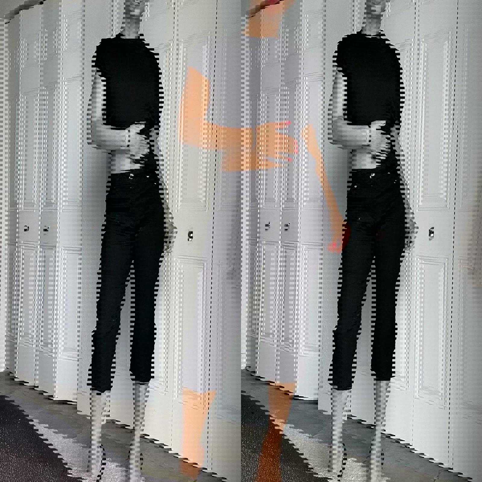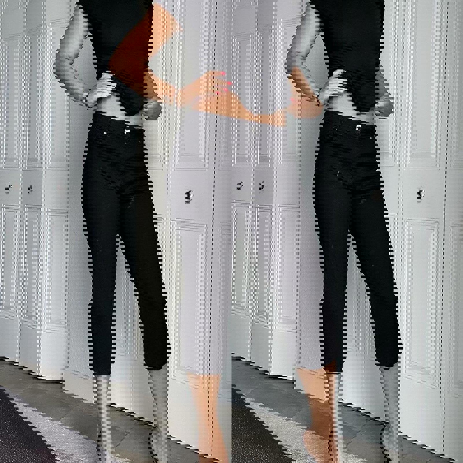 black denim, relaxed fit, capri length, high waist, cotton blend, cropped jeans, boyfriend style, casual wear, distressed details, versatile fit