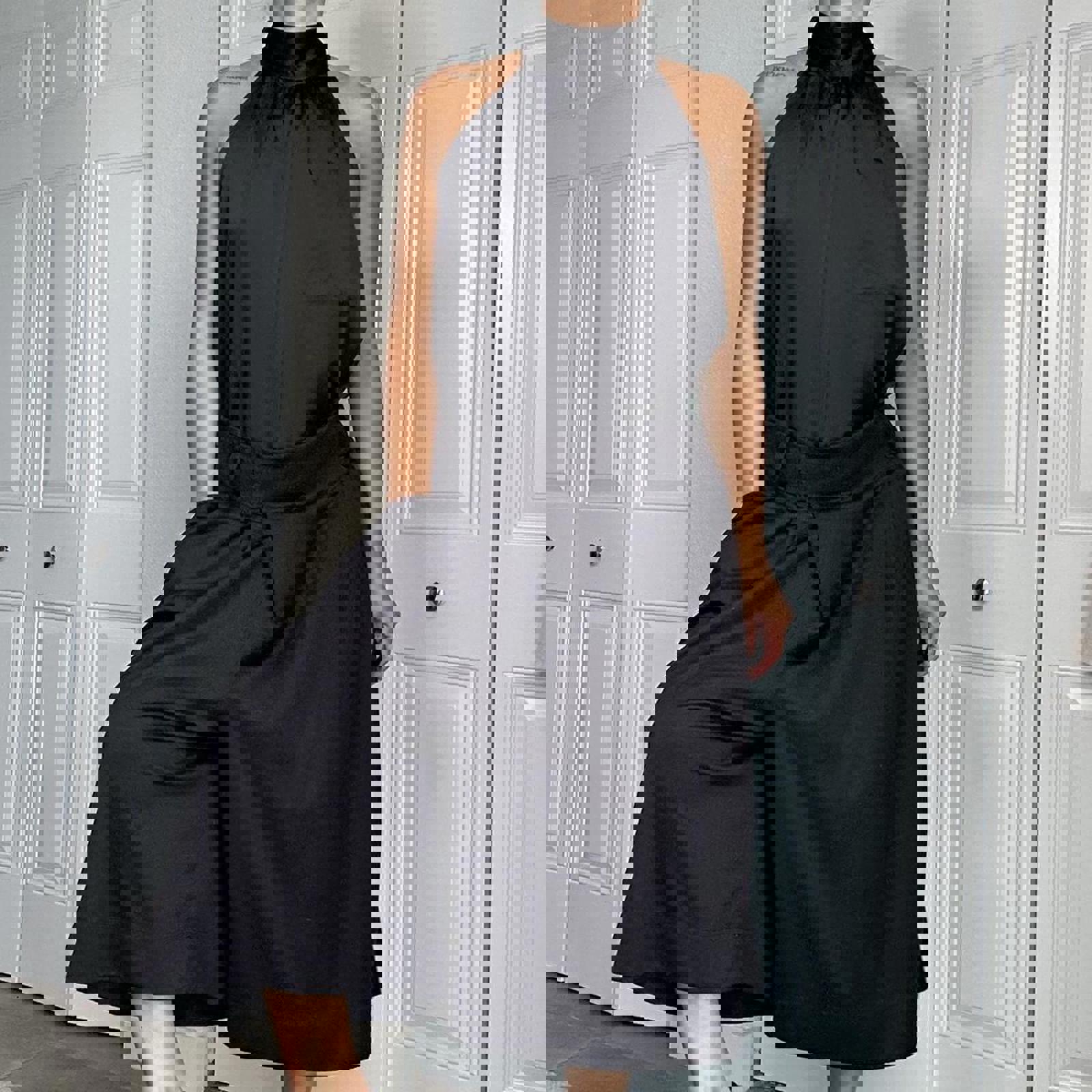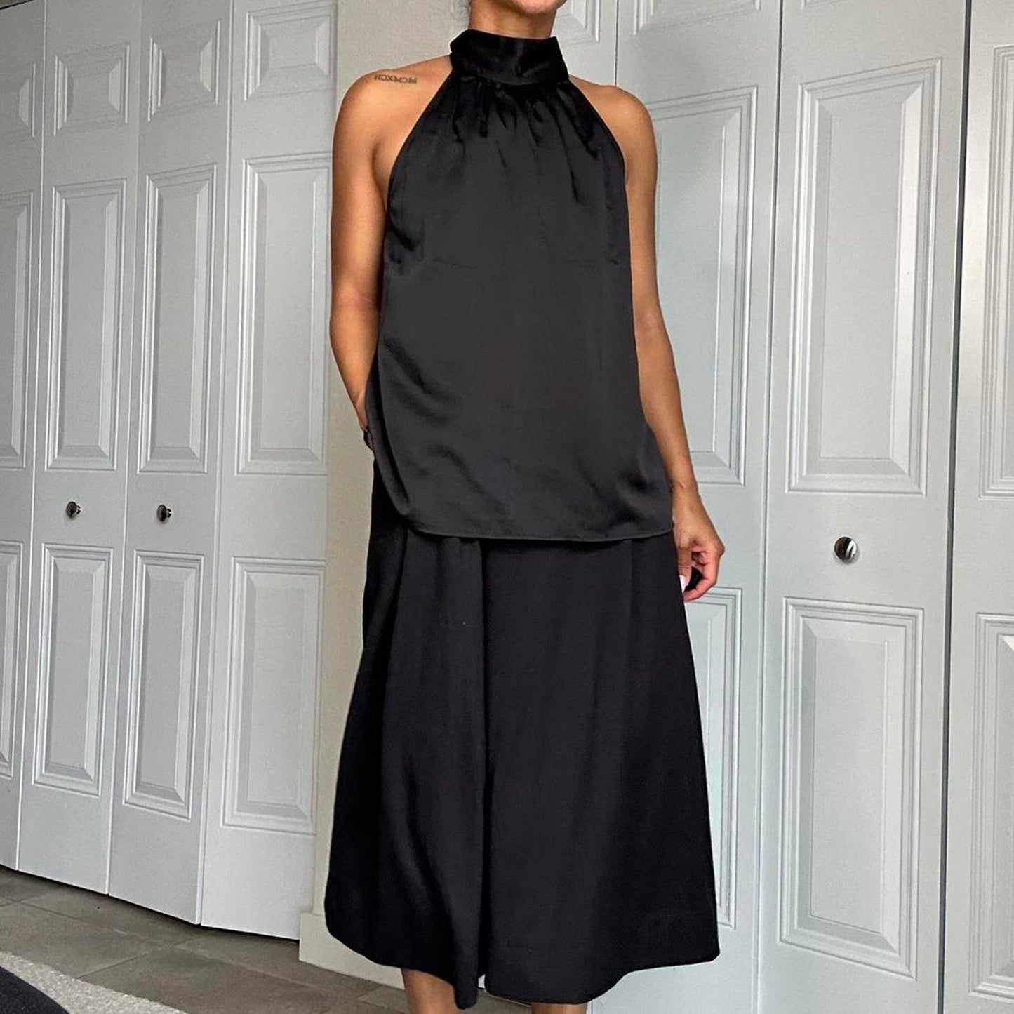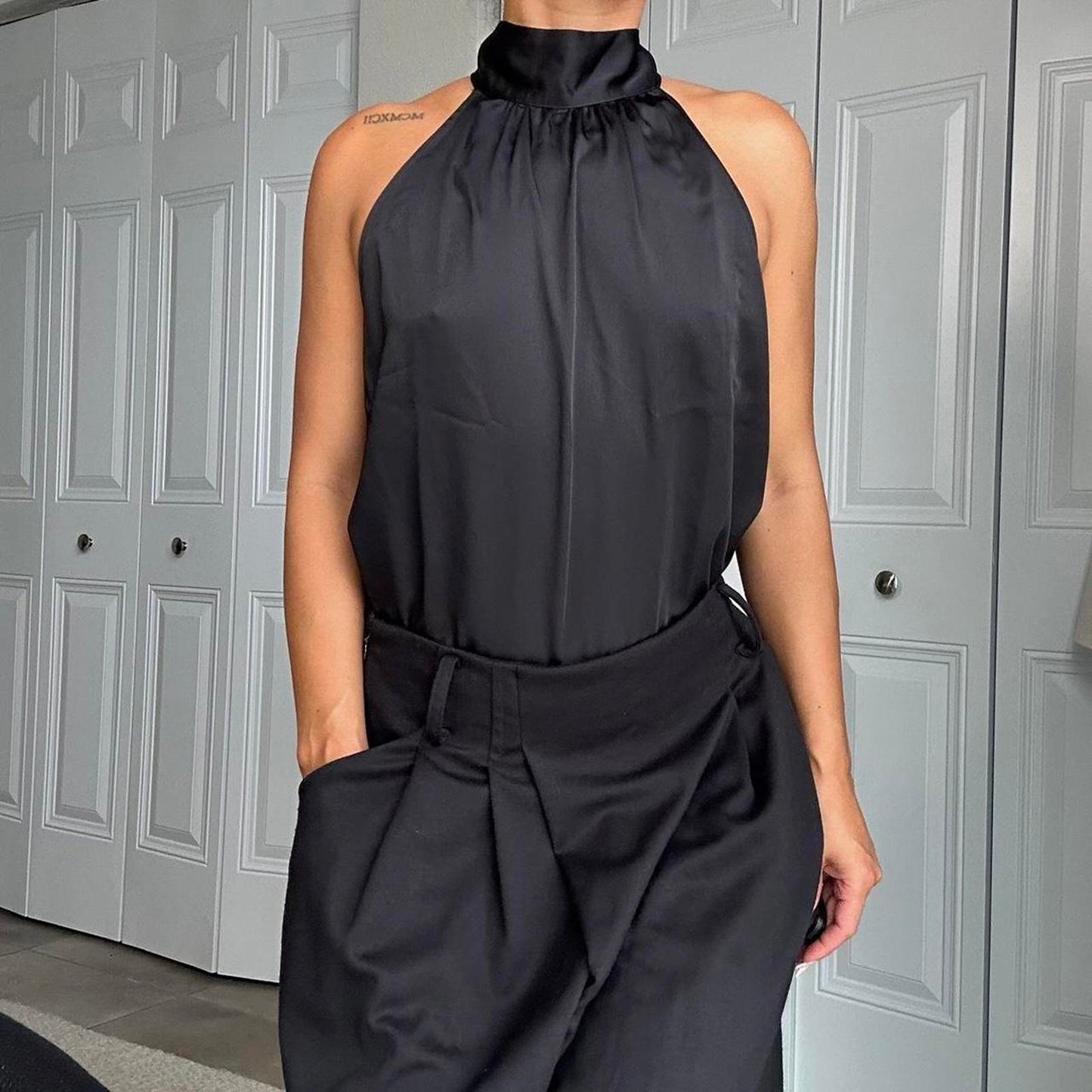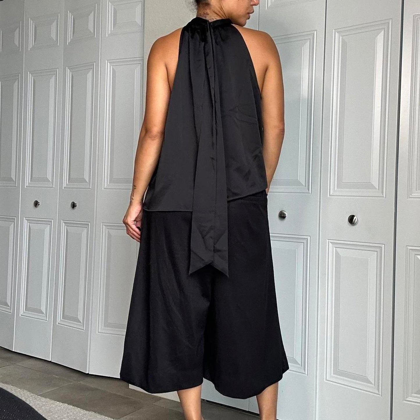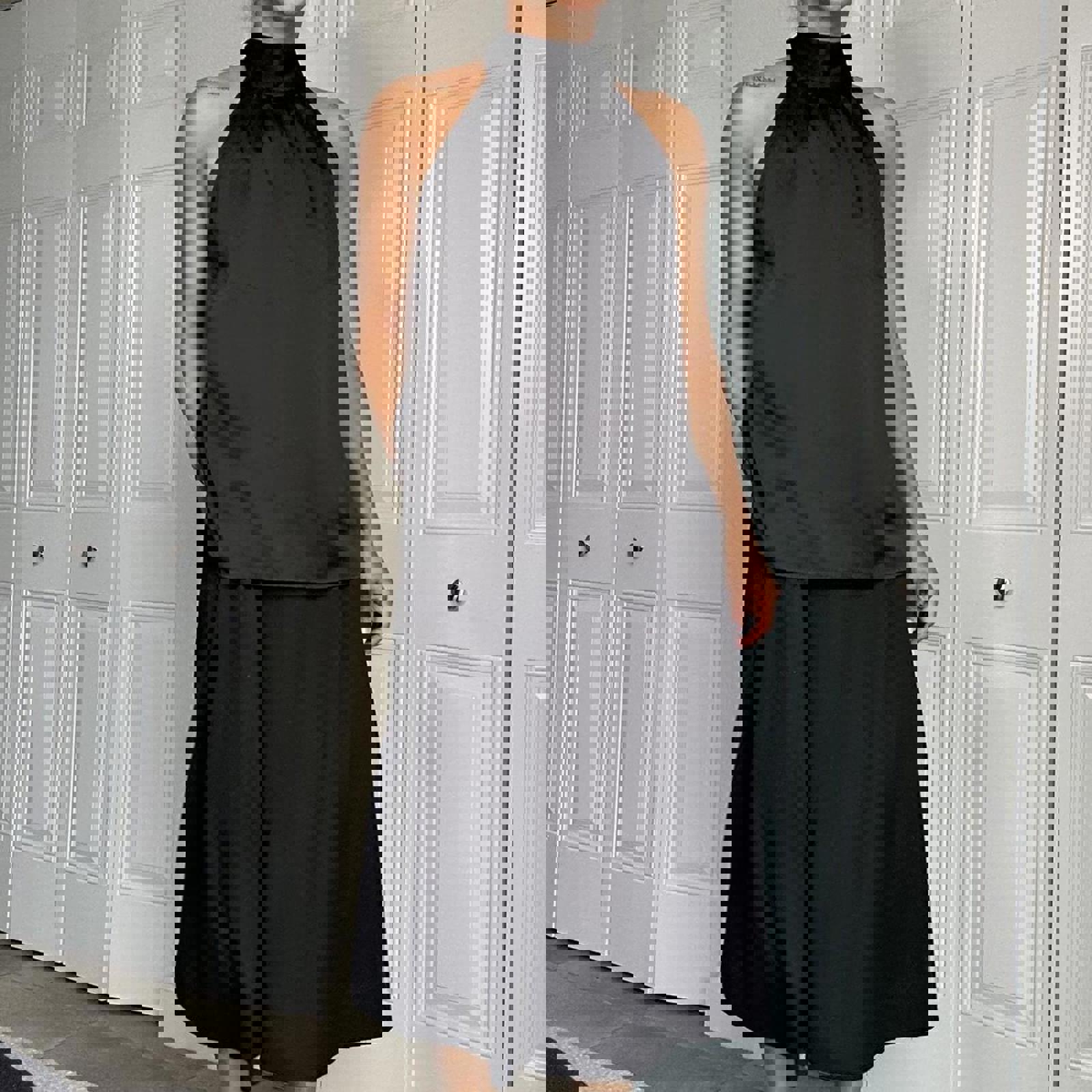 482. Black satin halter top with high neck #halterneck size large but shown on a small