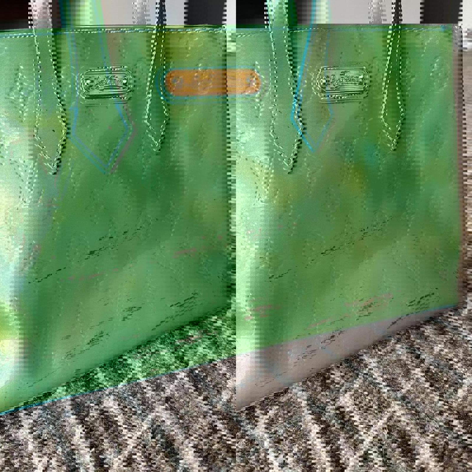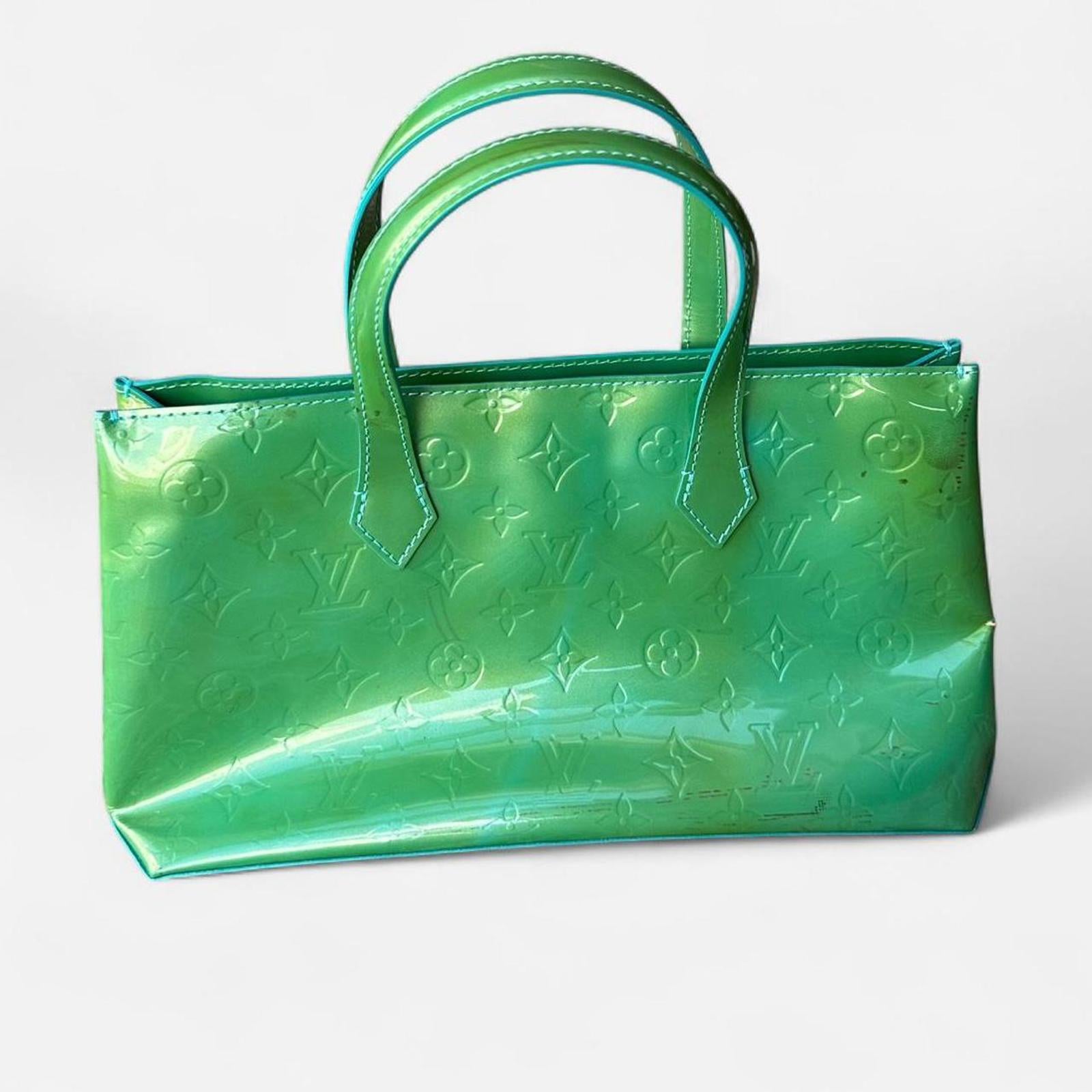 827. Louis Vuitton green monogram patent leather bag in pretty good condition, but as you can see, there are some scratches in the front which I have tried to remove and they cannot be removed, hence the price point on this. It is a hundred percent authentic, beautiful condition on the inside, no flaws on the inside, it's just the outside with some minor scratches.Measurements are listed below: