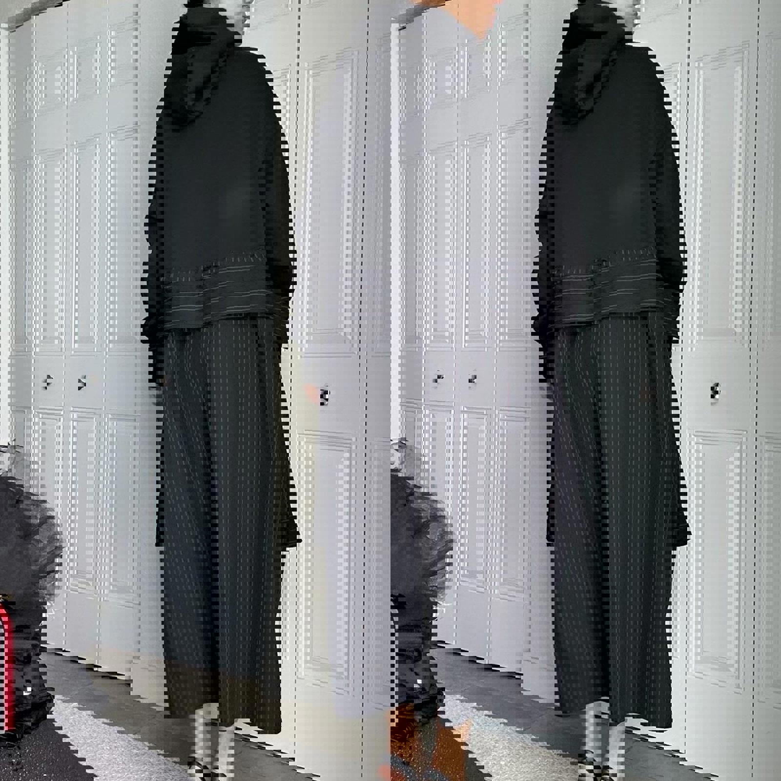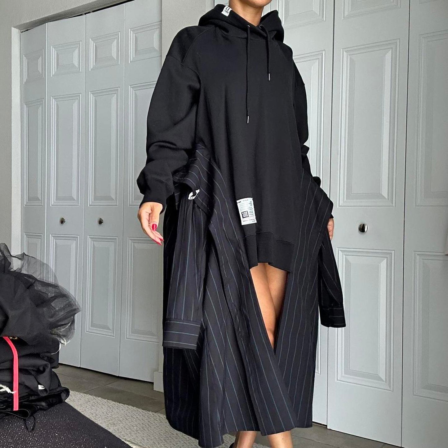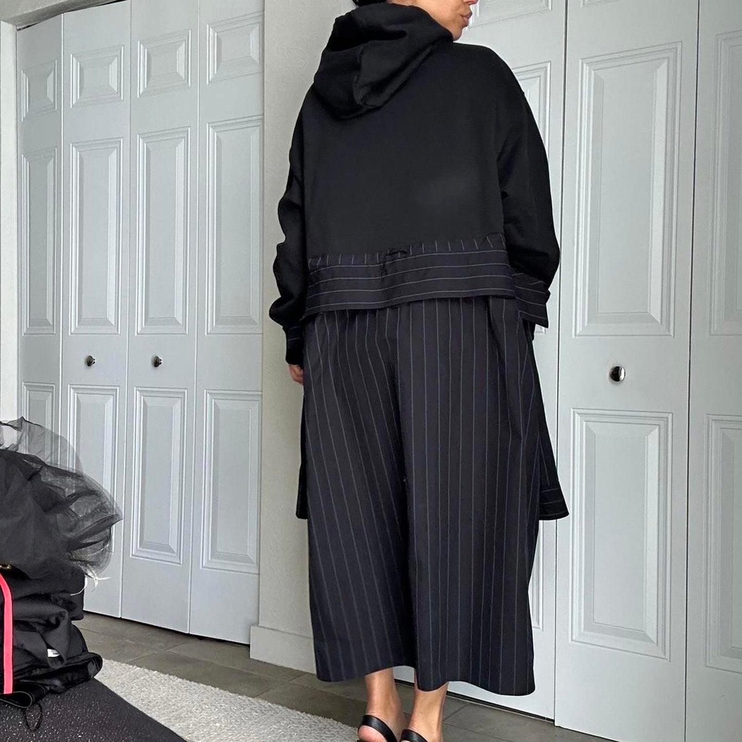 This dress combines a sweatshirt hoodie with a striped shirt.