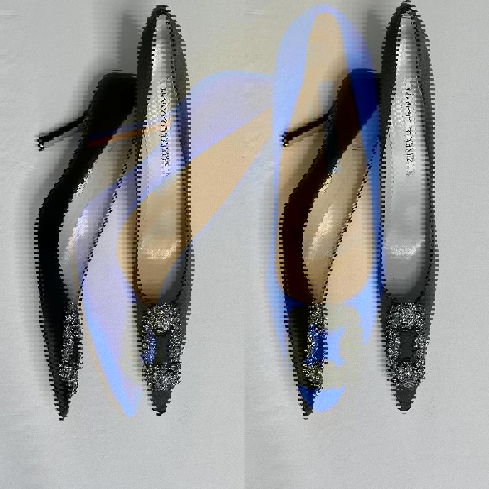 100% authentic Manolo Blahnik Hangisi dark blue satin heels with crystal buckle, featuring a pointed toe and 4" heel #carriebradshaw wedding heels. Size 38.5 (fit like a 7.5) - for the true #sexandthecity fanatic