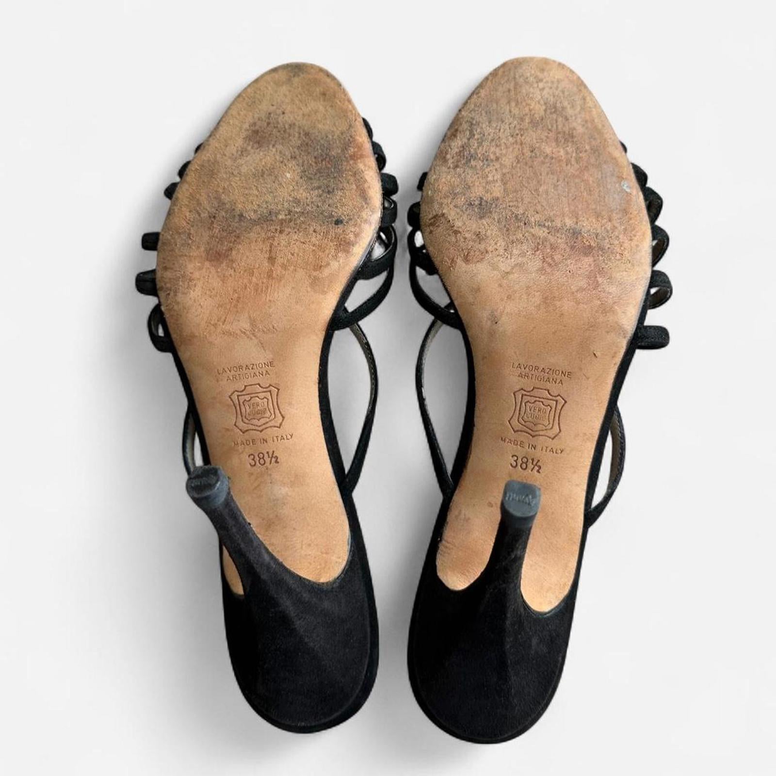 630. Black Manolo Blahnik open toed scrappy heels in great condition. Size 38.5 in my opinion run a little small and fit like an 8. 4 in heel height