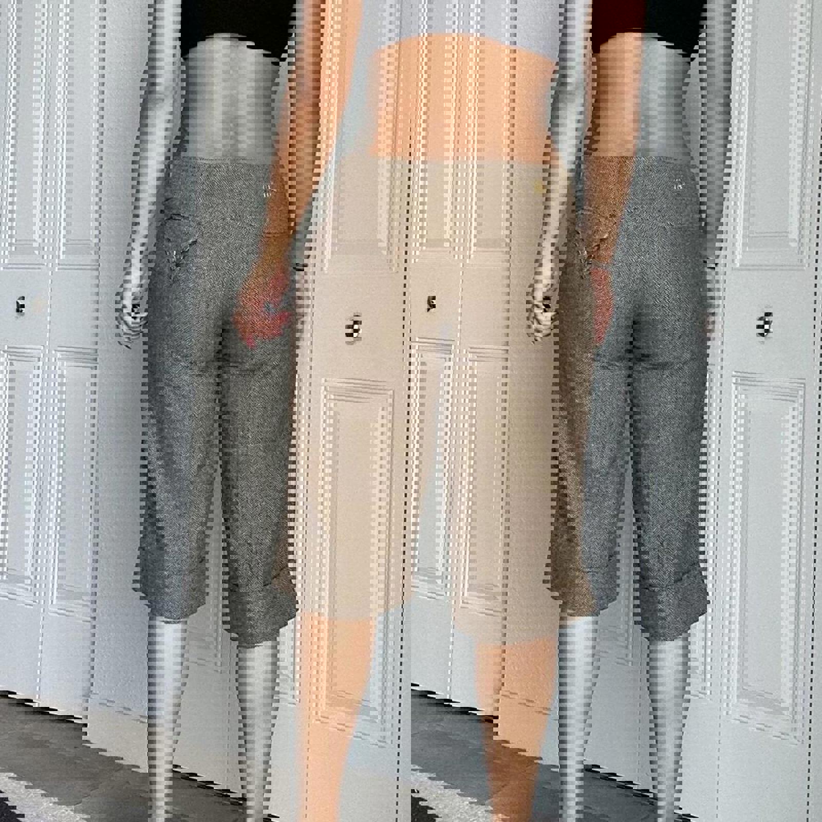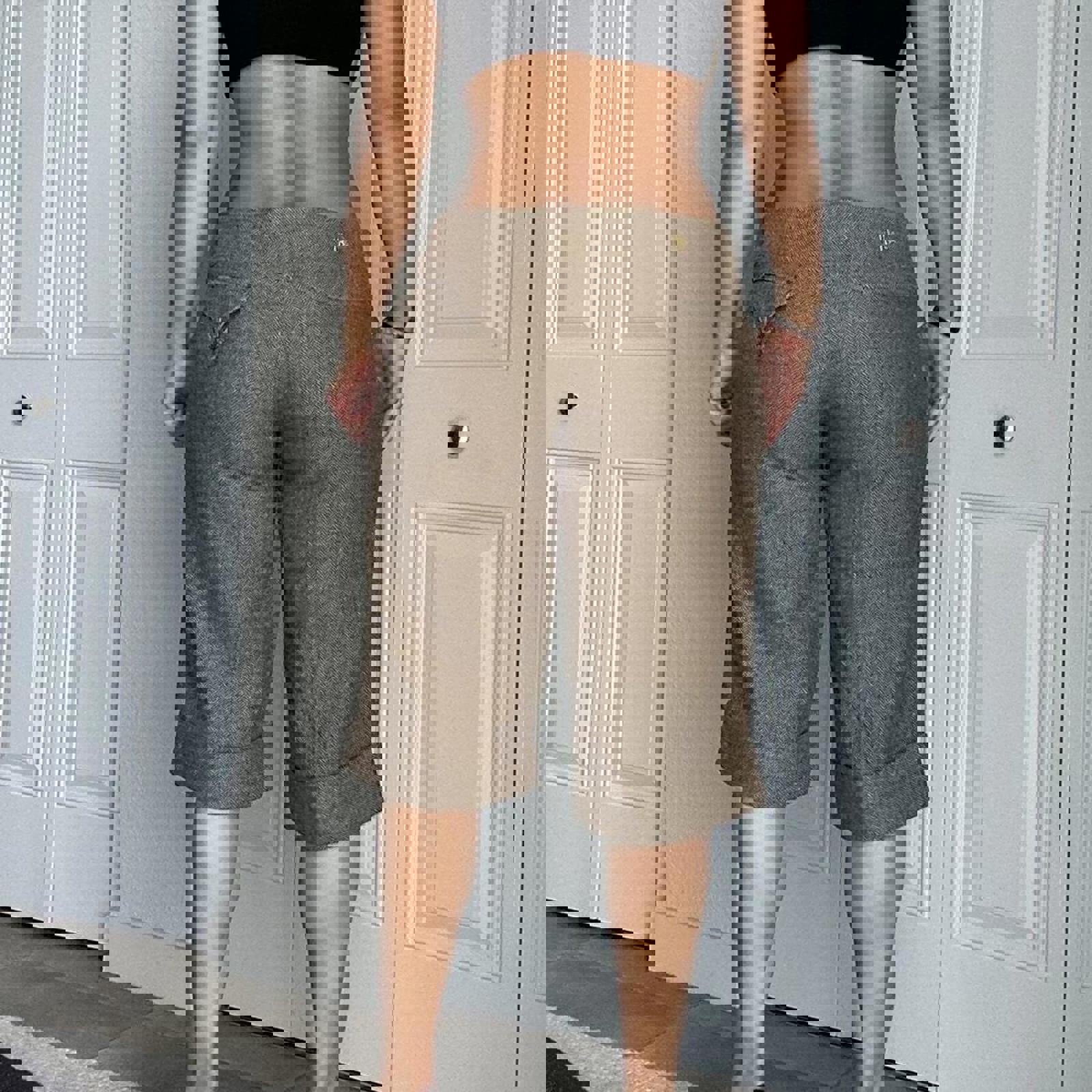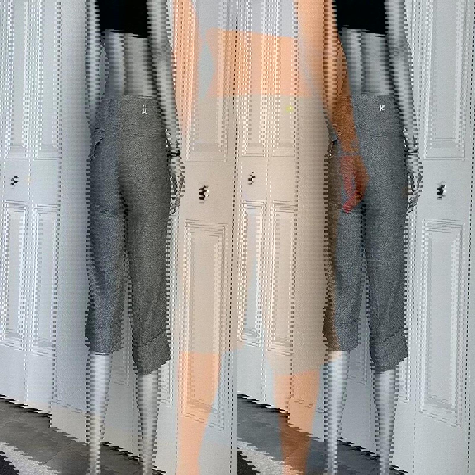 tweed shorts, longline, high waisted, neutral tones, tailored fit, classic pattern, casual chic, autumn style, boucle textured, relaxed fit