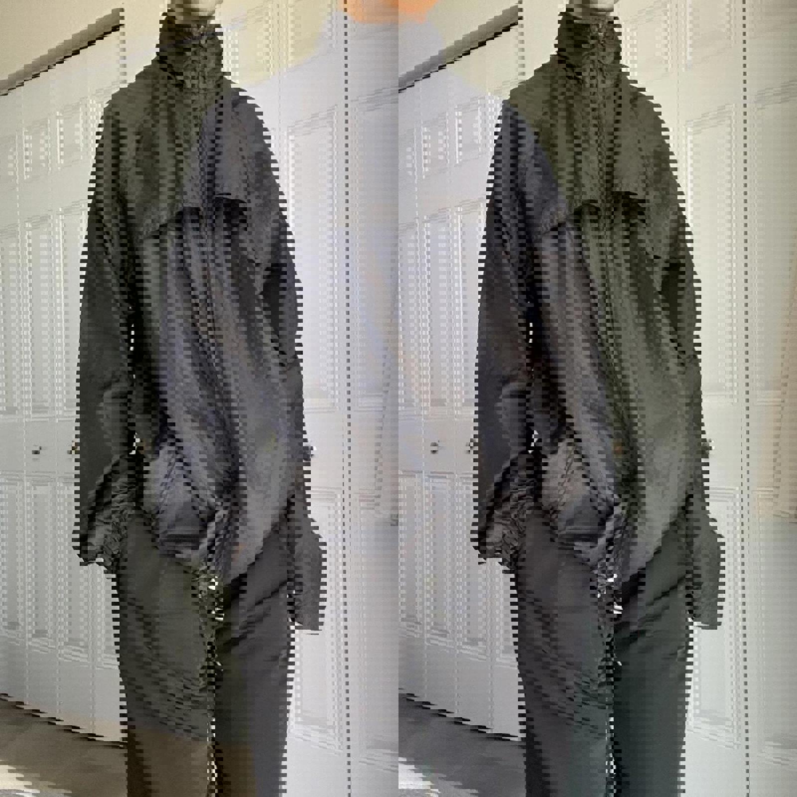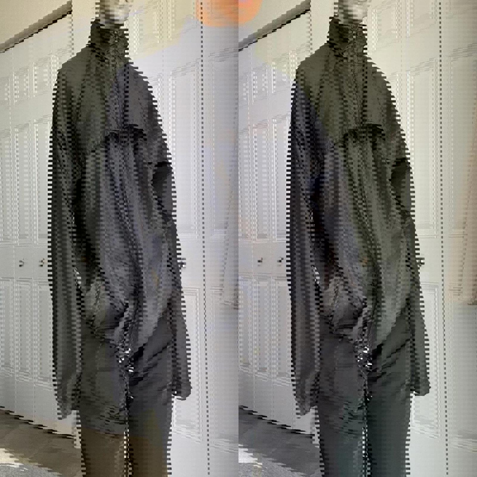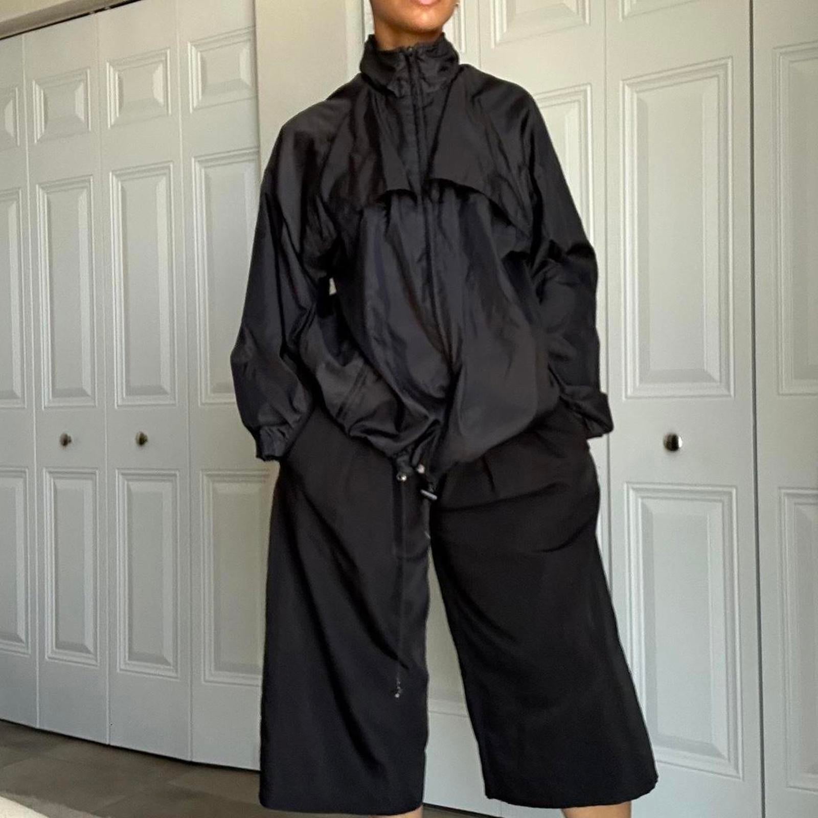 382. Oversized track jacket/technical jacket/windbreaker in black. It is a size large but can fit a size smaller medium depending on desired fit. Last photo shows the inside of the jacket coming outside is in perfect condition it is also adjustable at the bottom