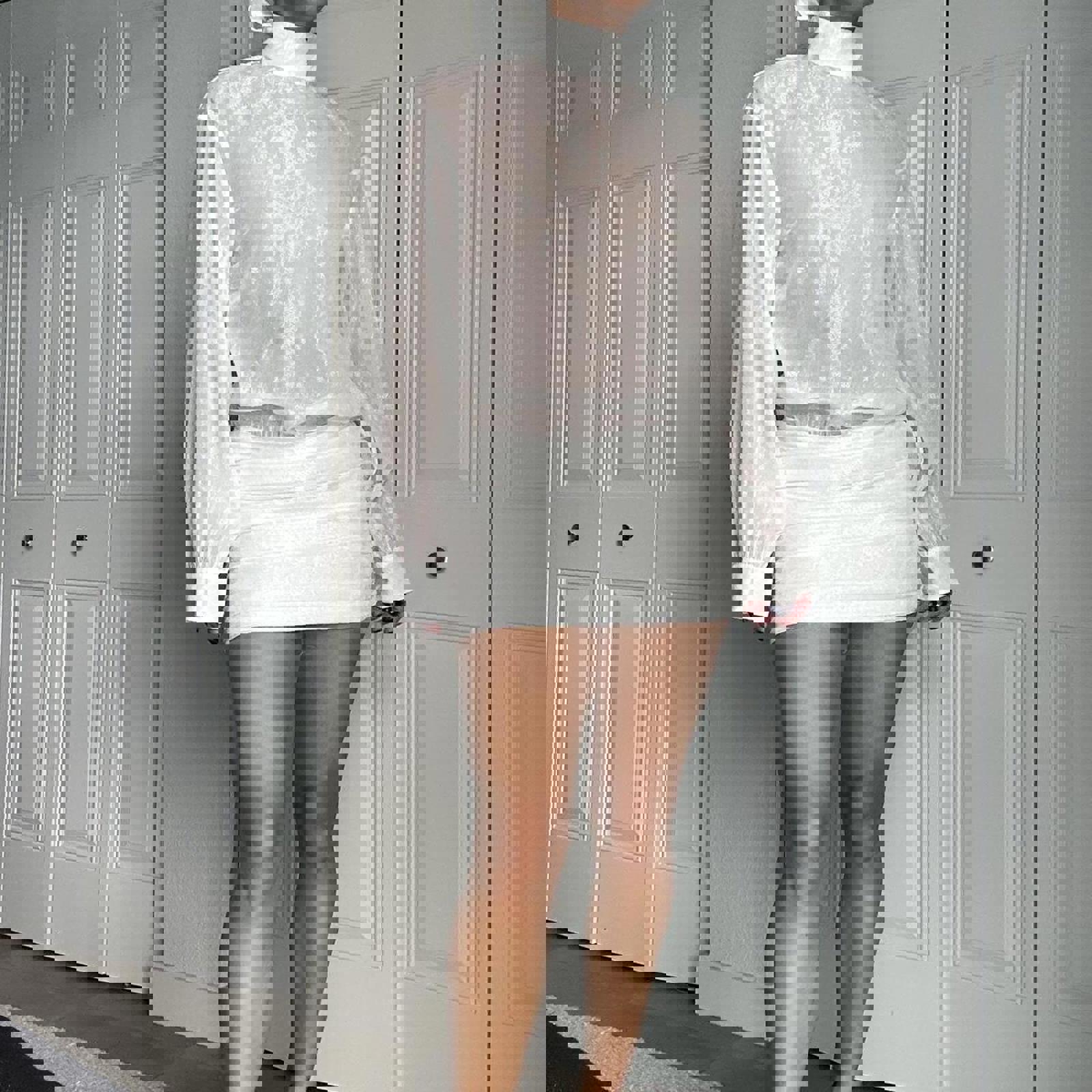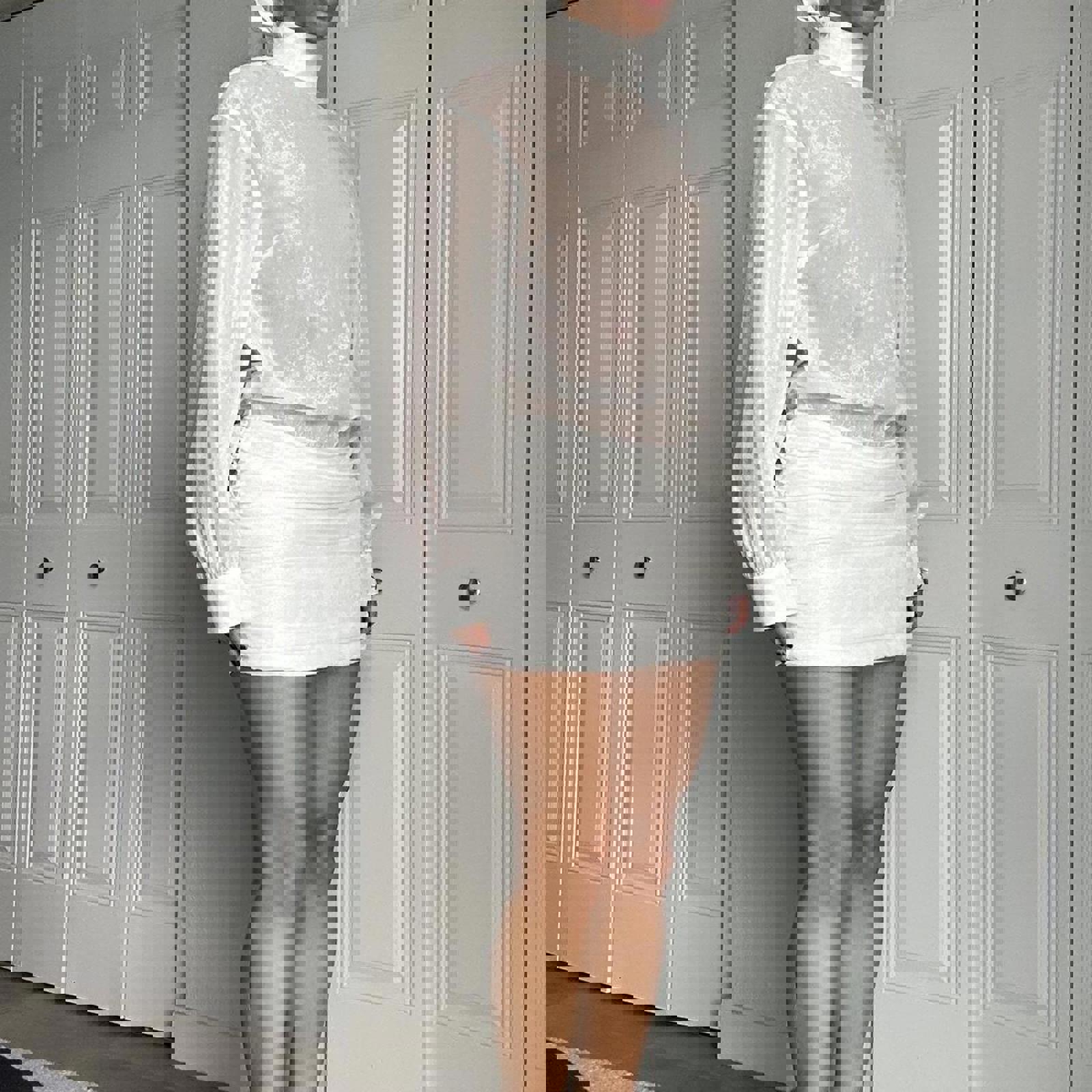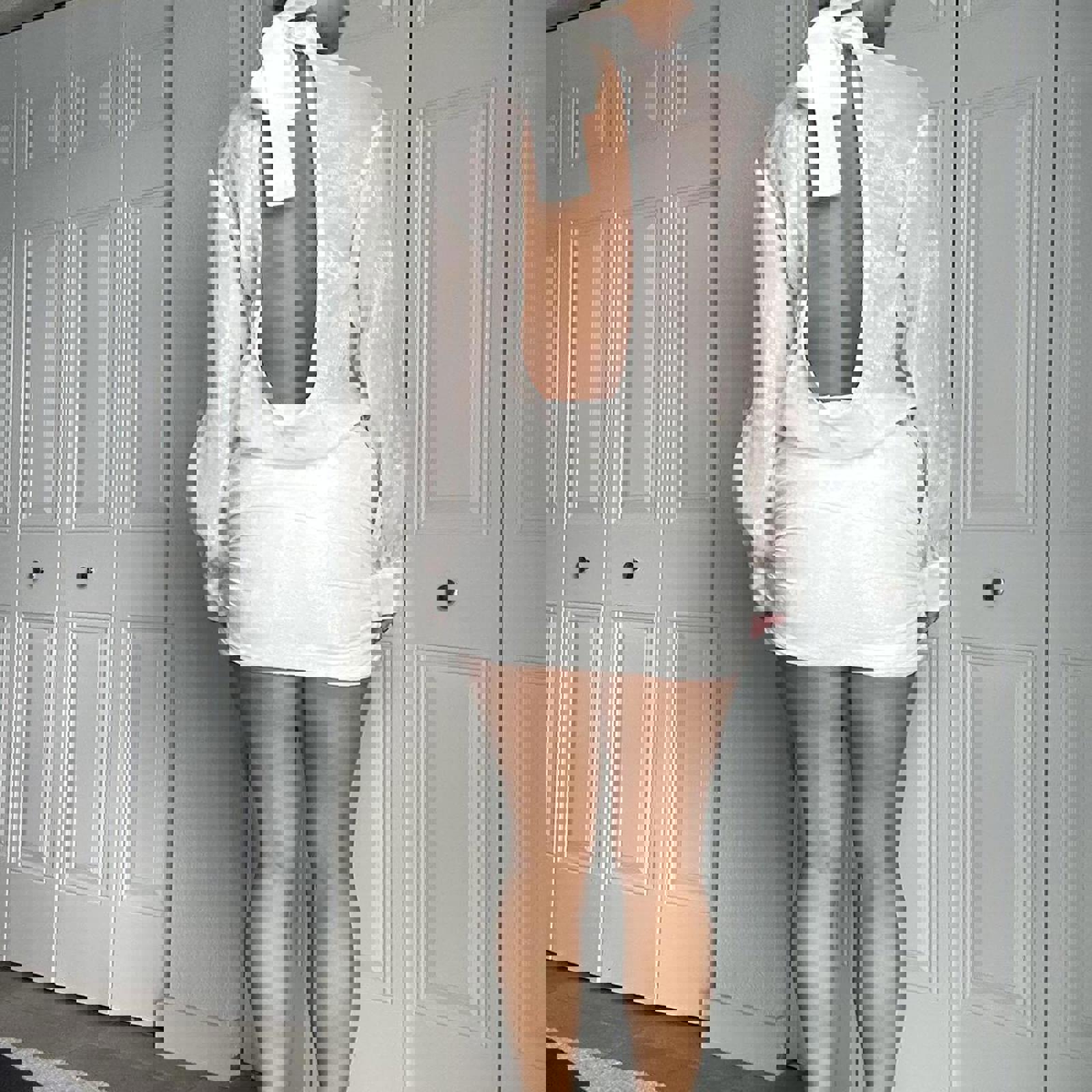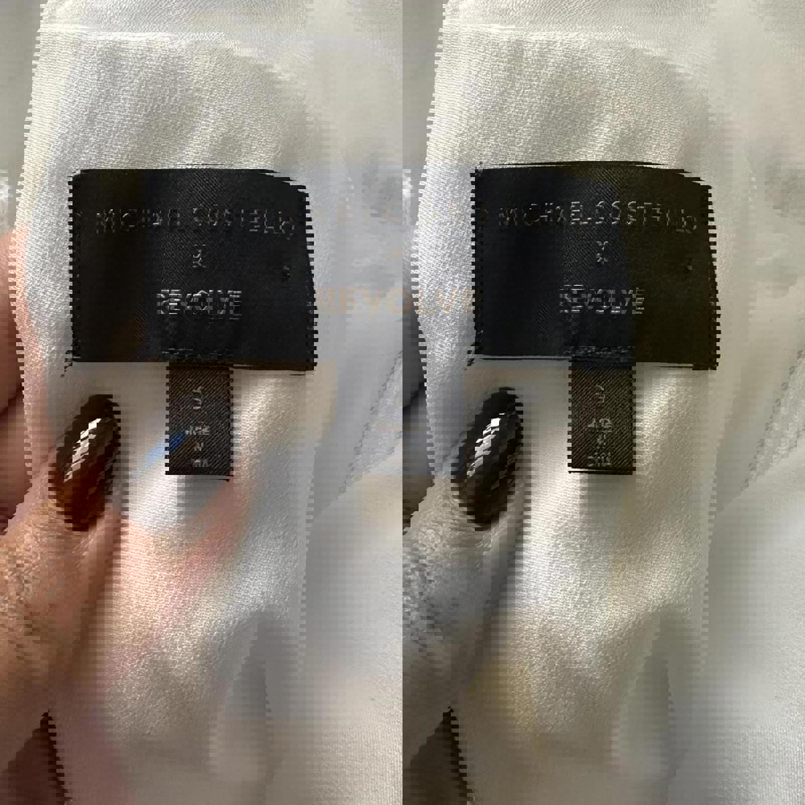 805. White Michael Costello X Revolve dress in perfect condition, never worn. Does have an invisible zipper on the side and high neck with open back. Measurements are listed.