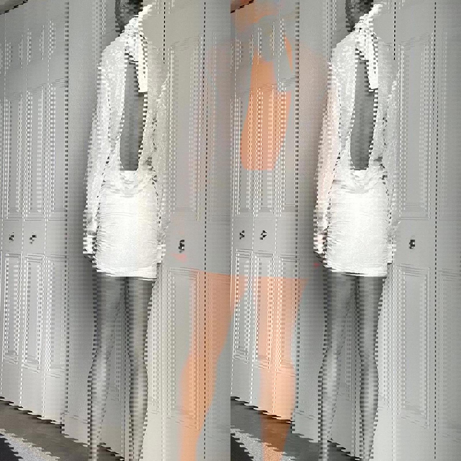 white, fitted, high neck, open back, side zipper, minimalist, elegant, party dress, sleek silhouette, bodycon