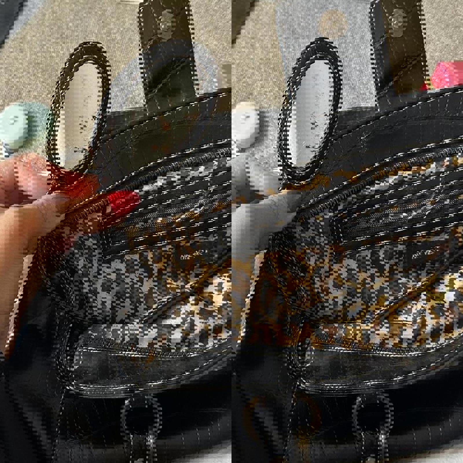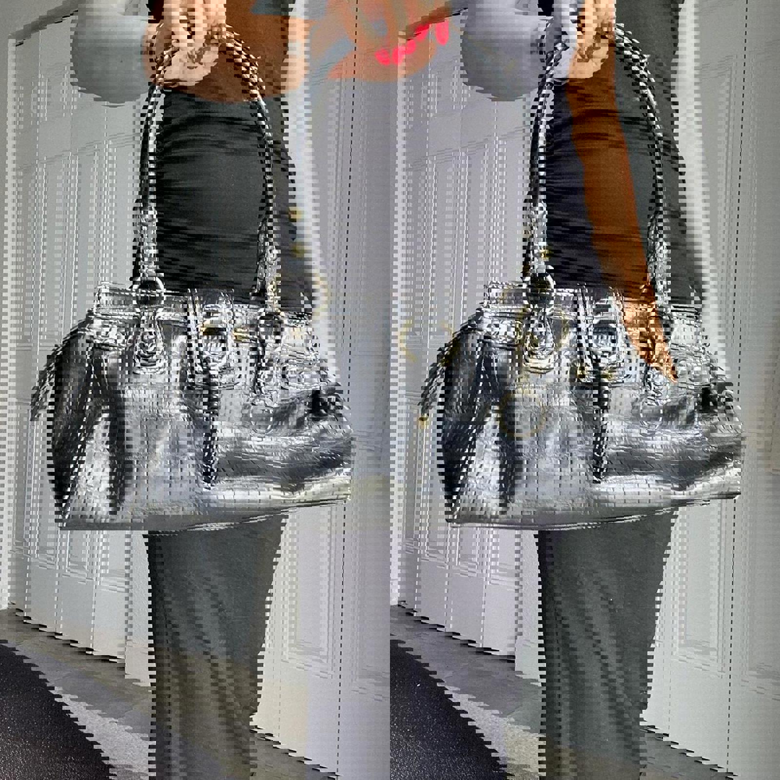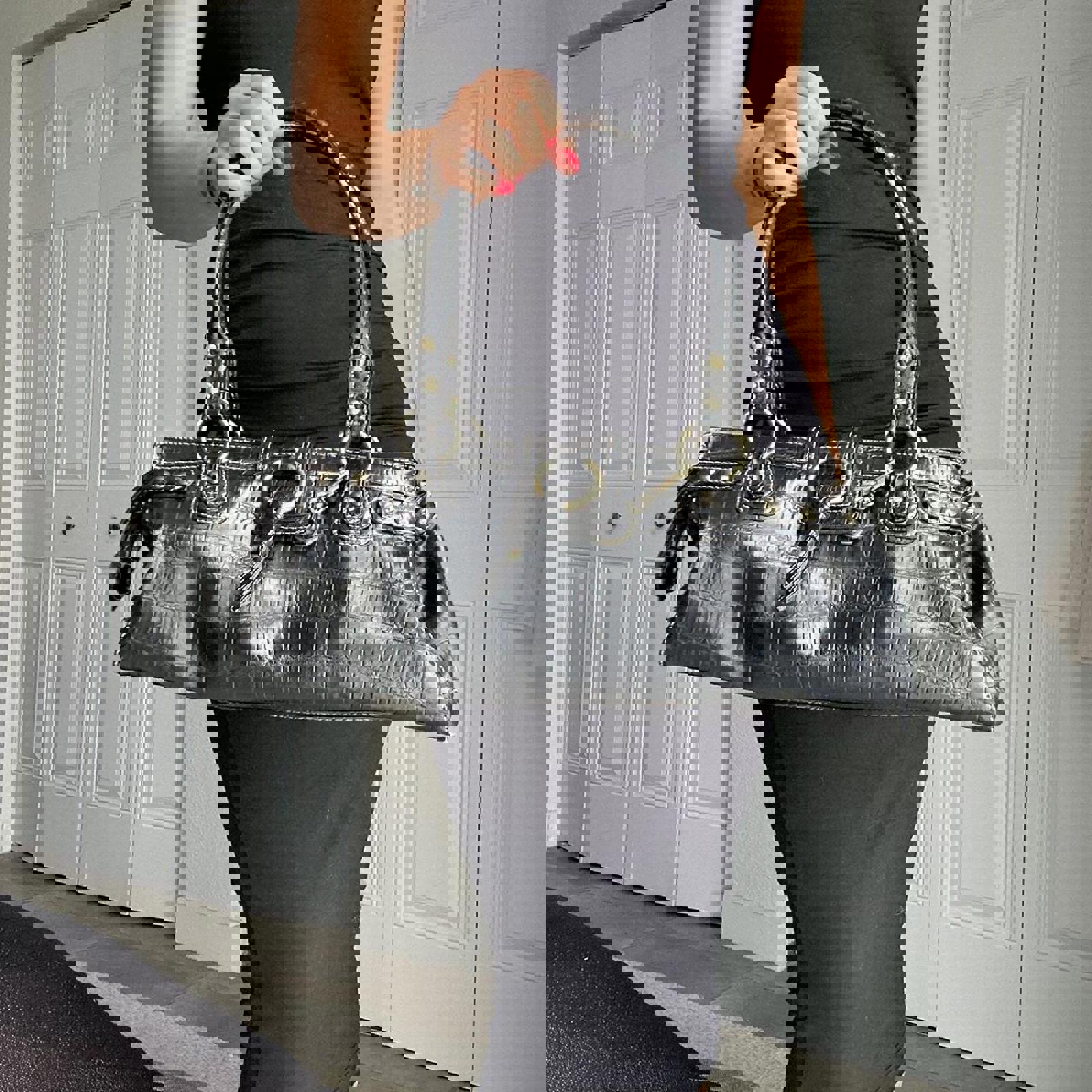 670. The absolute coolest Nine West vintage bowling bag in black croc material. Such good vintage condition. Has cheetah lining. Length is 14 inches. Depth is about 6 1⁄2 inches. Width is 4 inches. Also comes with a little mirror that is attached inside. It is cracked.