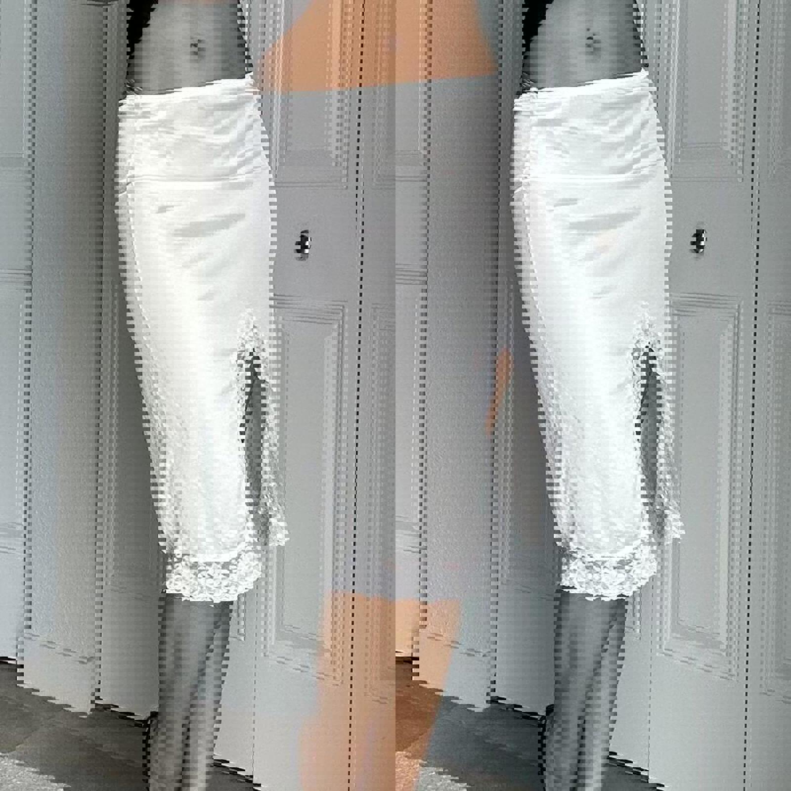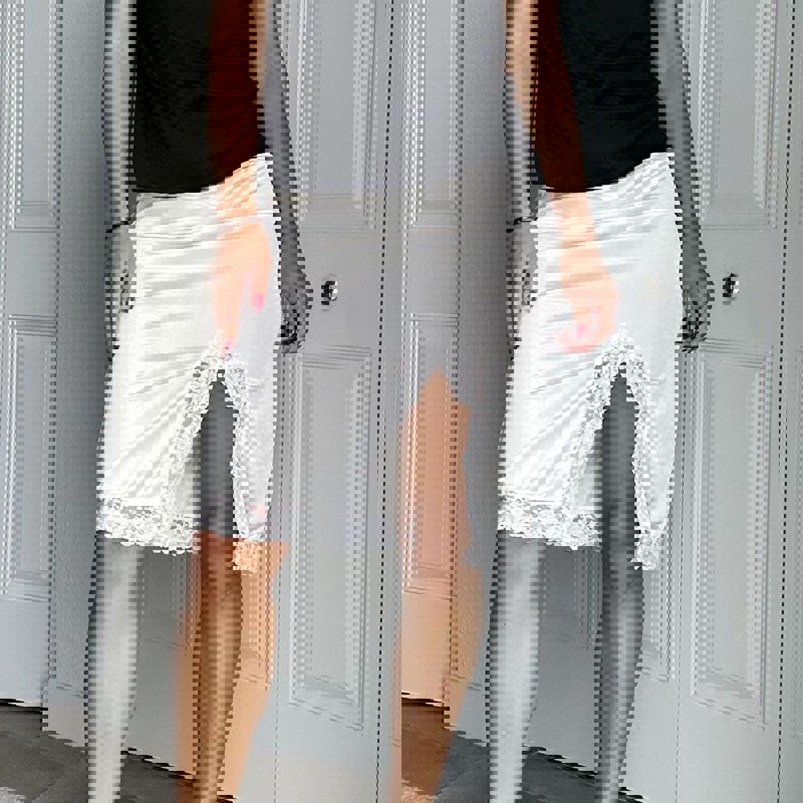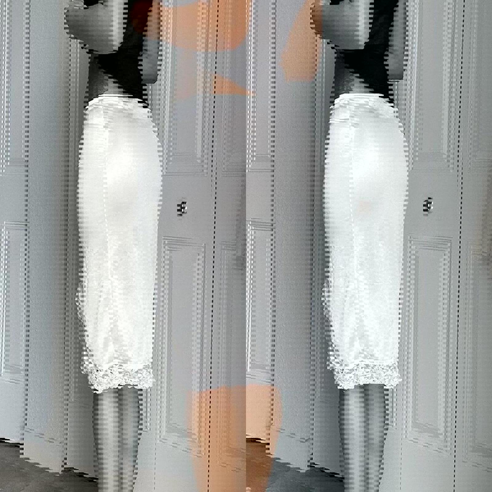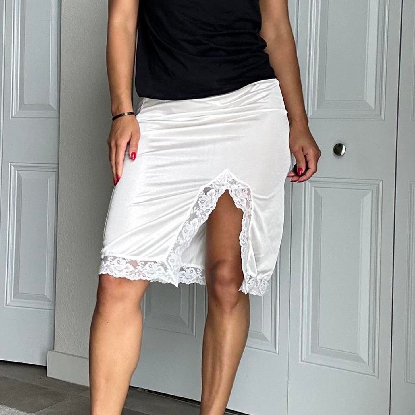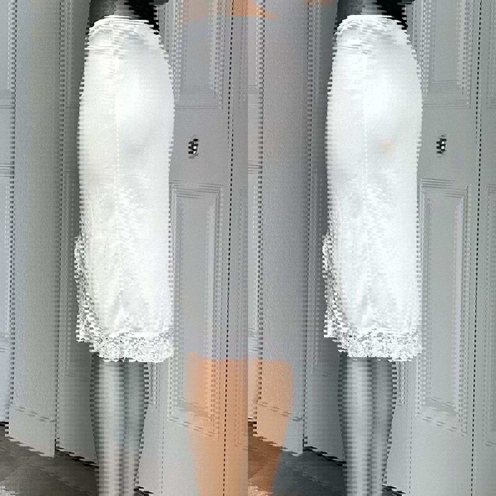 681. Mel-Lin 100% nylon white/cream slip skirt in a size small. Has a slit with lace detailing. It is in perfect condition.