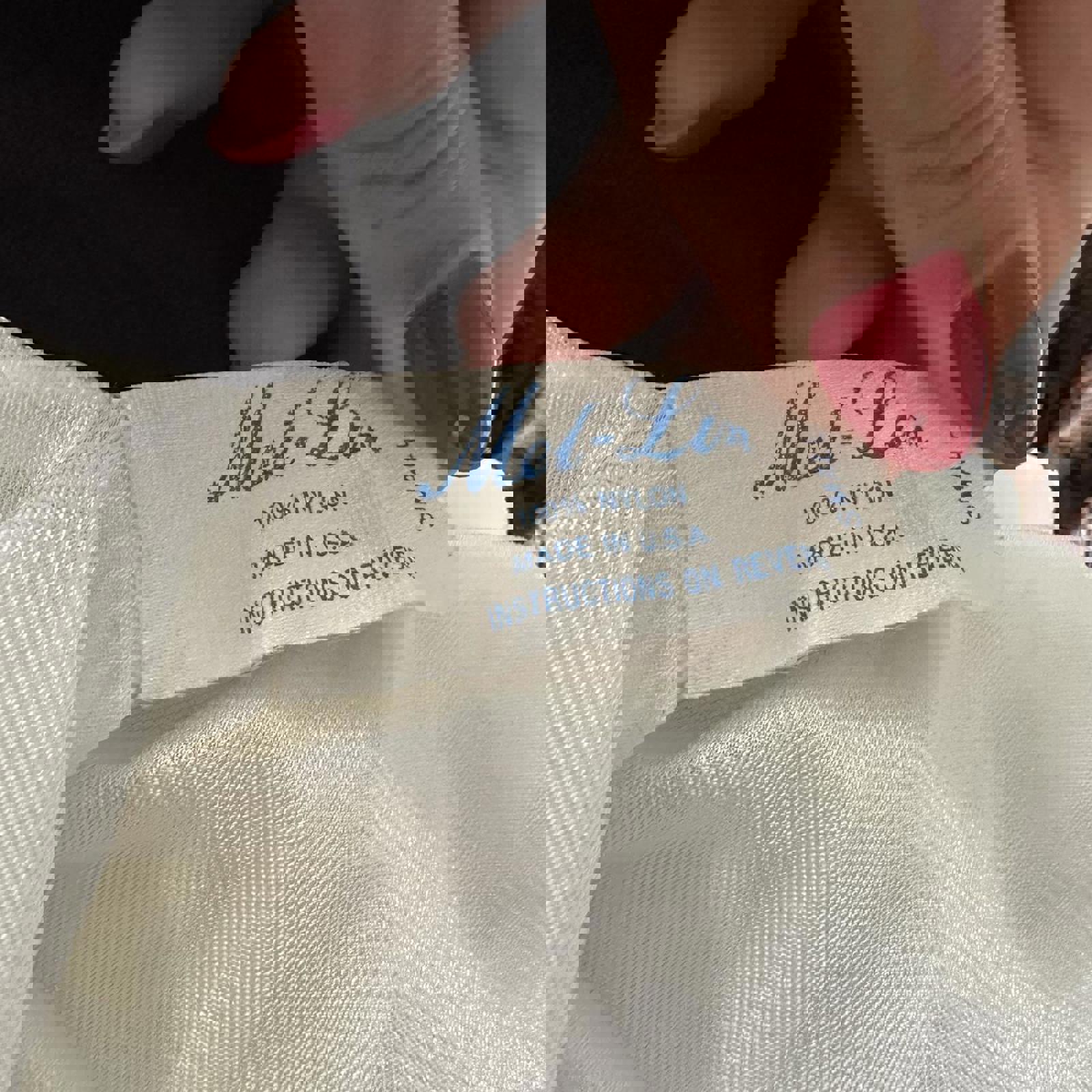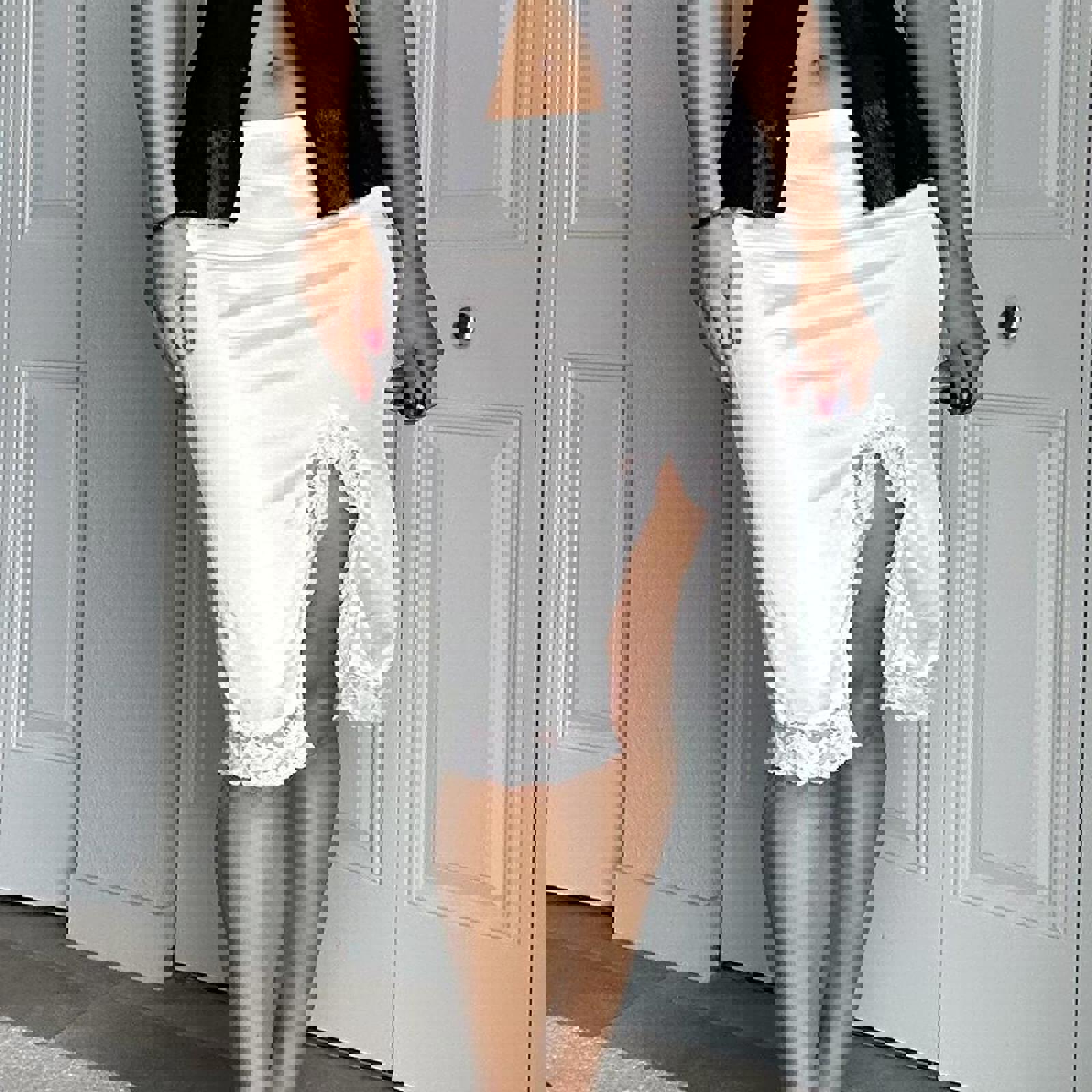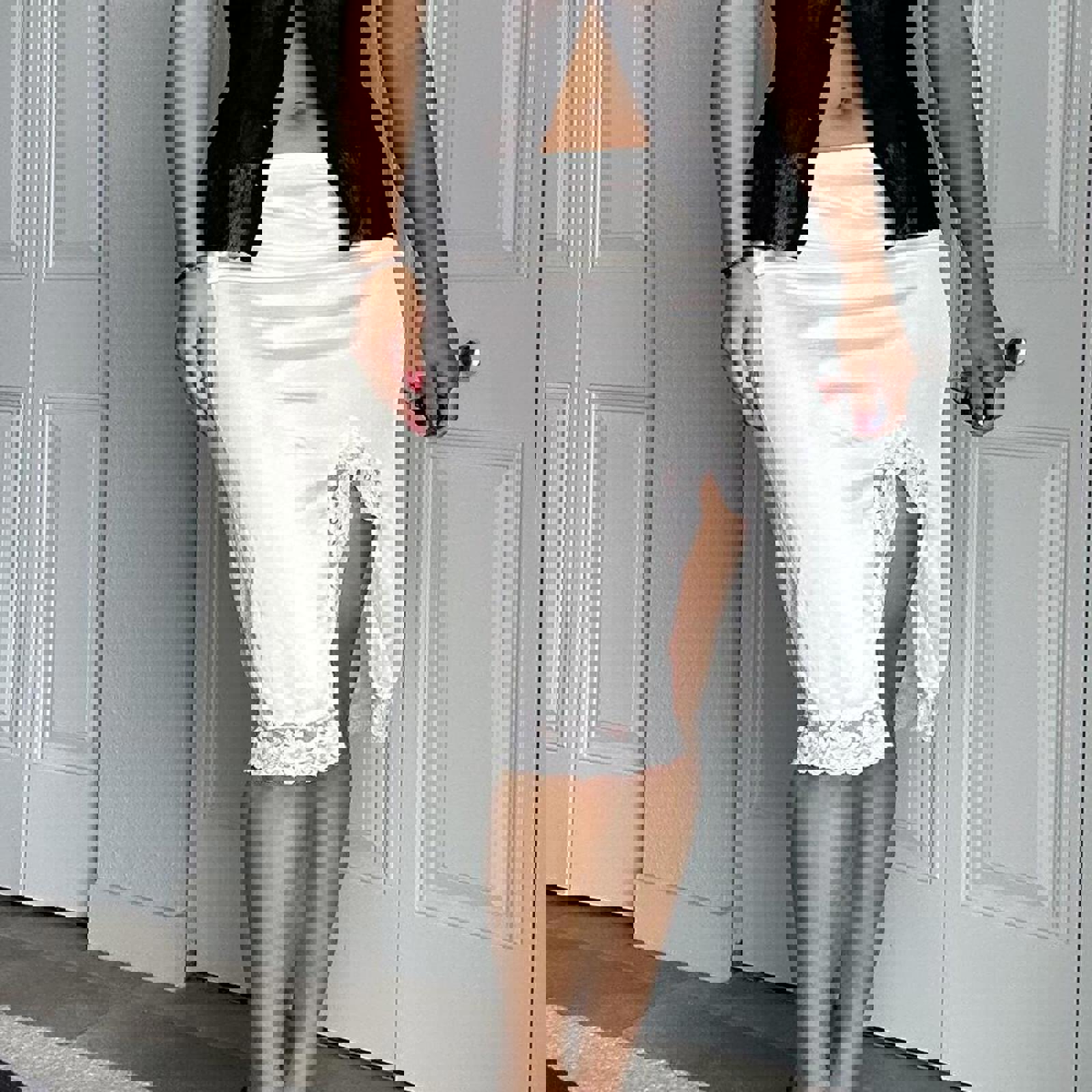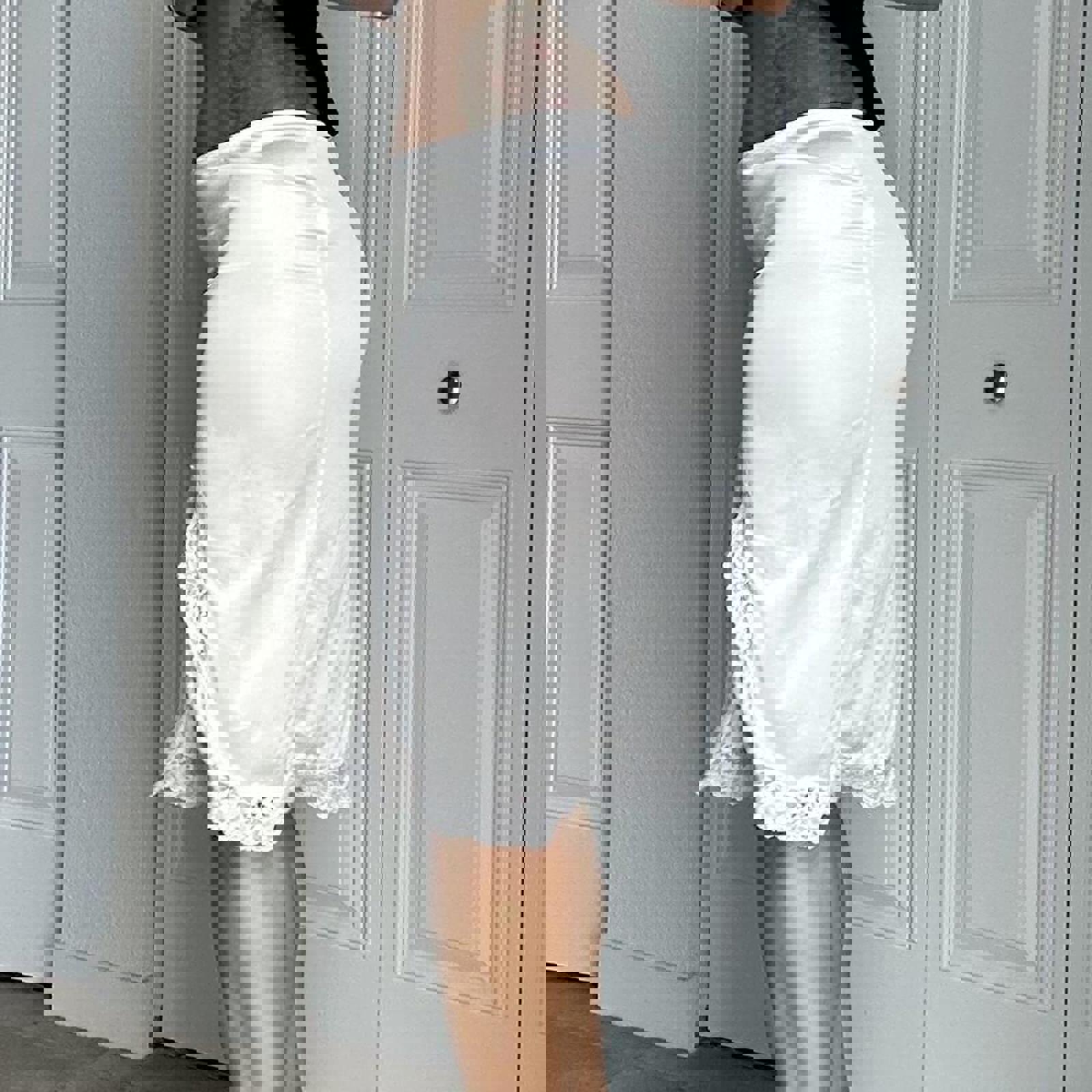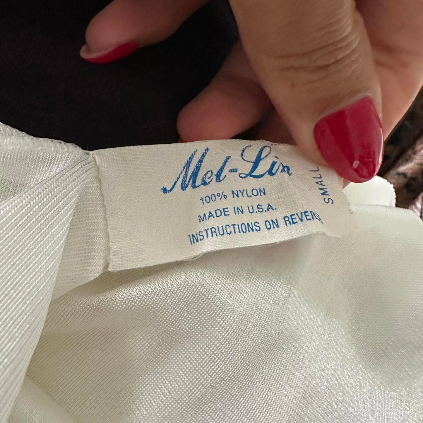 681. Mel-Lin 100% nylon white/cream slip skirt in a size small. Has a slit with lace detailing. It is in perfect condition.