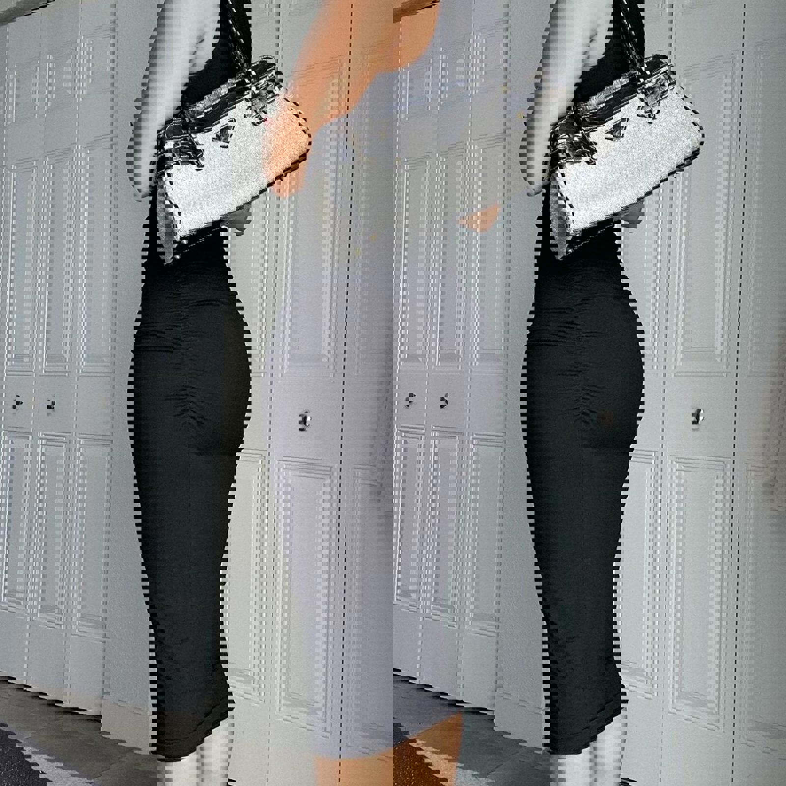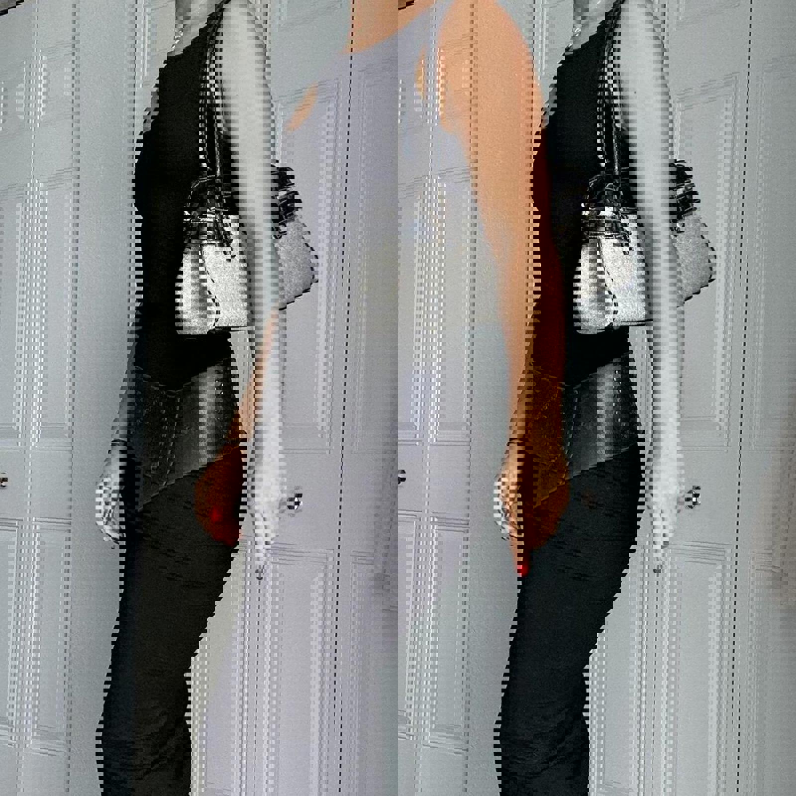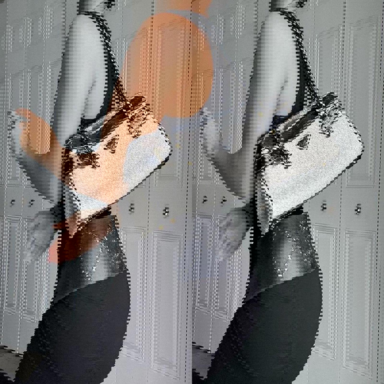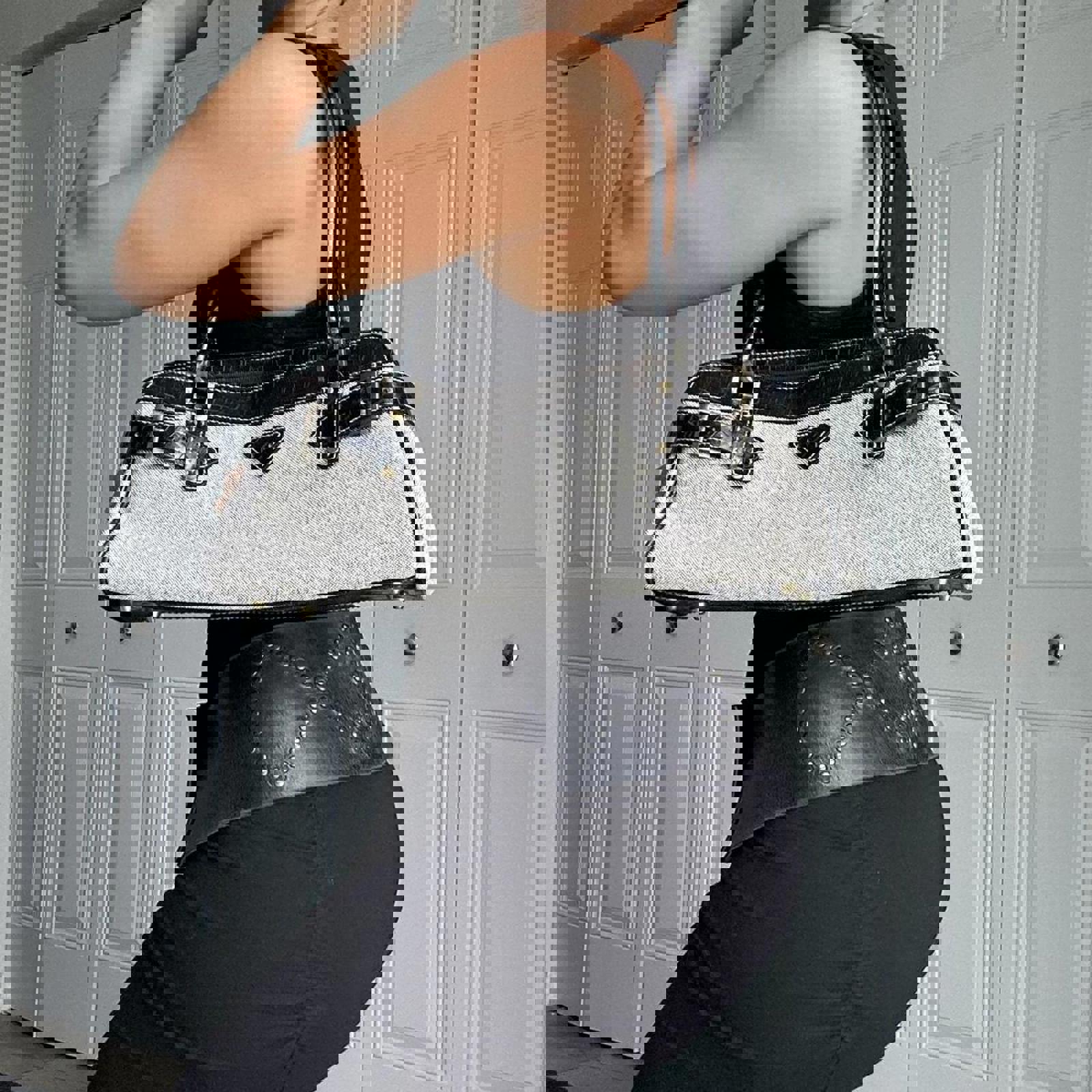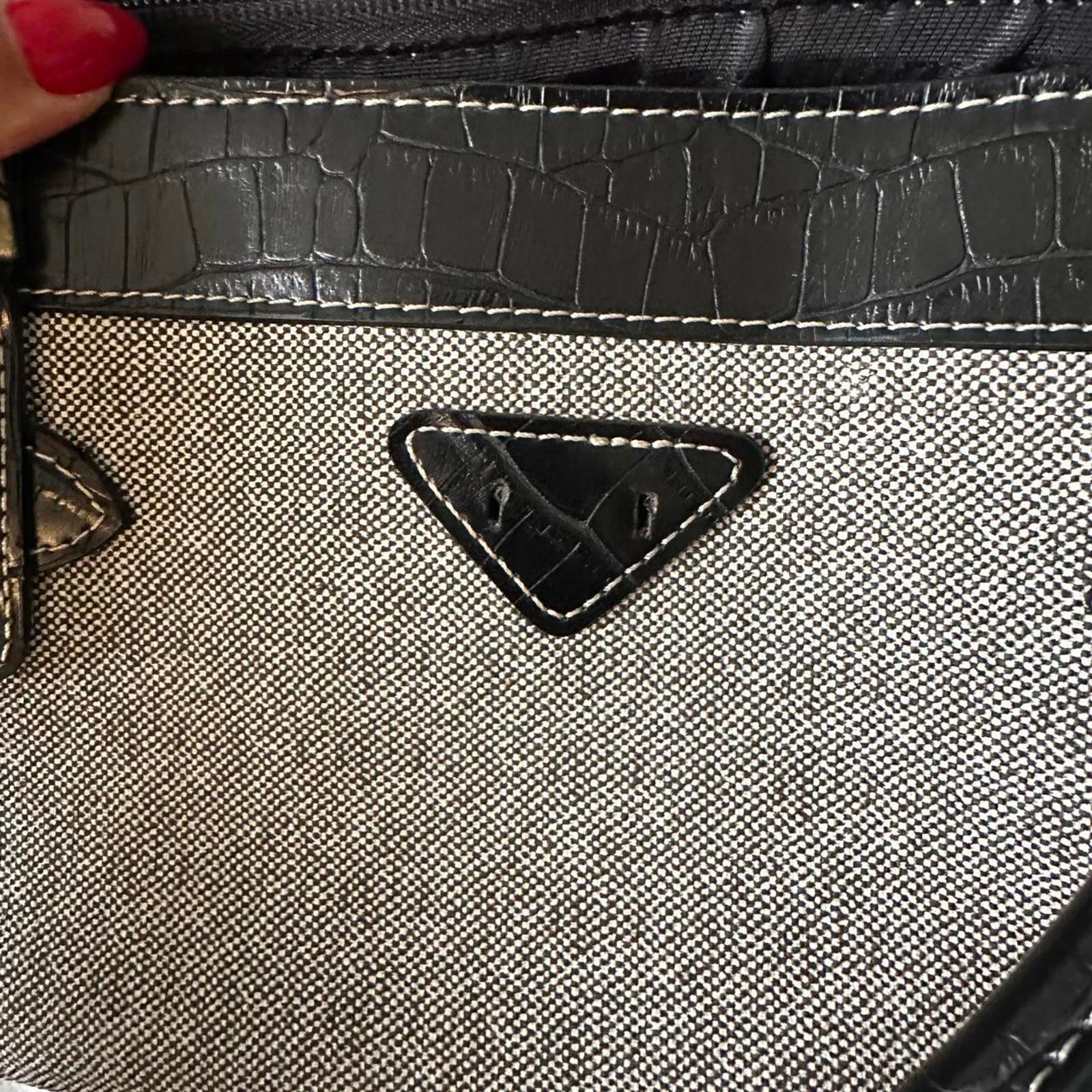 671. Gray and black unbranded bowling bag in very good vintage condition. There is no brand labeling, just a triangle on the front. Photos shown of the inside as well. Length is 15 inches, width is 4 inches, and depth is approximately 7 inches.
