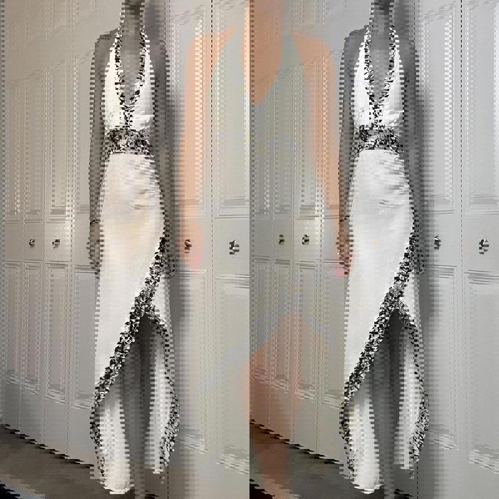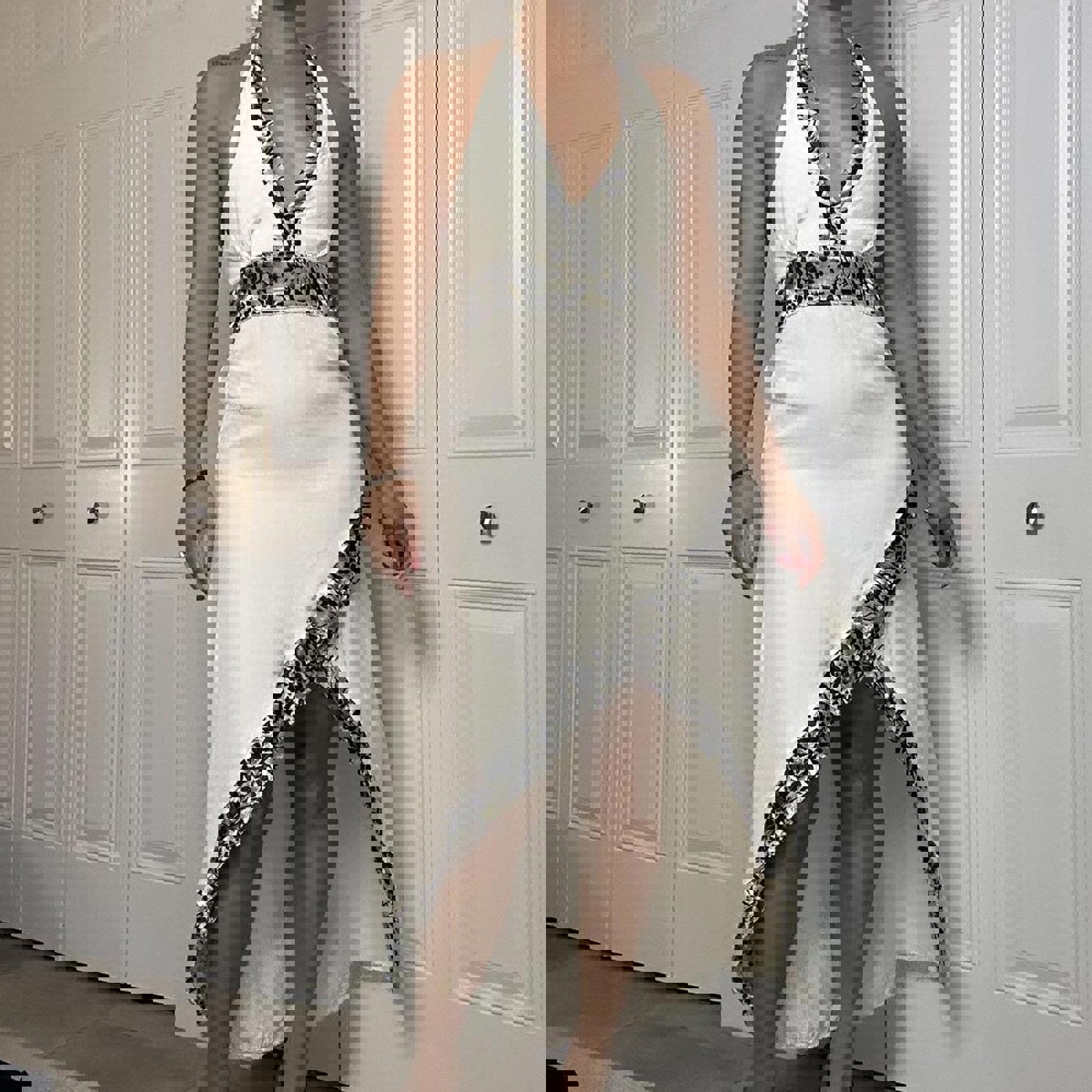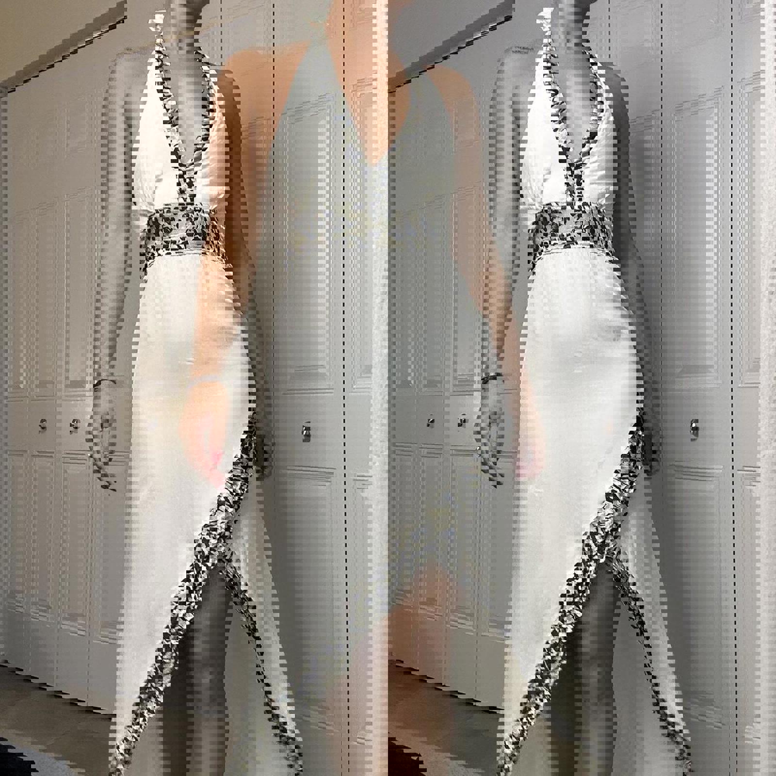 697. Wuwatu cream and black halter dress with cheetah accents in great condition. Has high-low feature. It is a size medium shown on a size small.
