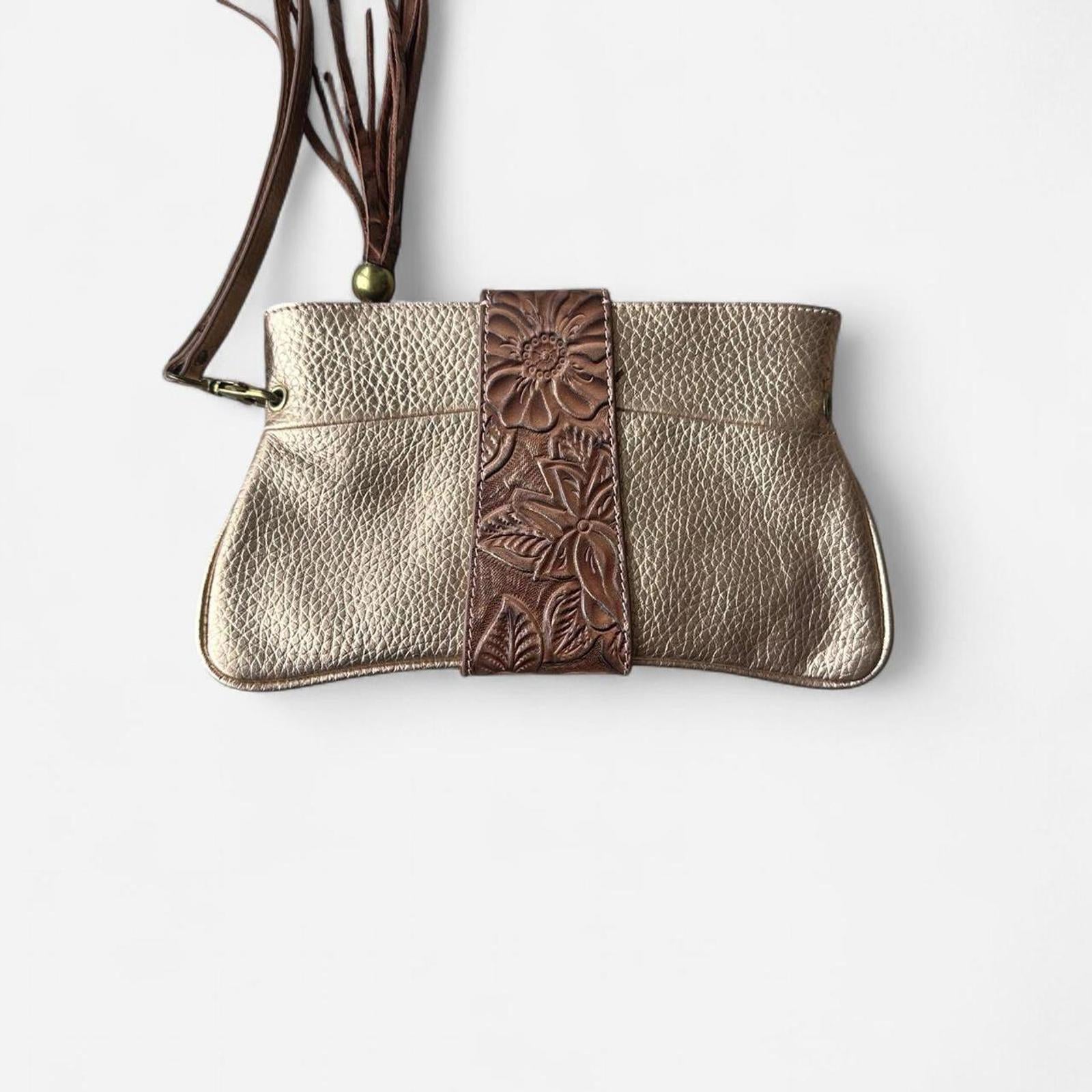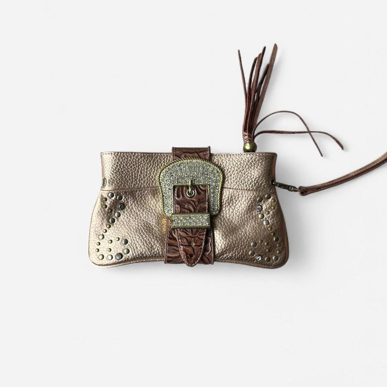 leather clutch, gold accents, buckle detail, tassel, vintage accessory, small mark, compact bag, structured design, evening clutch, classic style