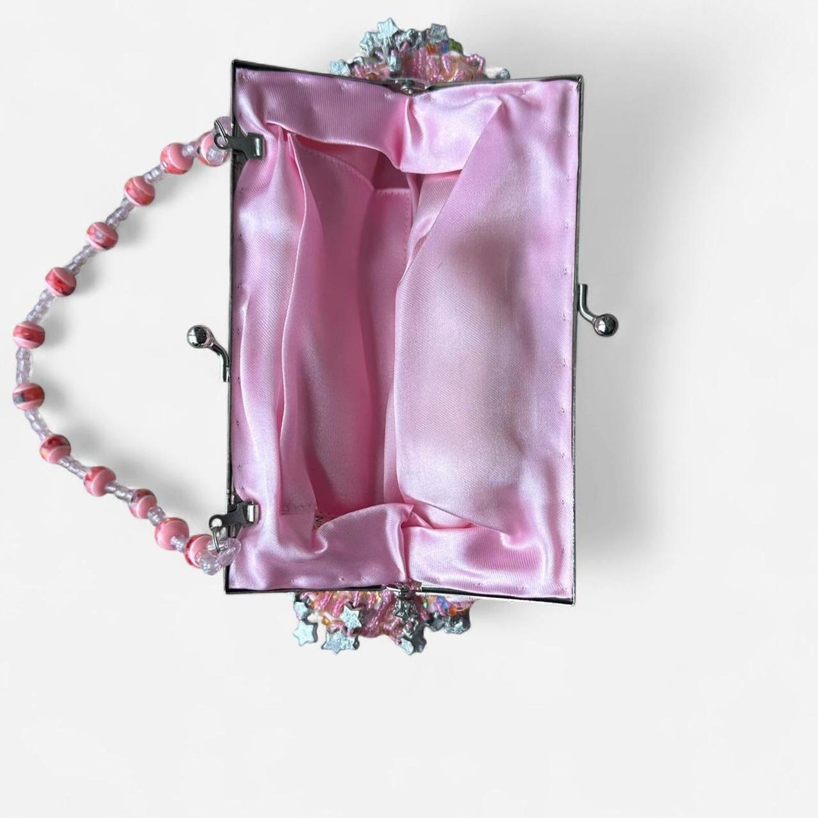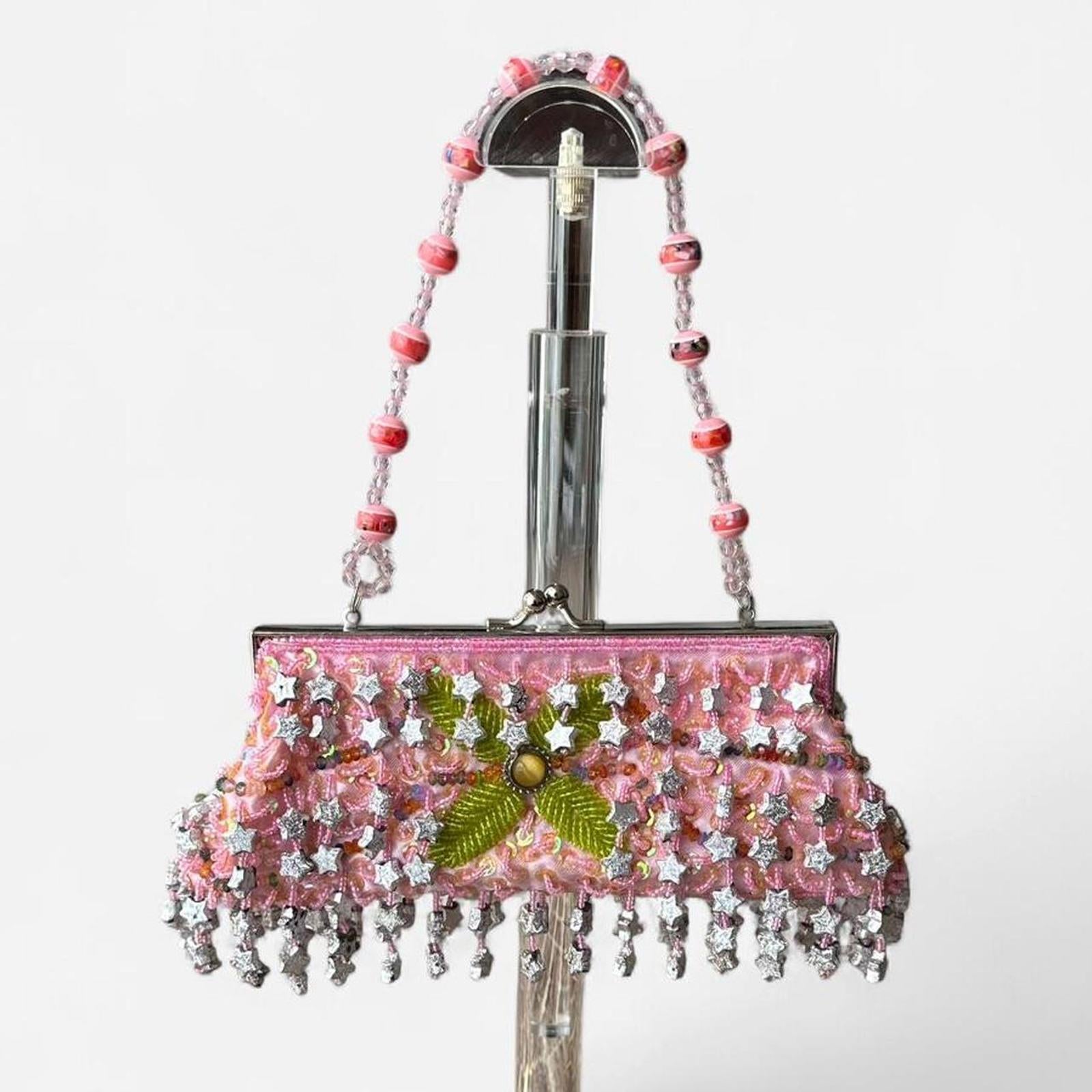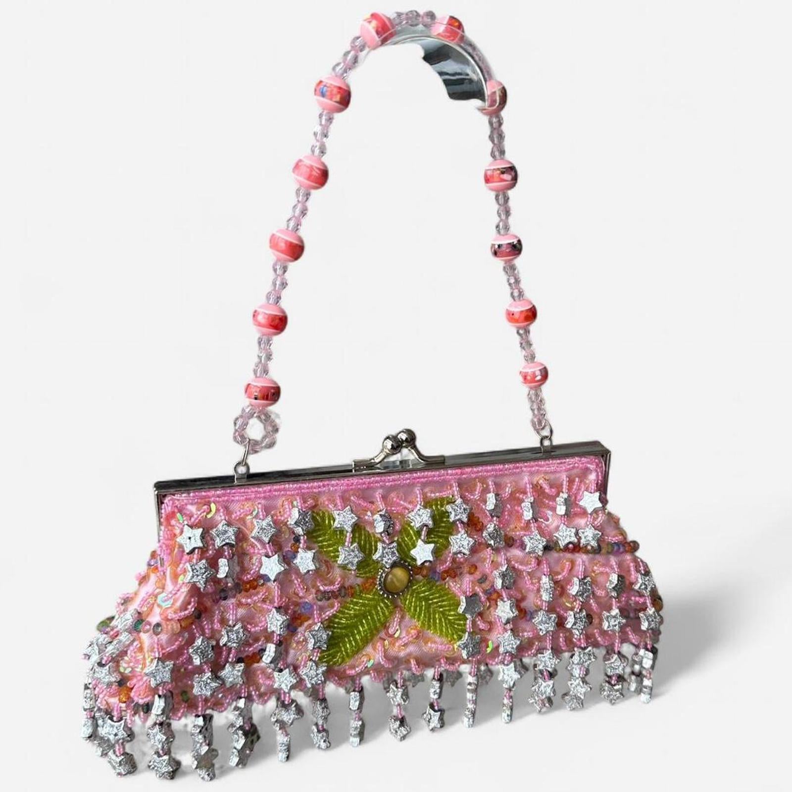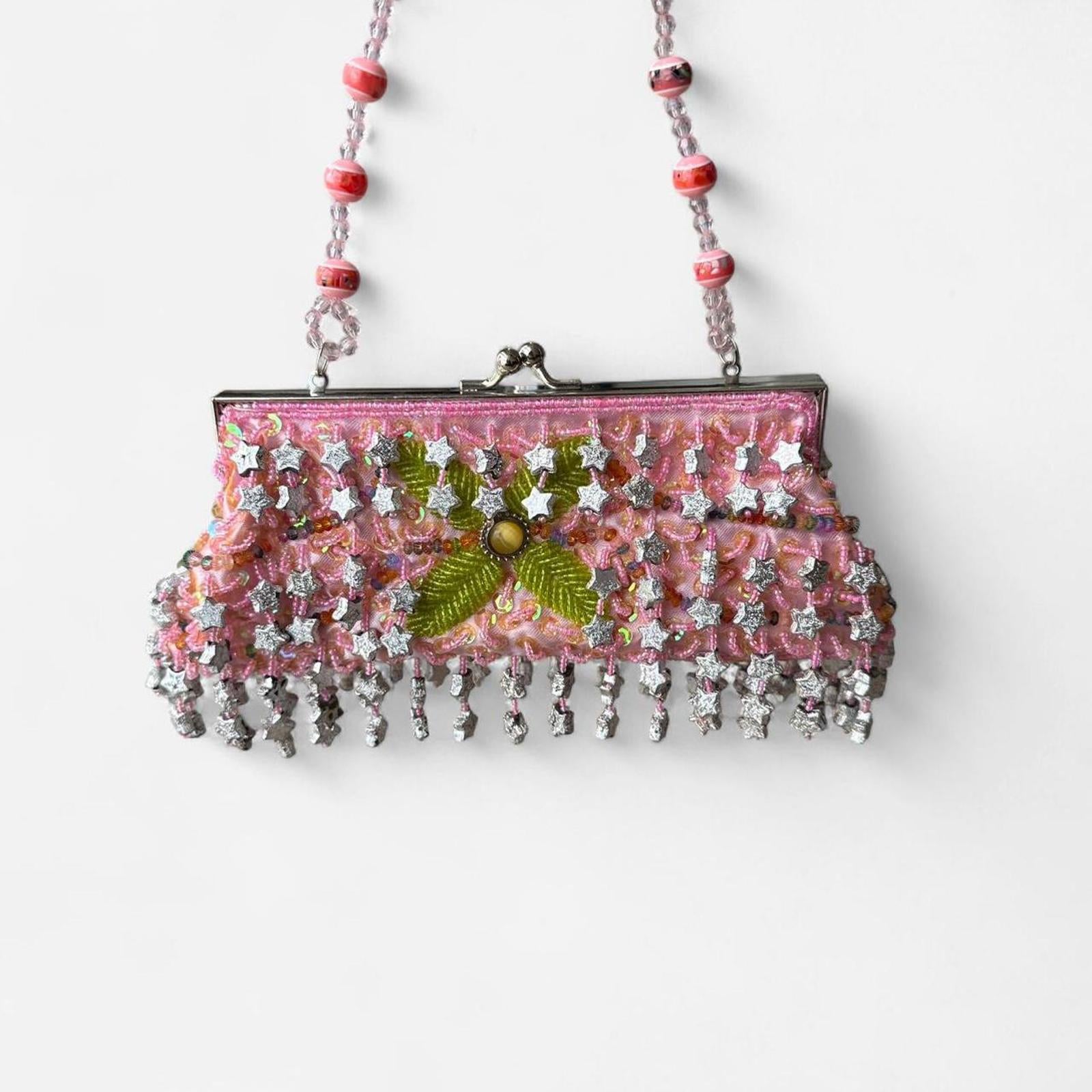 pink and green beaded, vintage purse, star silver accents, retro bag, sparkly embellishments, statement accessory, formal clutch, evening bag, collectible embellishment, classic style