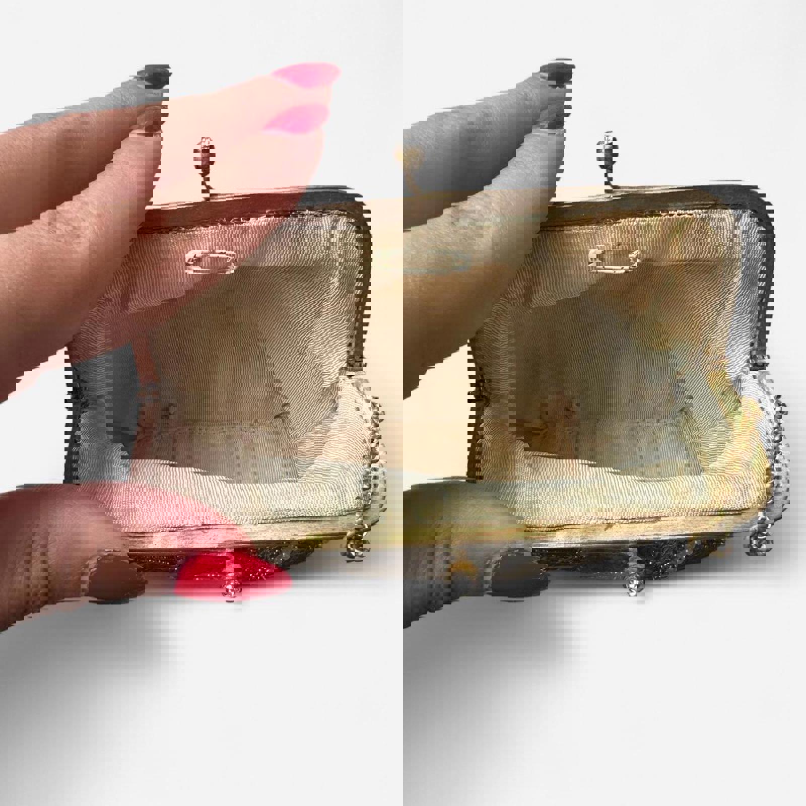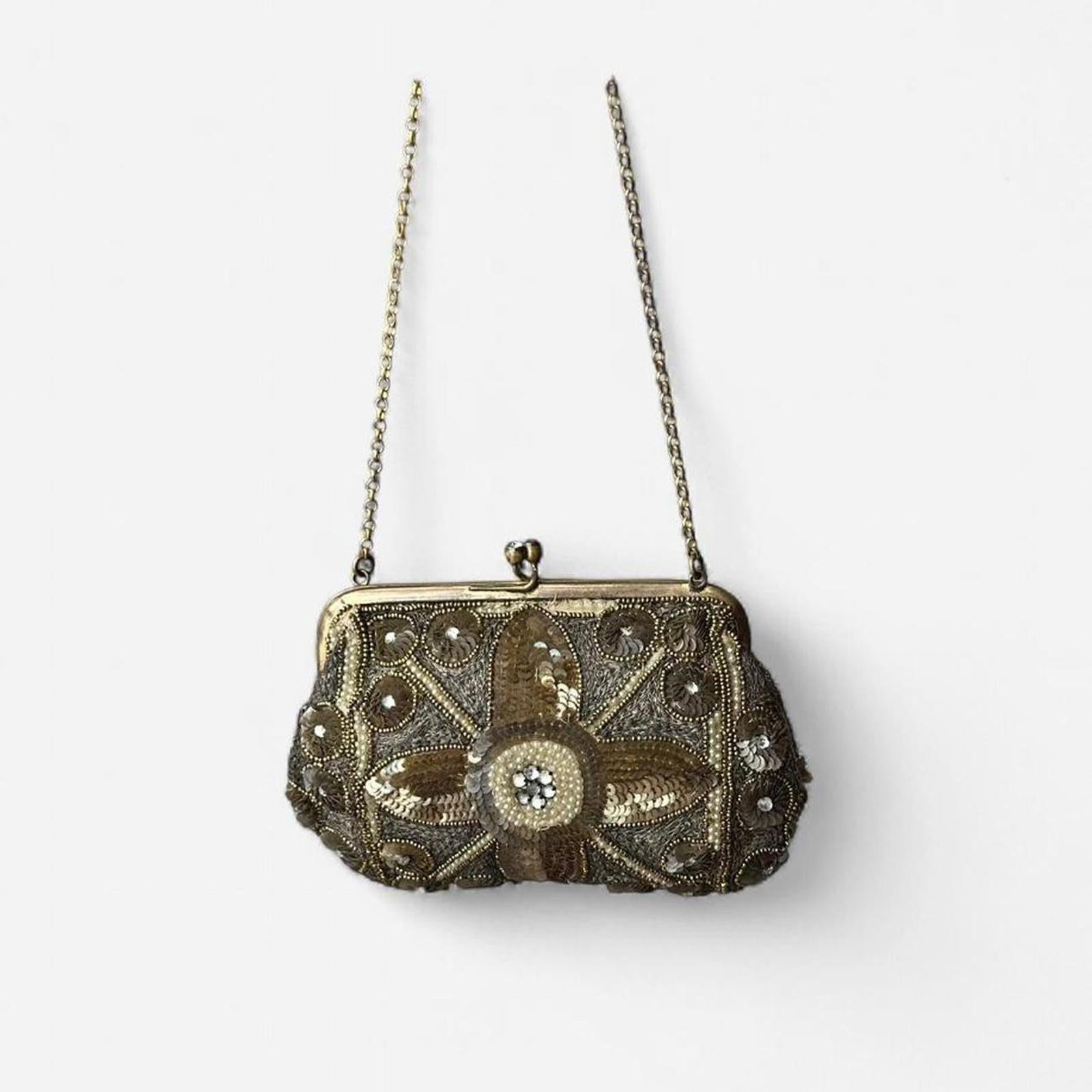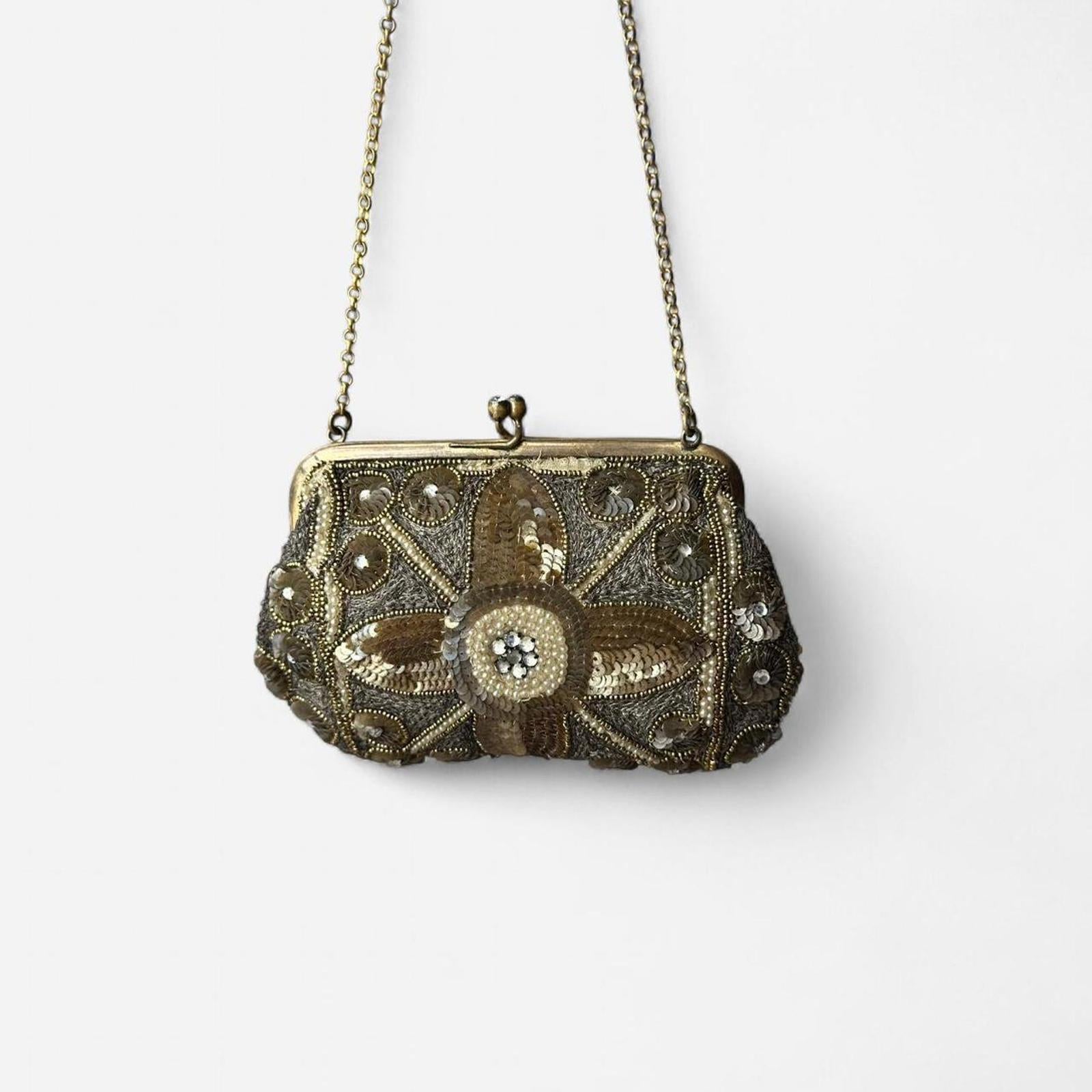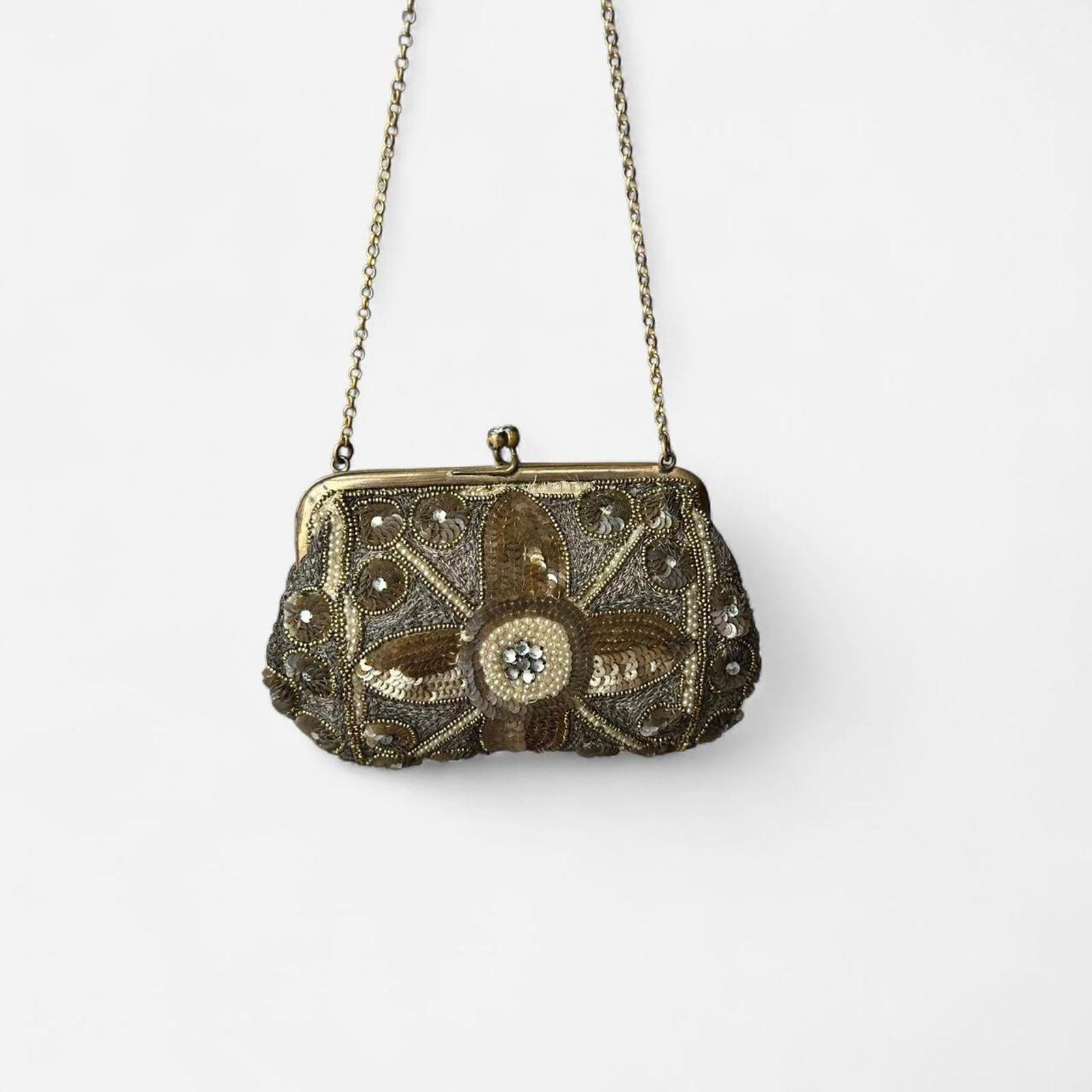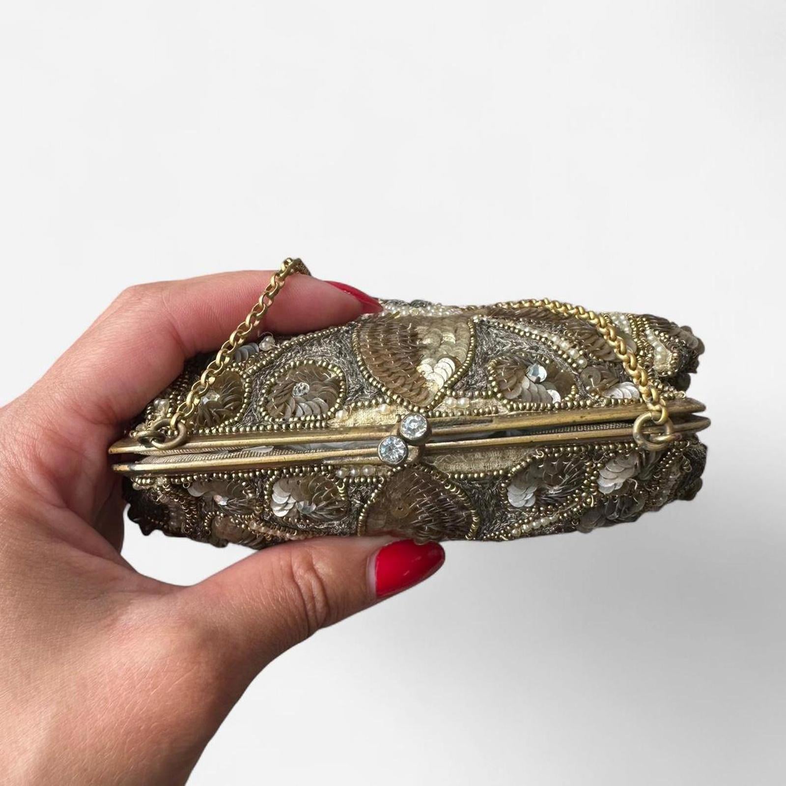 beaded sequined, vintage mini bag, metallic accents, ornate clasp, retro accessories, evening clutch, embellished purse, glam accessory, gold-tone, petite bag