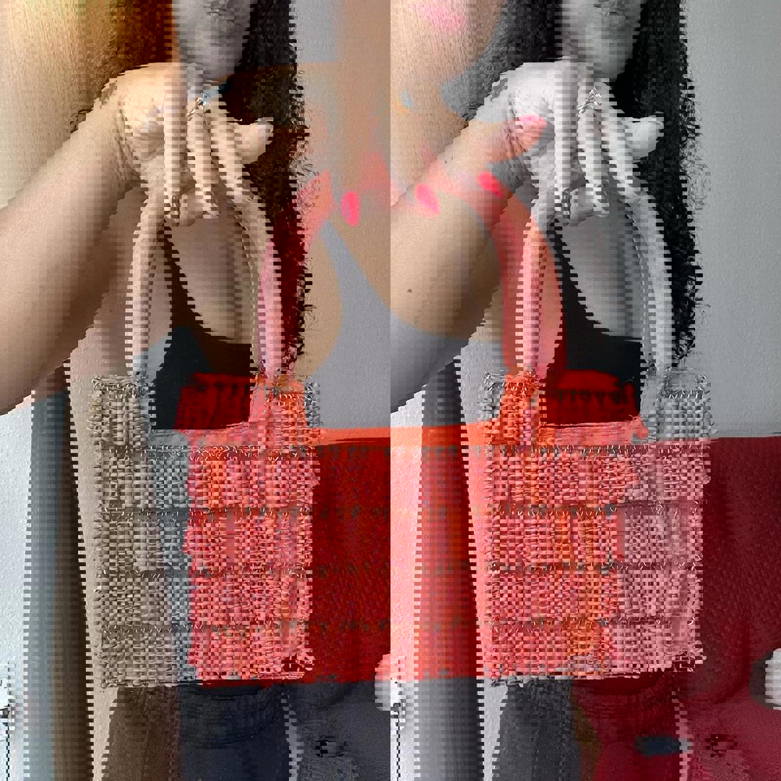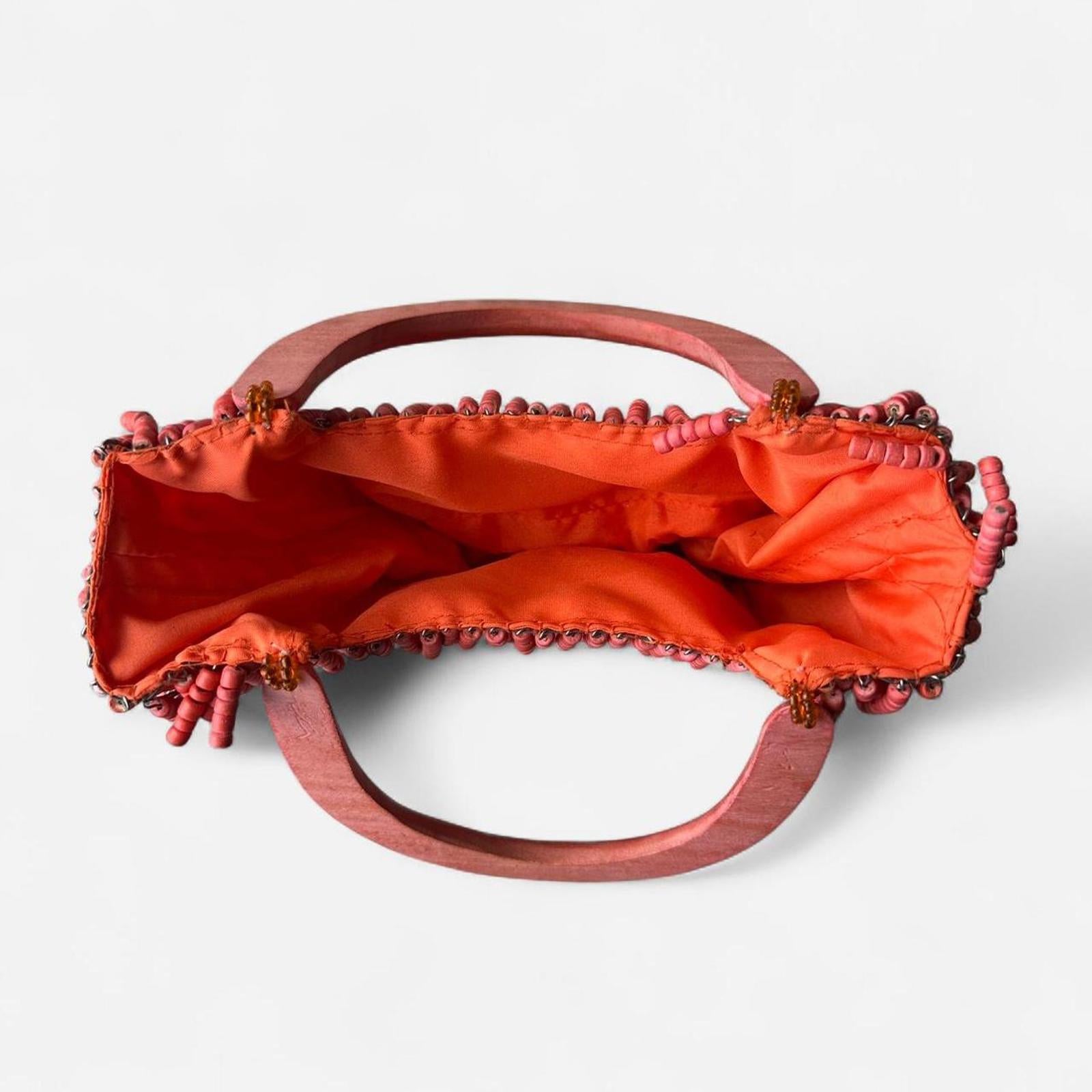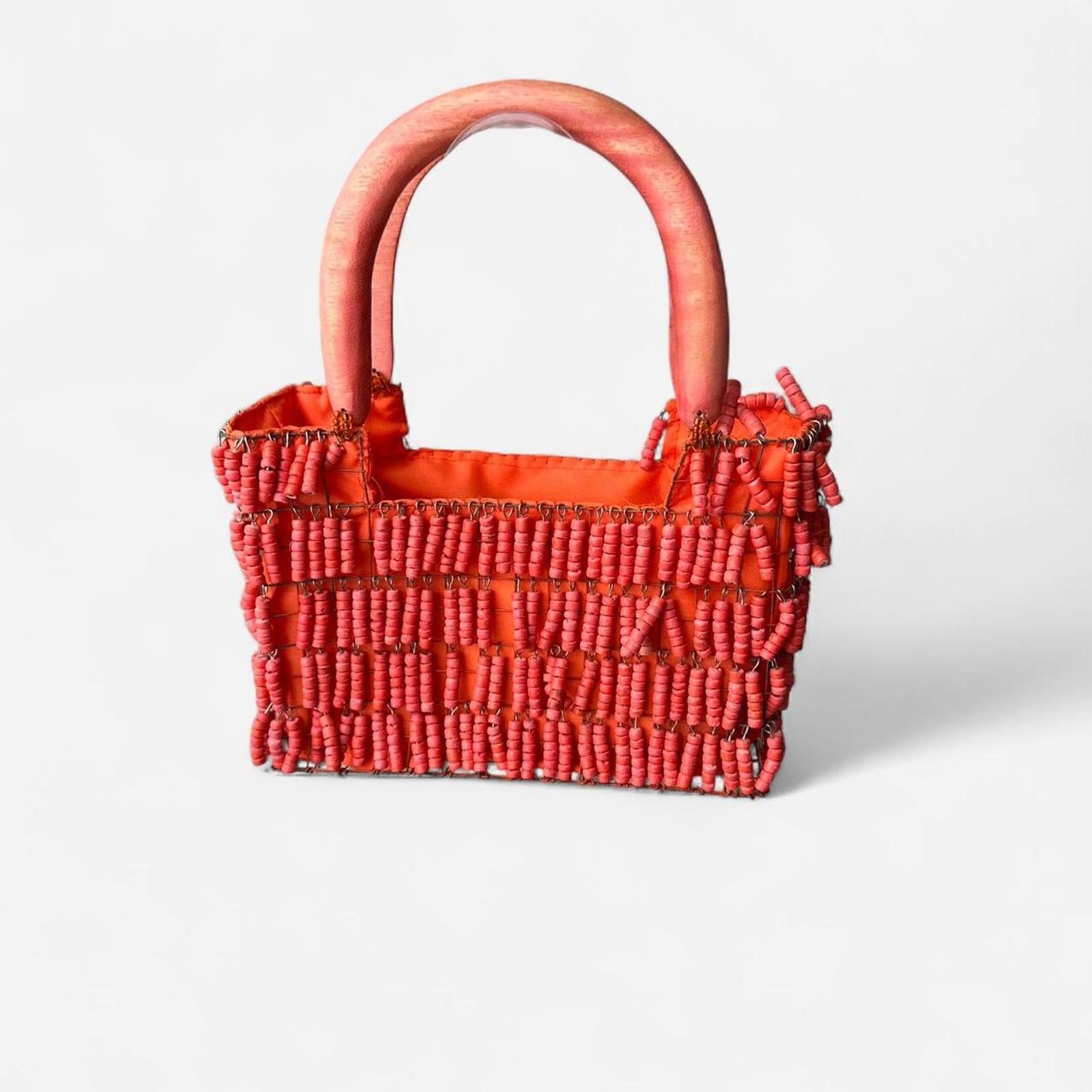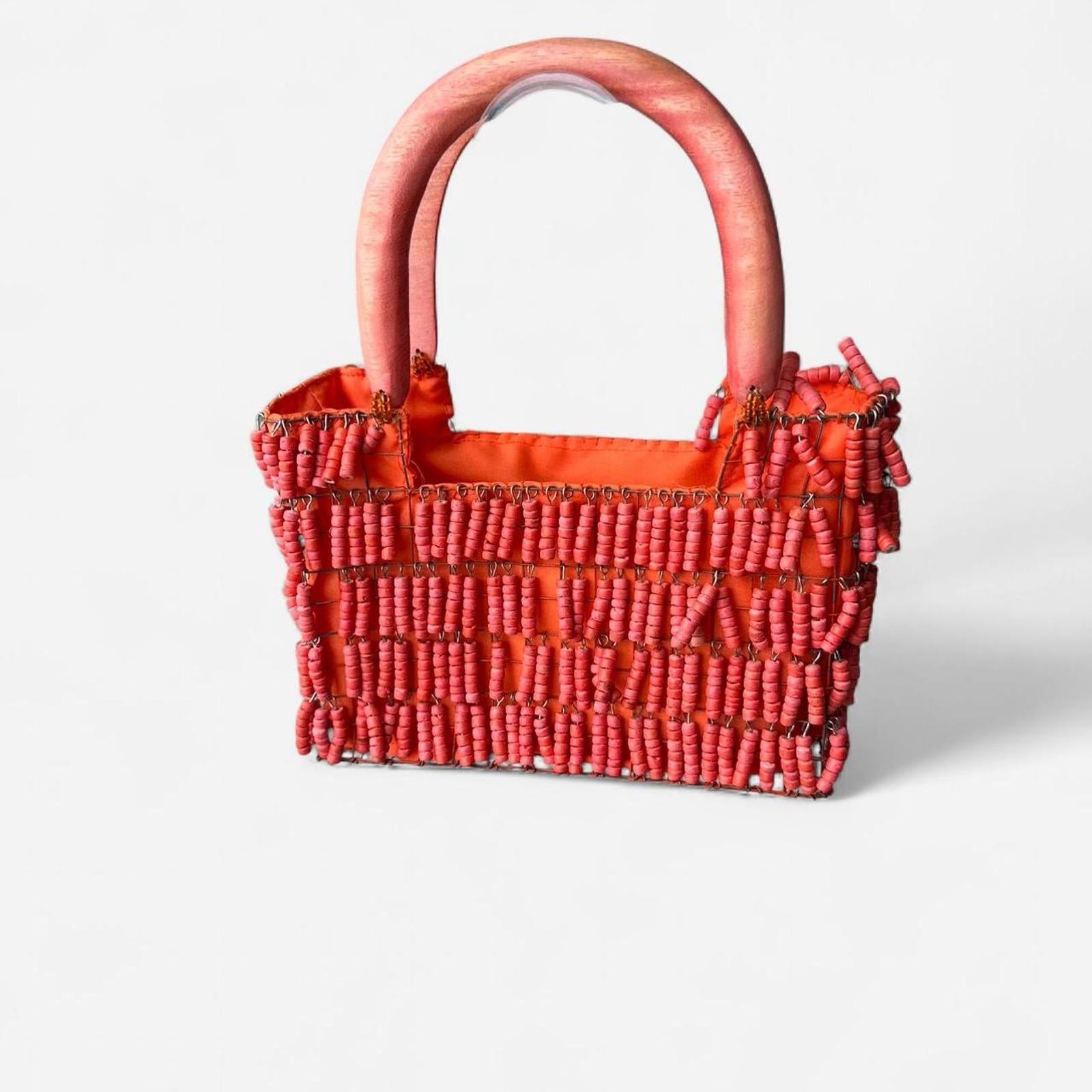 738. Coral beaded mini bag with square shape and wire detailing. Some beading is missing. Measurements are listed below: