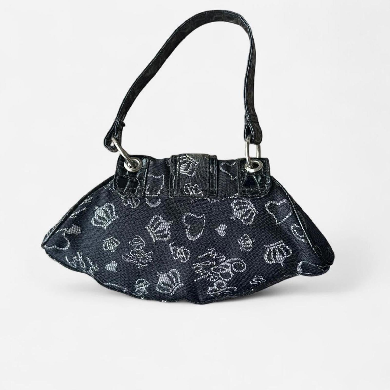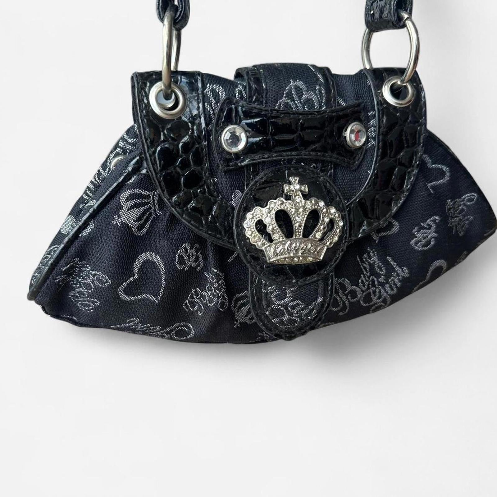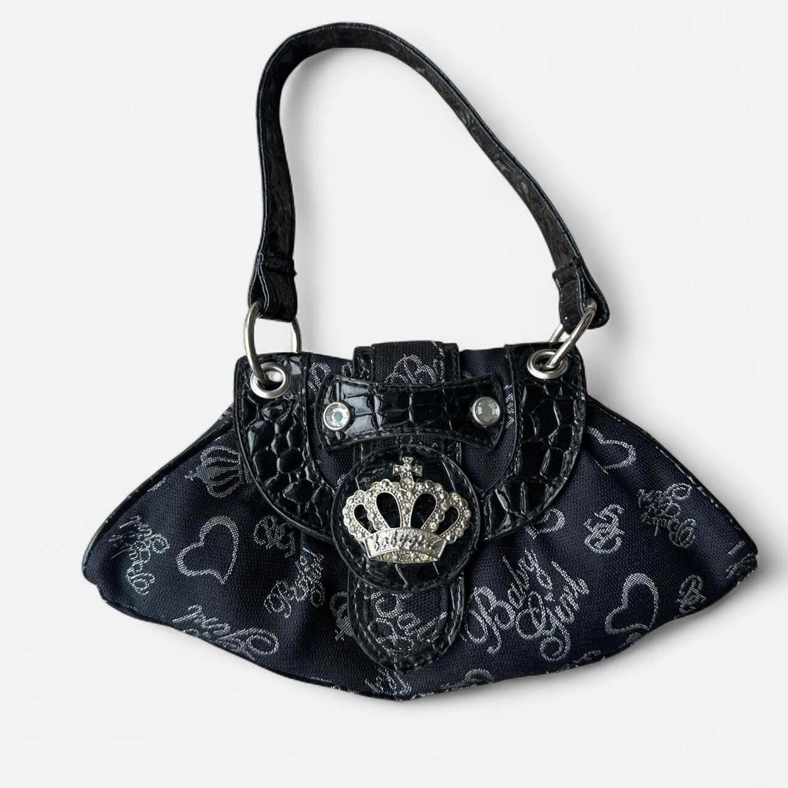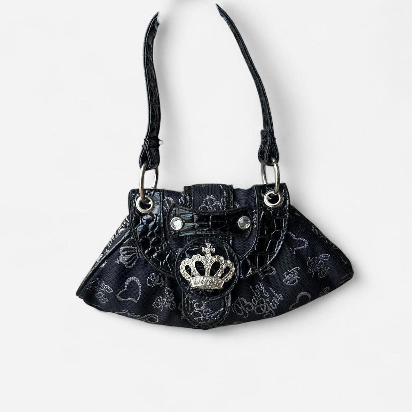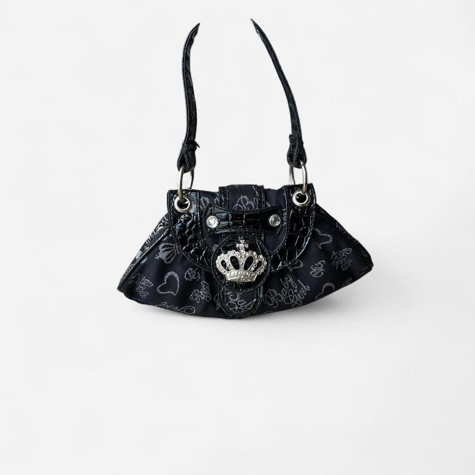 740. Little vintage crown bag that says "Baby Girl" all over it has a patent leather shoulder strap and crown detail in the middle.