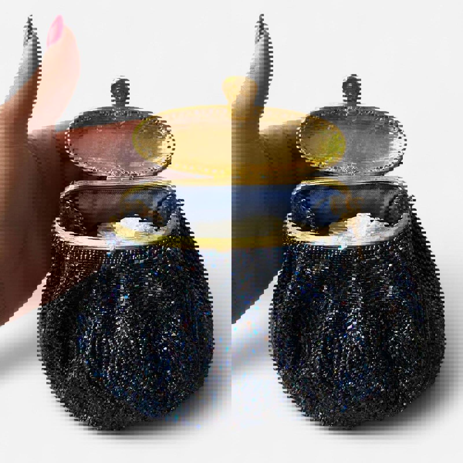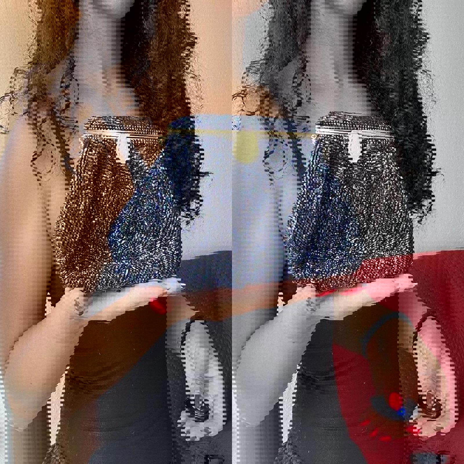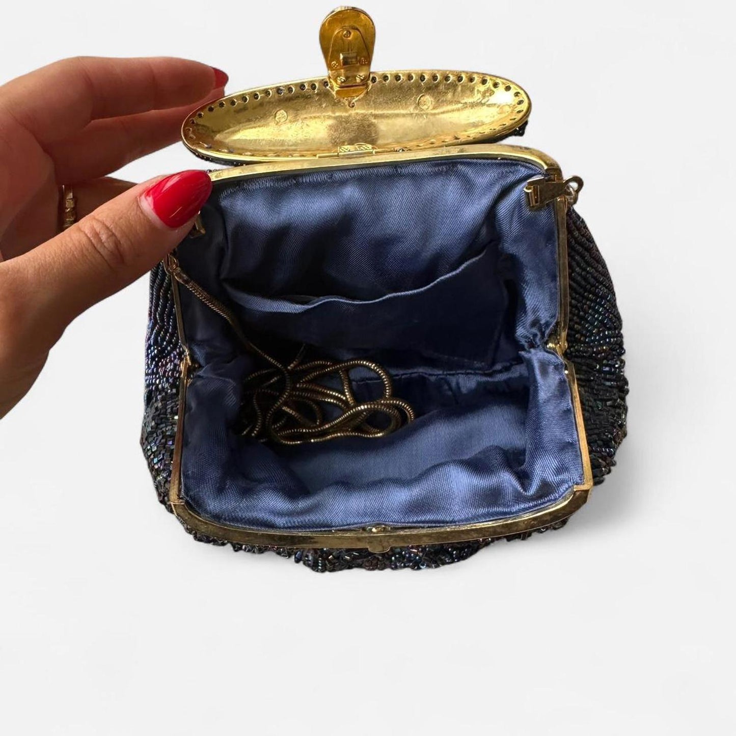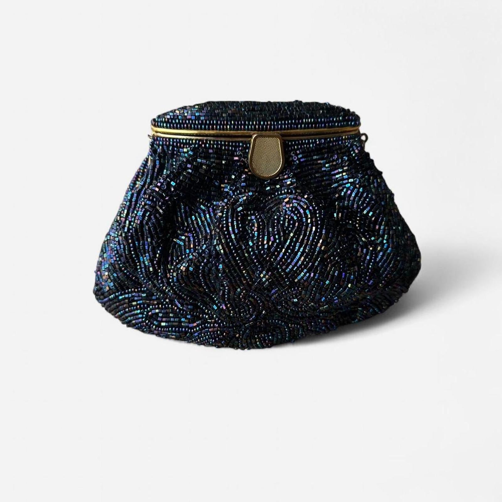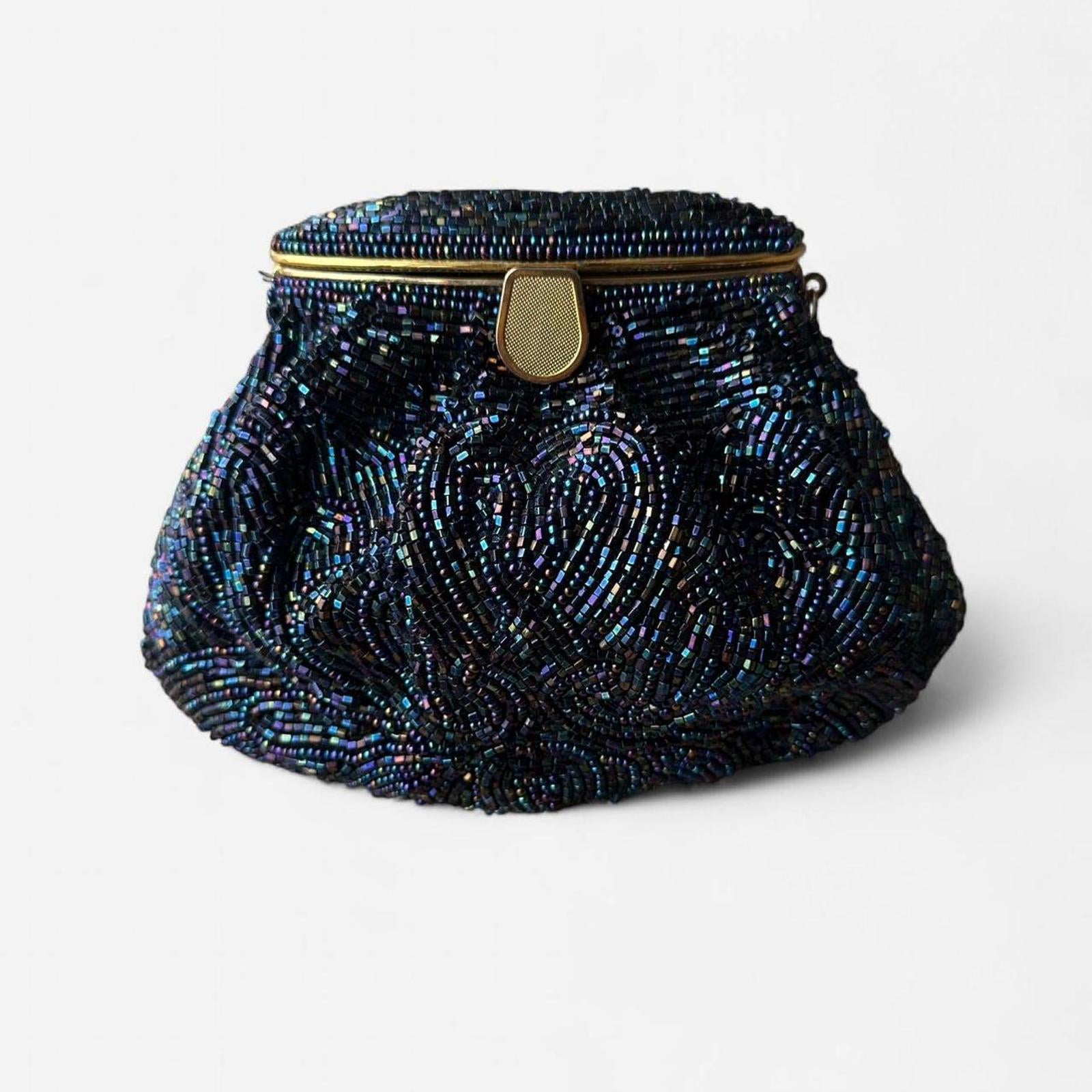 navy blue, beaded, vintage clutch, gold hardware, evening bag, small accessory, ornate design, retro style, elegant purse, statement piece