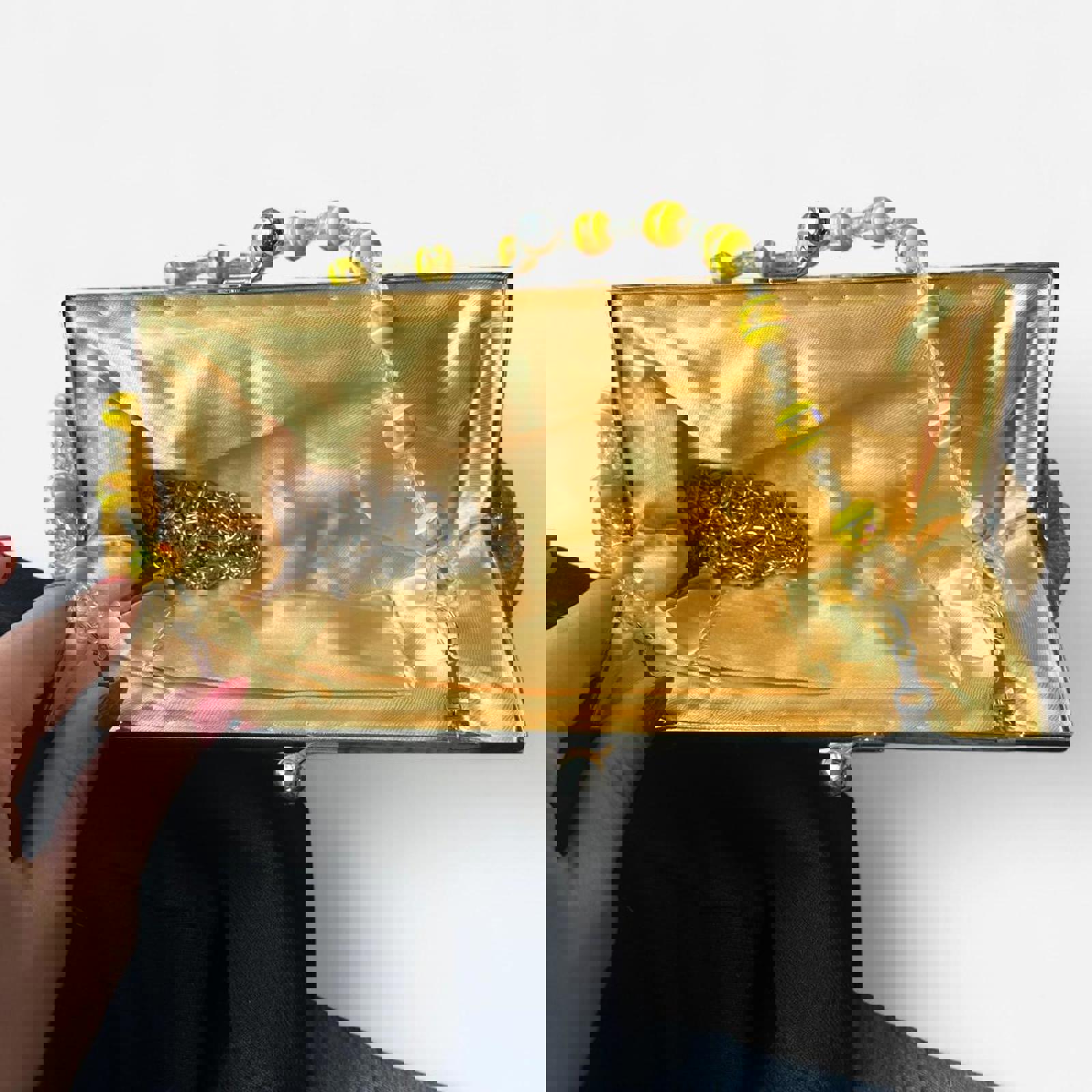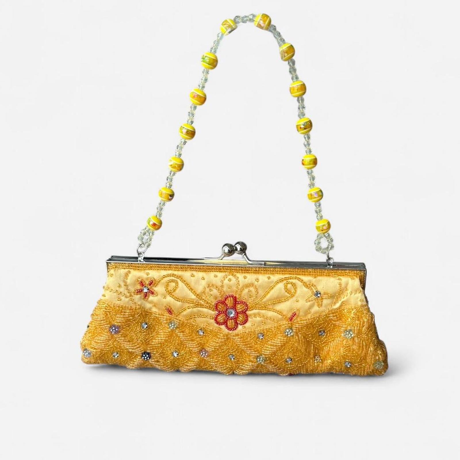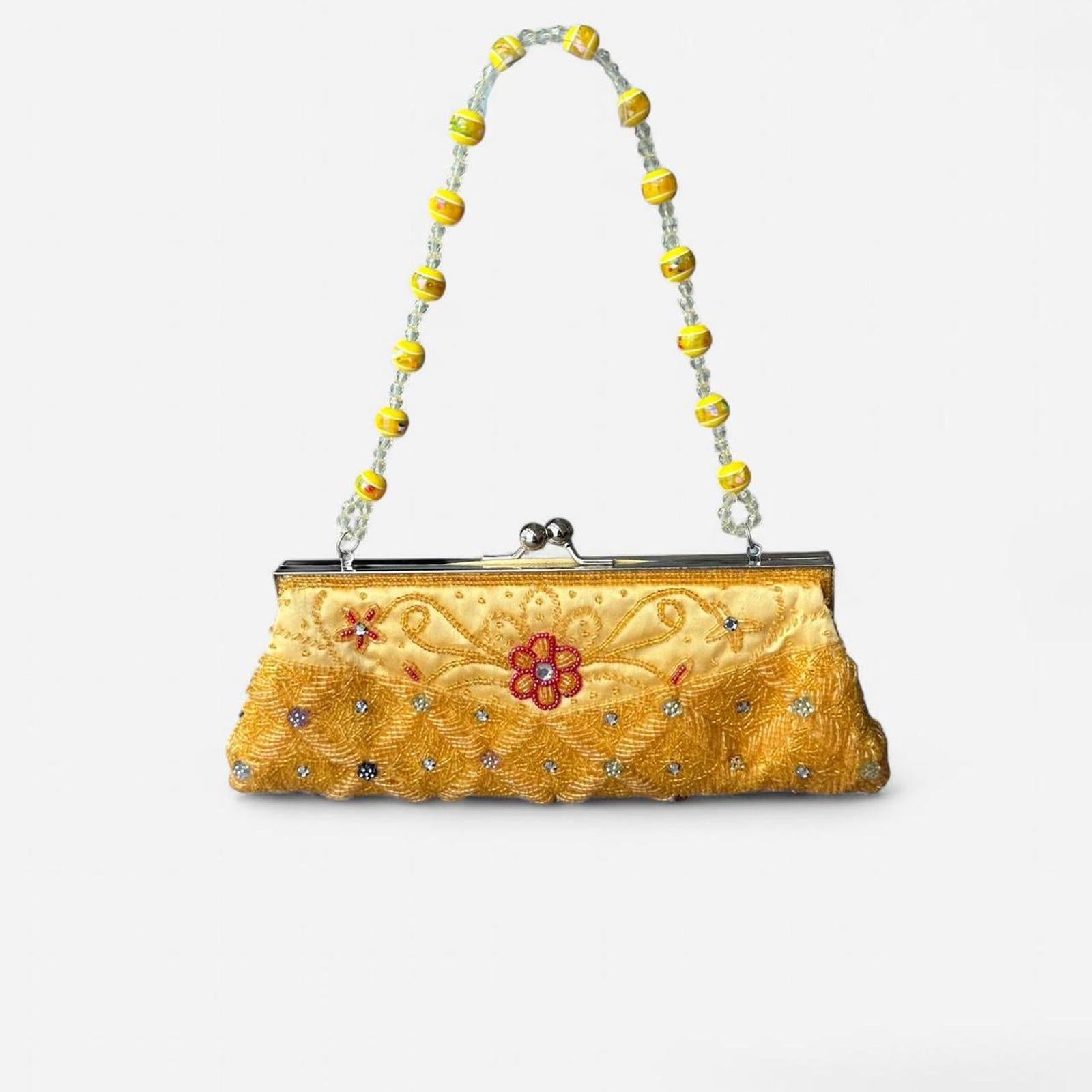 742. Absolutely perfect beaded yellow vintage bag. Excellent condition has little flowers everywhere. A couple of beads missing, but nothing noticeable. Measurements are listed below: