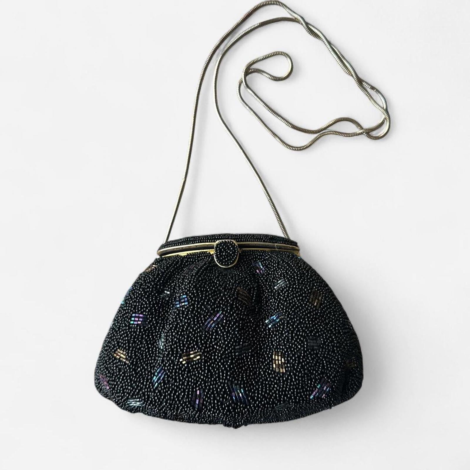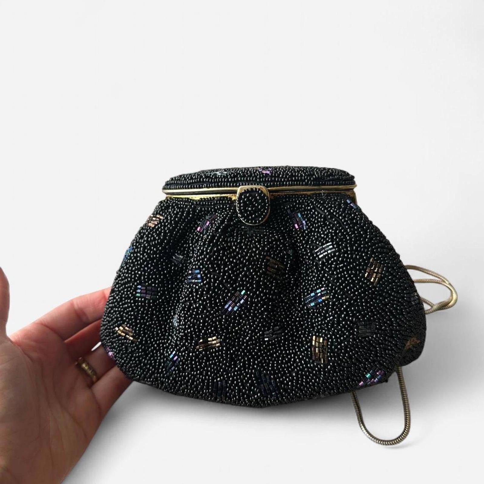 744. The black mirror purse. In perfect condition, this vintage 1980s purse with a mirror on the inside of the clasp is in wonderful condition. Measurements are listed below: