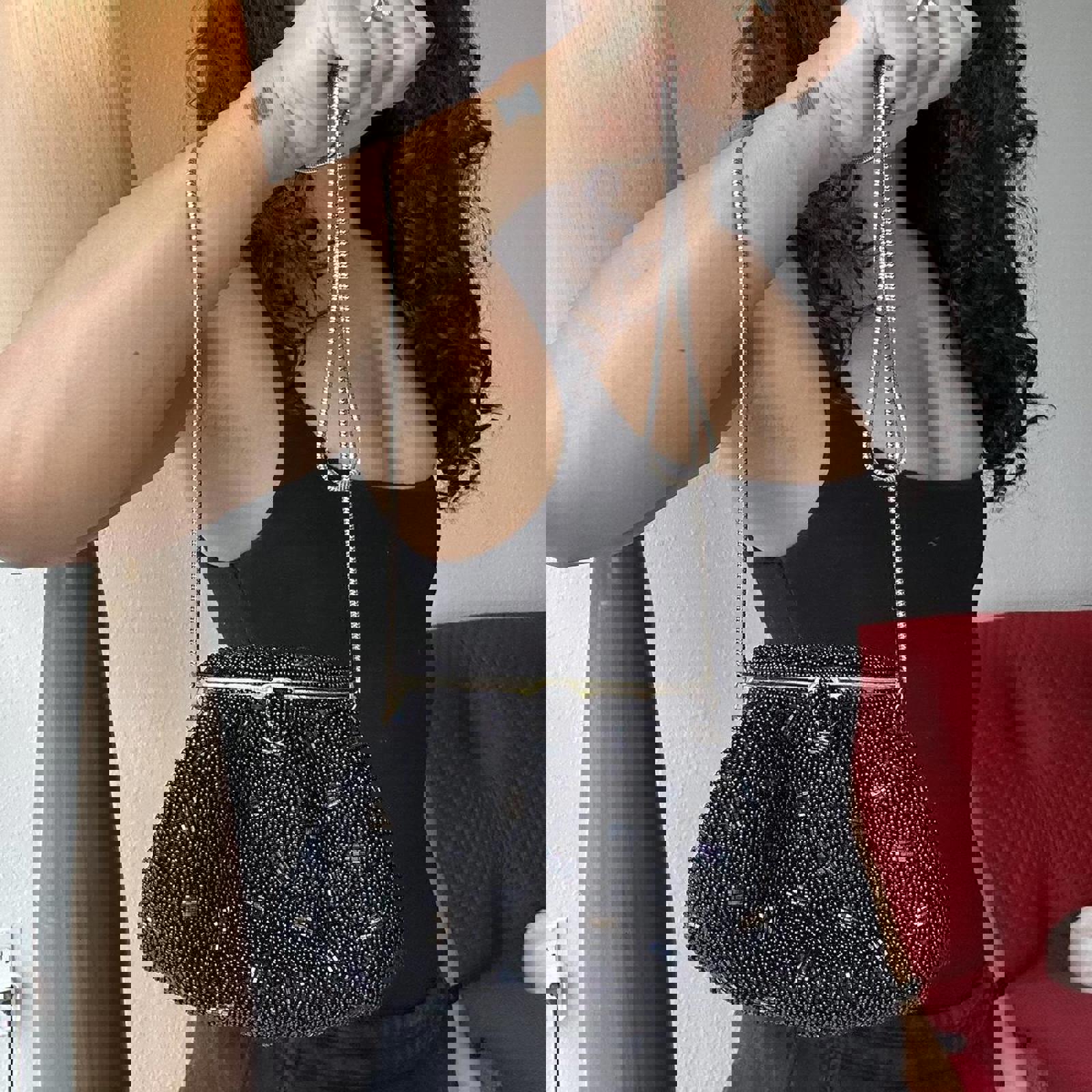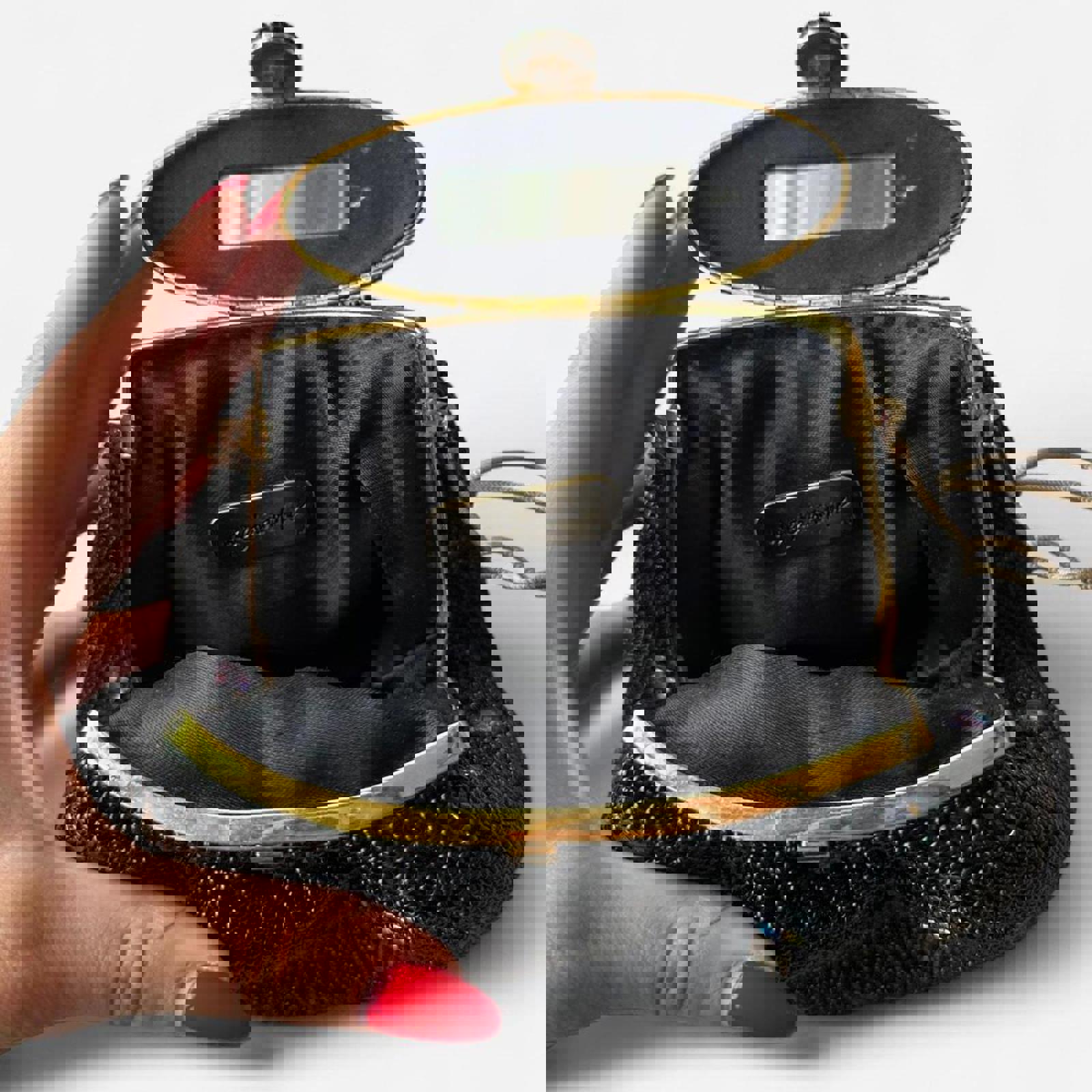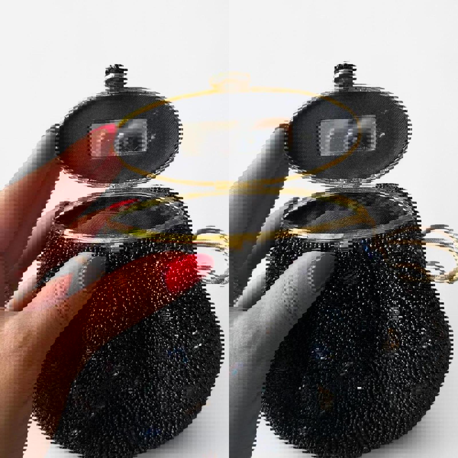 black mirror clutch, vintage 80s, velvet texture, compact purse, retro accessory, evening bag, small crossbody, metallic clasp, minimalist style, statement piece