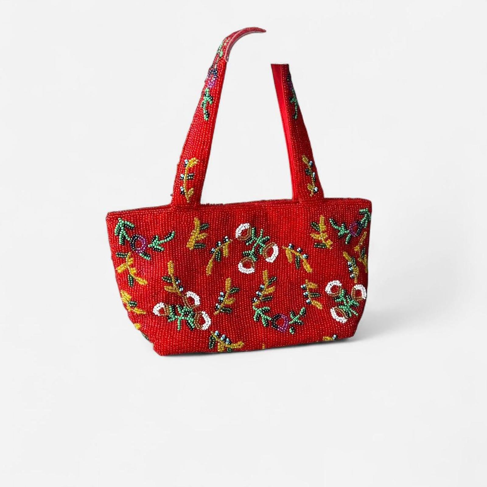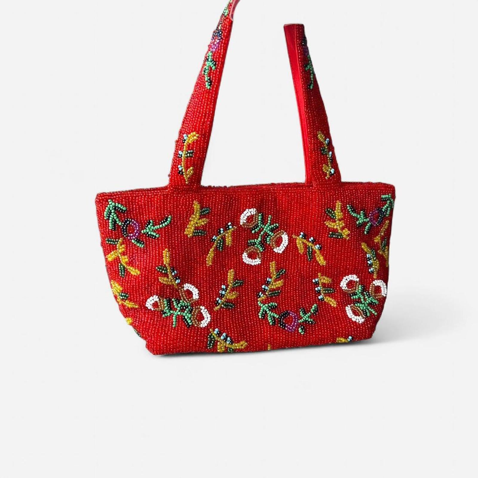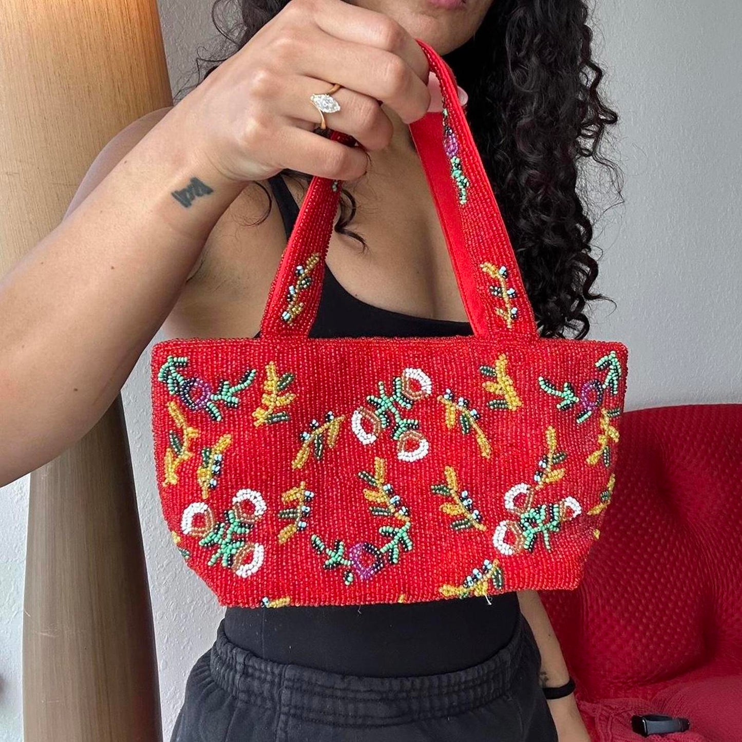 746. Red vintage beaded floral bag in perfect condition, never used. Not a bead missing - so adorable! Measurements are listed below.