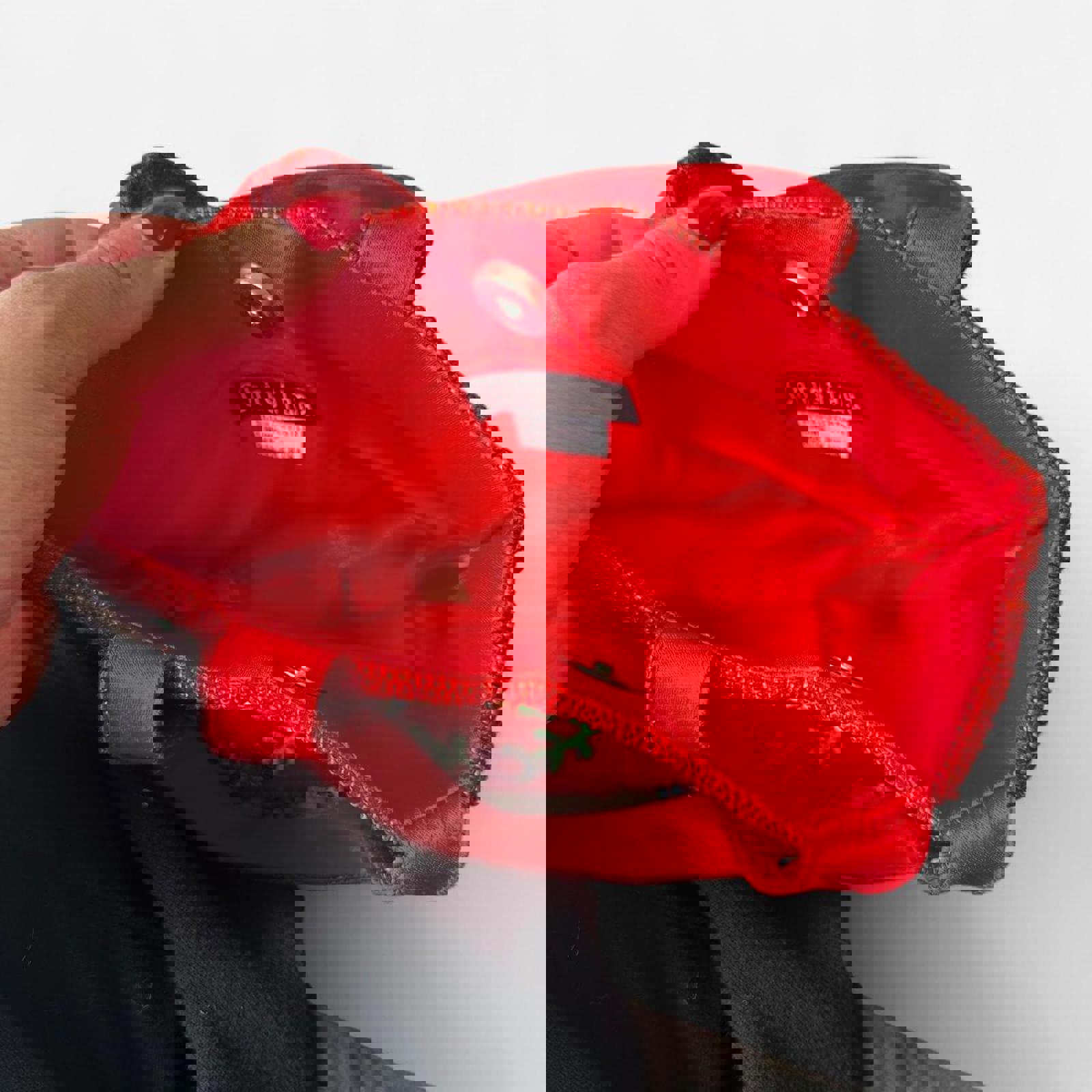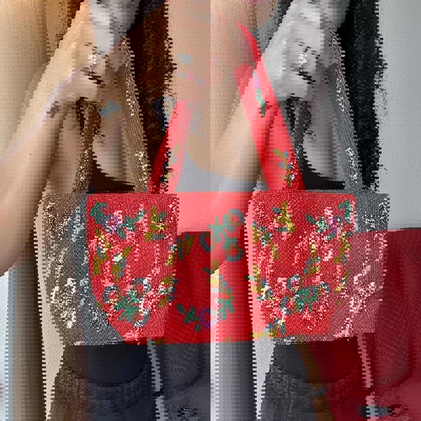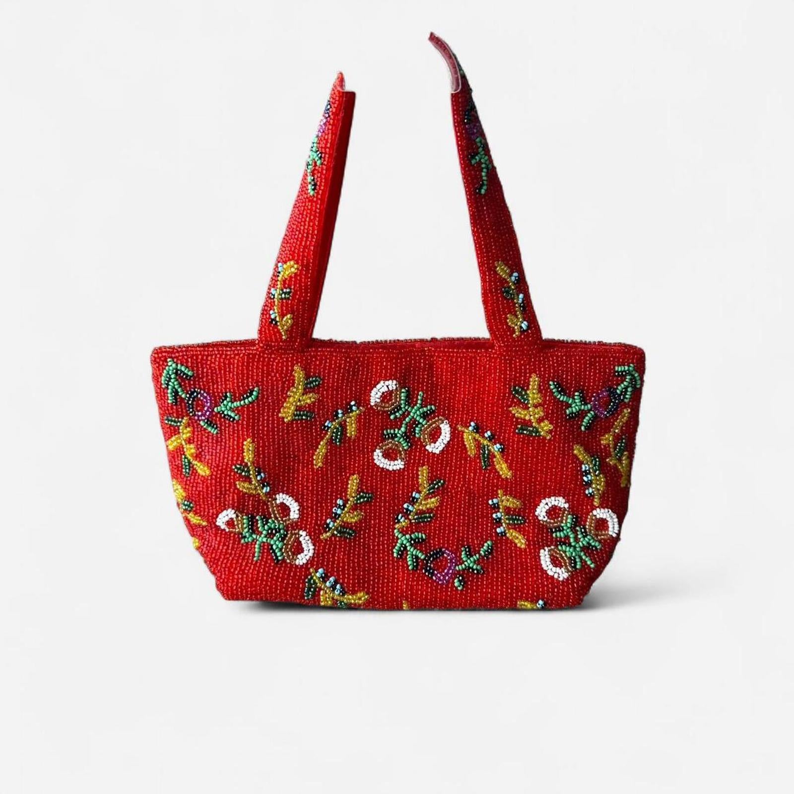 746. Red vintage beaded floral bag in perfect condition, never used. Not a bead missing - so adorable! Measurements are listed below.